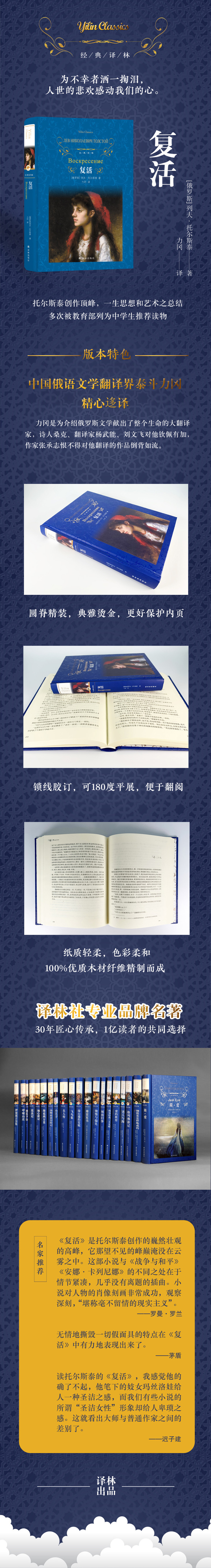 《复活》是俄国作家列夫?托尔斯泰创作的长篇小说,首次出版于1899年。该书取材于一件真实事件,主要描写男主人公聂赫留朵夫引诱姑妈家女仆玛丝洛娃,使她怀孕并被赶出家门。后来,她沦为妓女,因被指控谋财害命而受审判。男主人公以陪审员的身份出庭,见到从前被他引诱的女人,深受良心谴责。他为她奔走伸冤,并请求同她结婚,以赎回自己的罪过。上诉失败后,他陪她流放西伯利亚。他的行为感动了她,使她重新爱他。但为了不损害他的名誉和地位,她*终没有和他结婚而同一个革命者结为伉俪。《复活》是托尔斯泰*后一部长篇小说,是作家一生探索和思想的总结,被誉为俄国批判现实主义发展的高峰。小说通过玛丝洛娃的苦难遭遇和聂赫留朵夫的上诉经过,广泛而深刻地抨击了法庭、监狱、官僚机关的腐败、黑暗,揭露了封建统治阶级骄奢淫逸的生活和反动官吏的残暴昏庸、毫无人性,撕下了官办教会的伪善面纱,反映了农村的破产和农民的*贫困,勾画了一幅已经走到崩溃边缘的农奴制俄国的社会图画。《复活》多次被中国教育部列为中学生推荐读物。