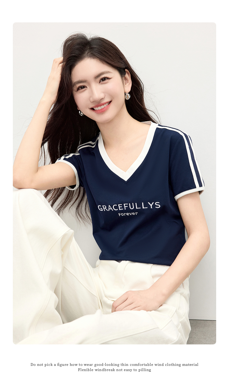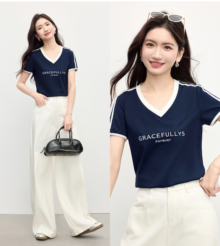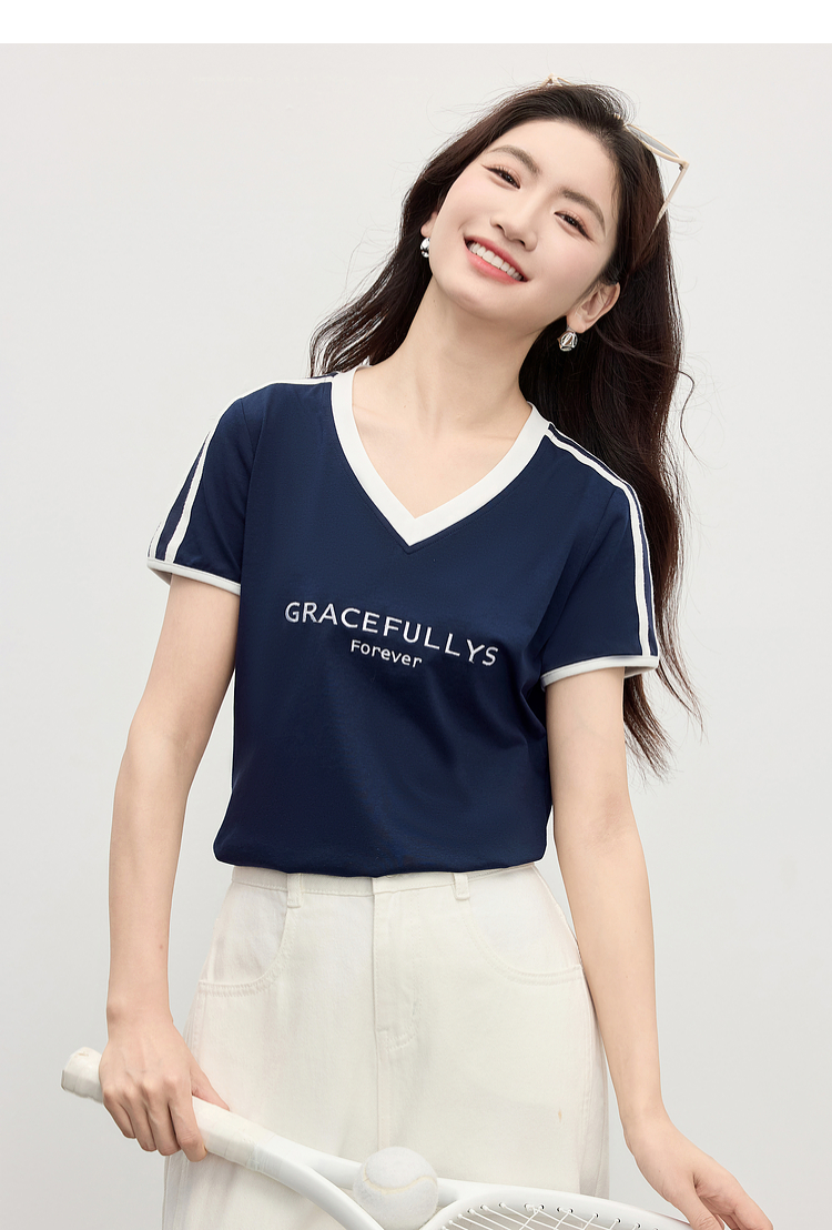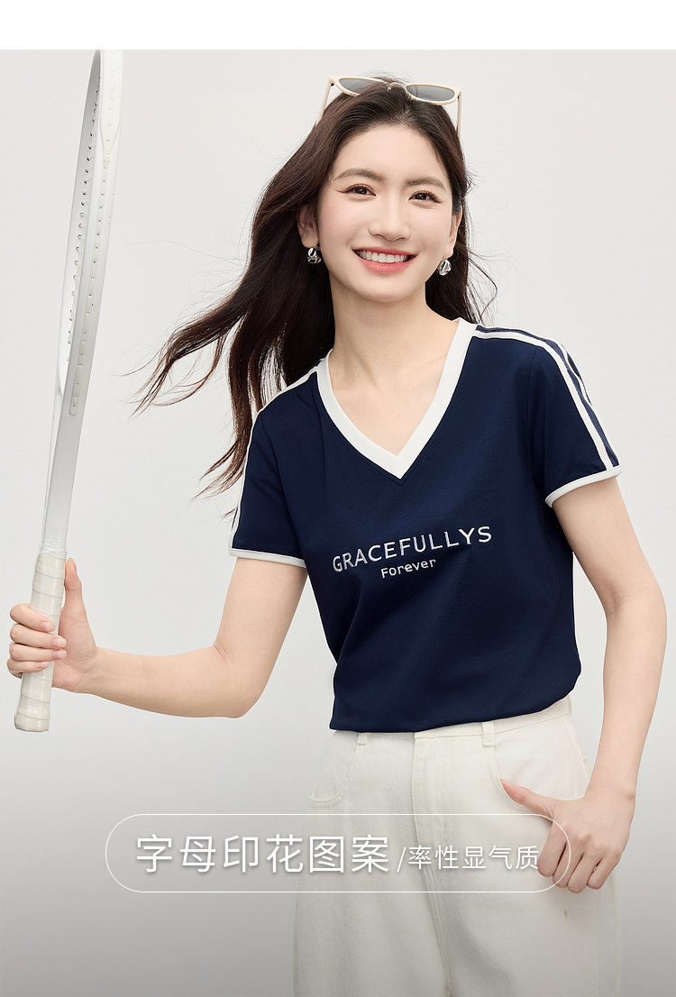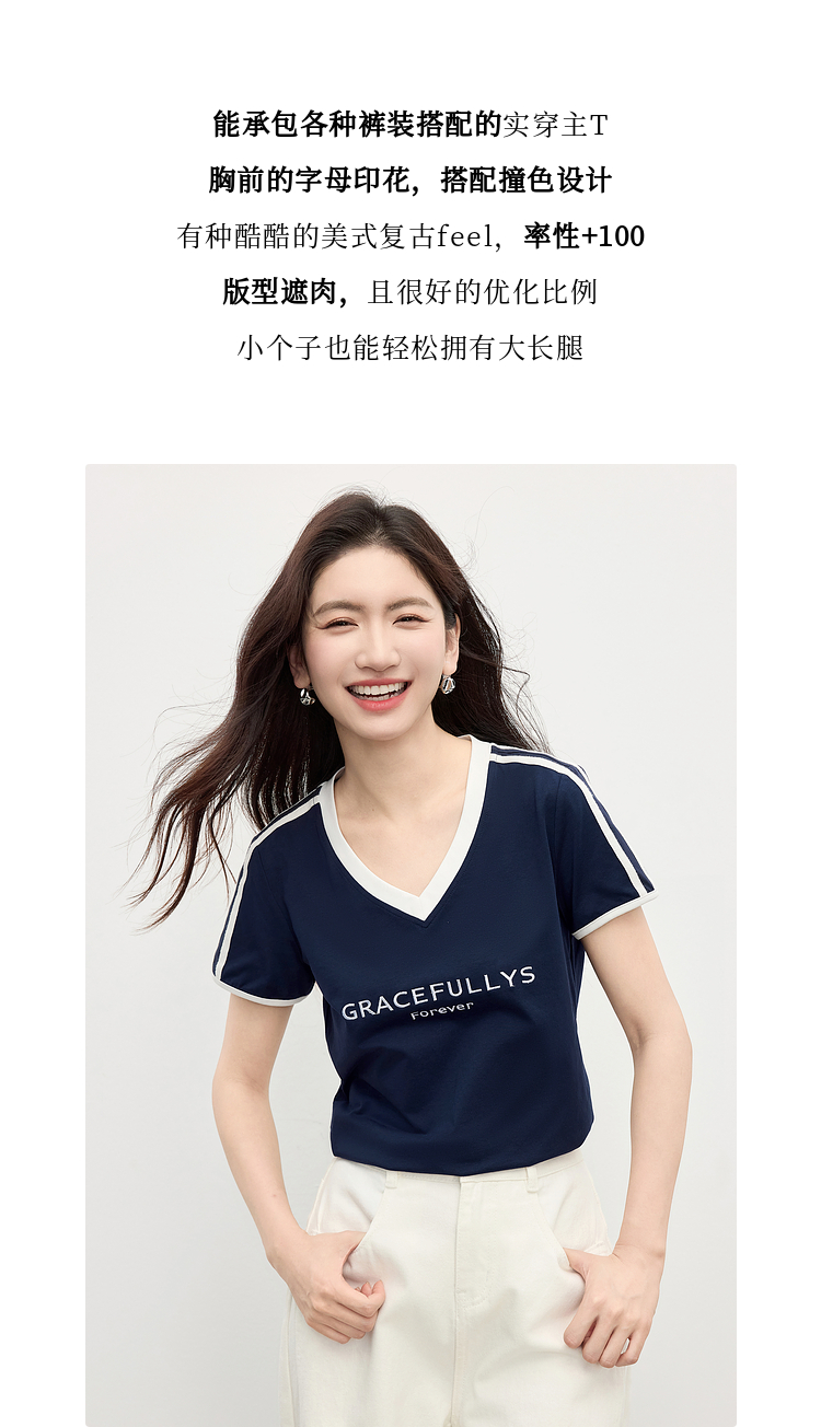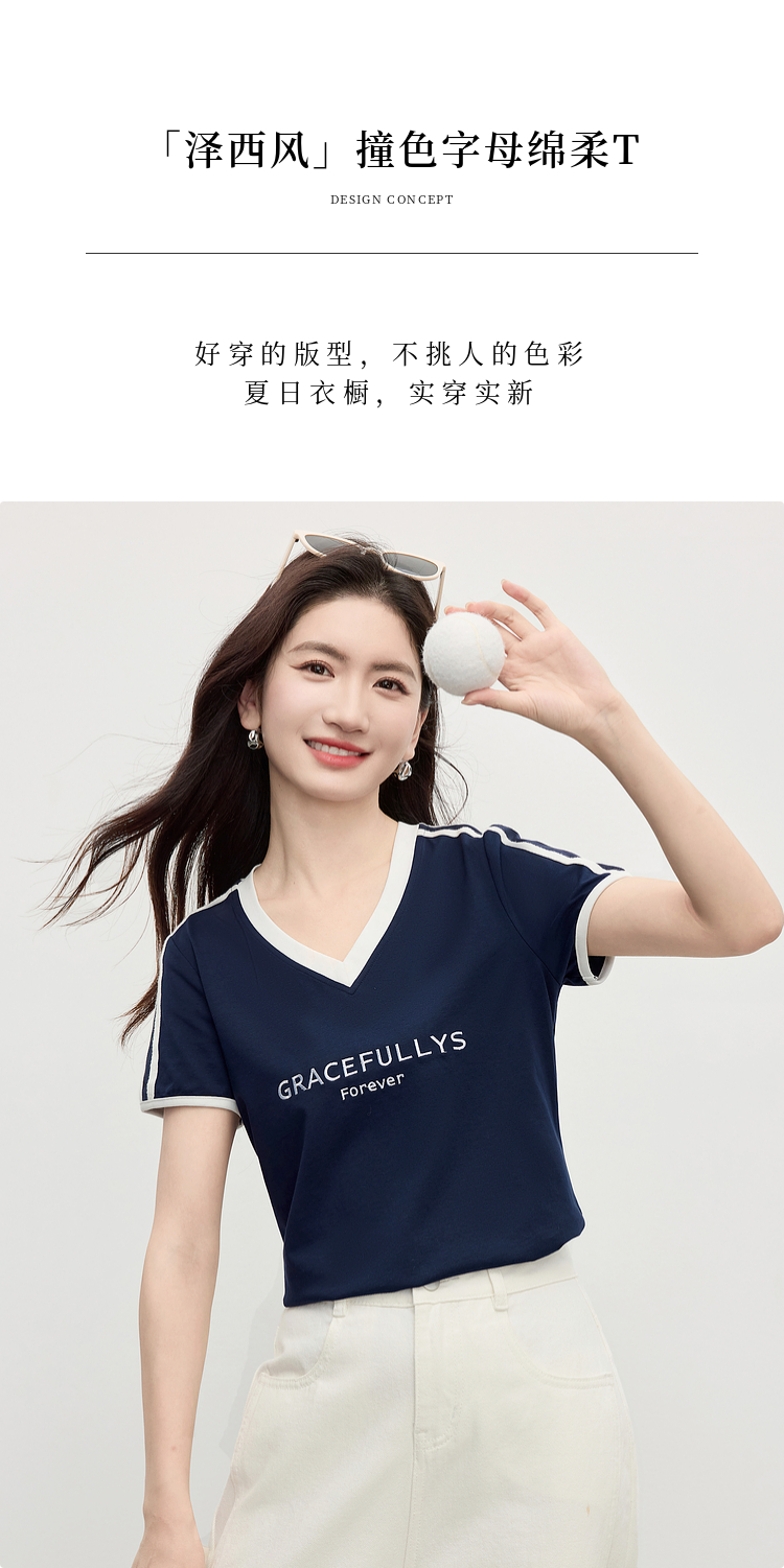 【07/16新品】熙世界美式运动风撞色字母V领T恤女短袖小个子正肩上衣2025夏新款