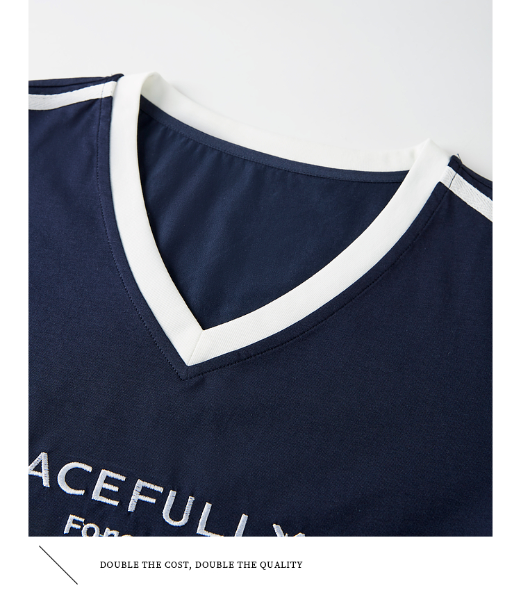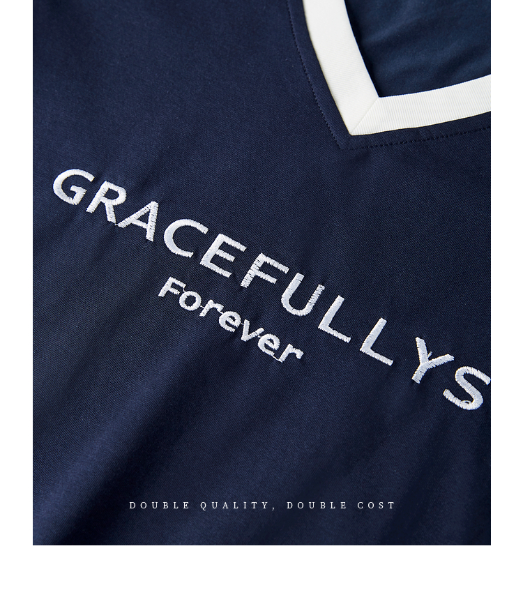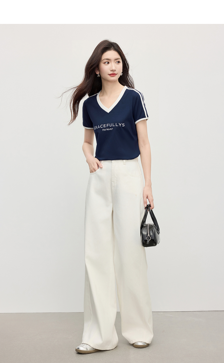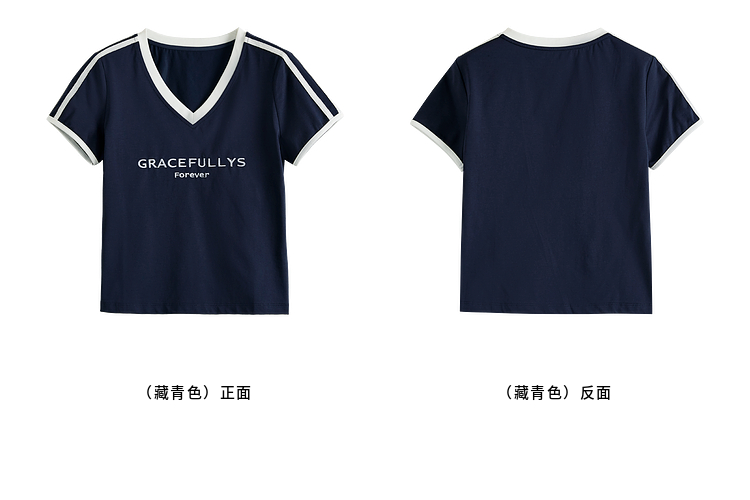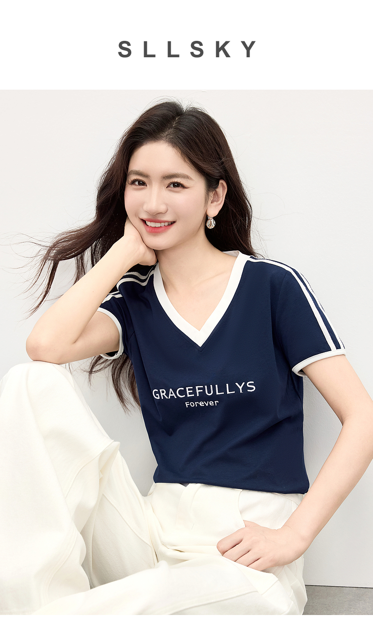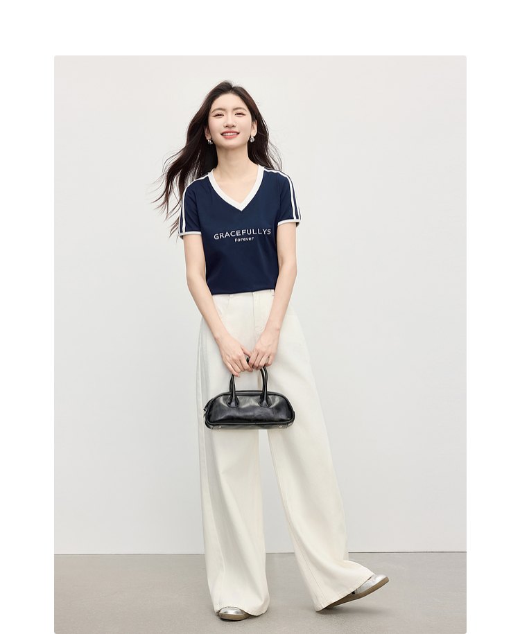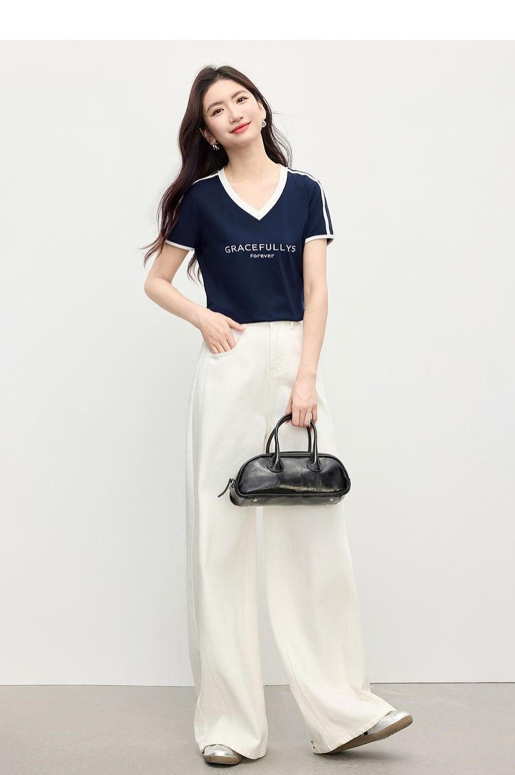 【07/16新品】熙世界美式运动风撞色字母V领T恤女短袖小个子正肩上衣2025夏新款