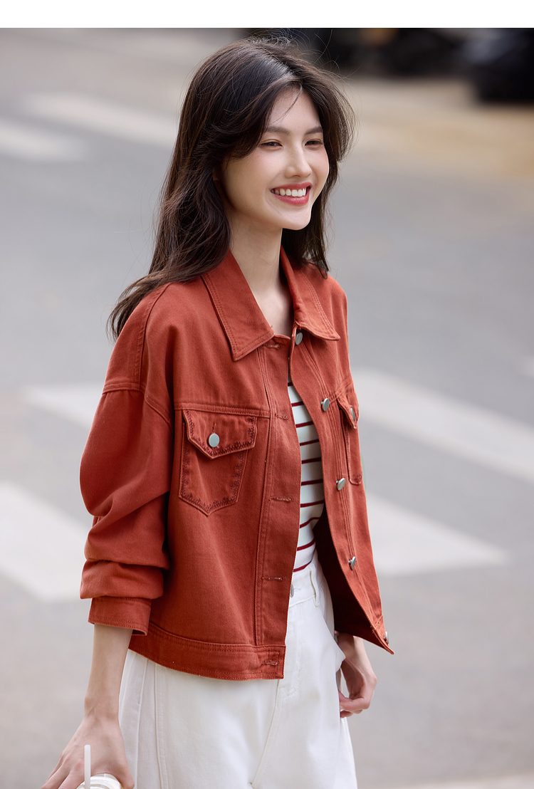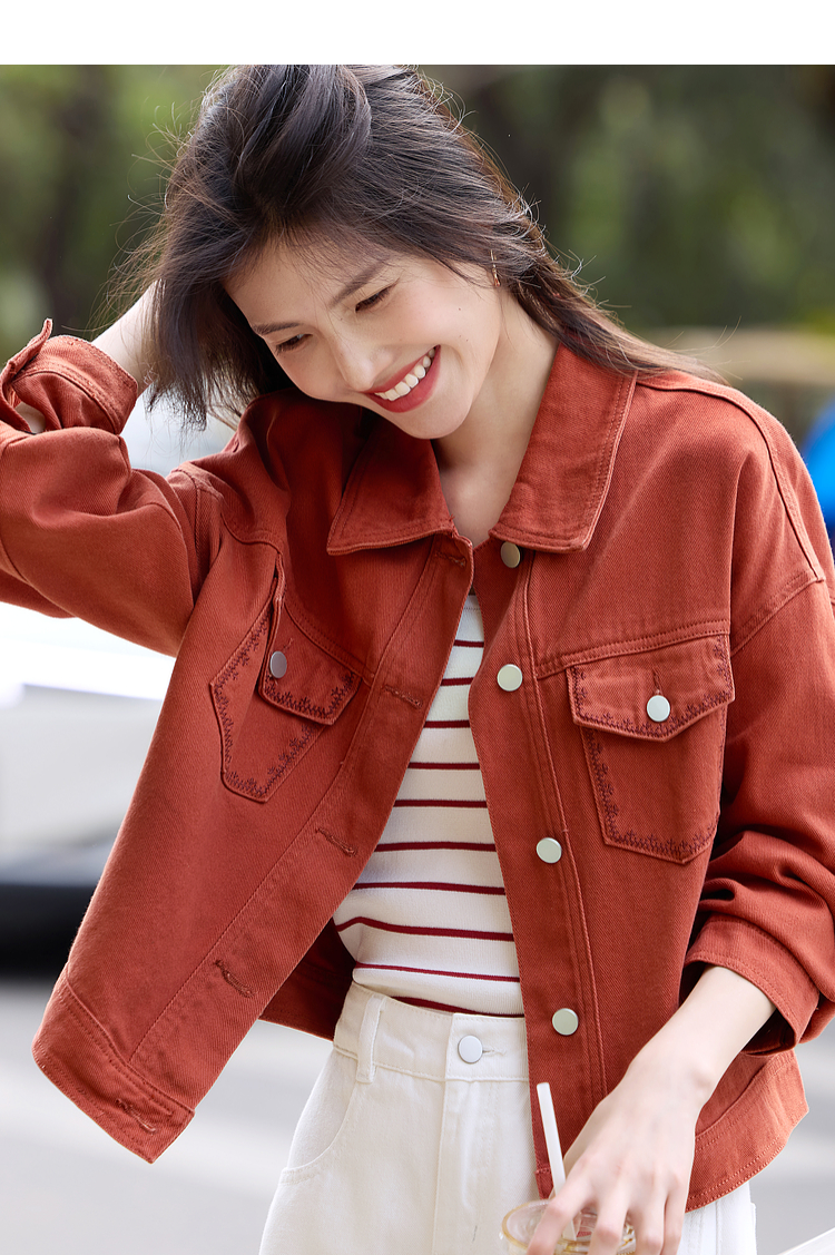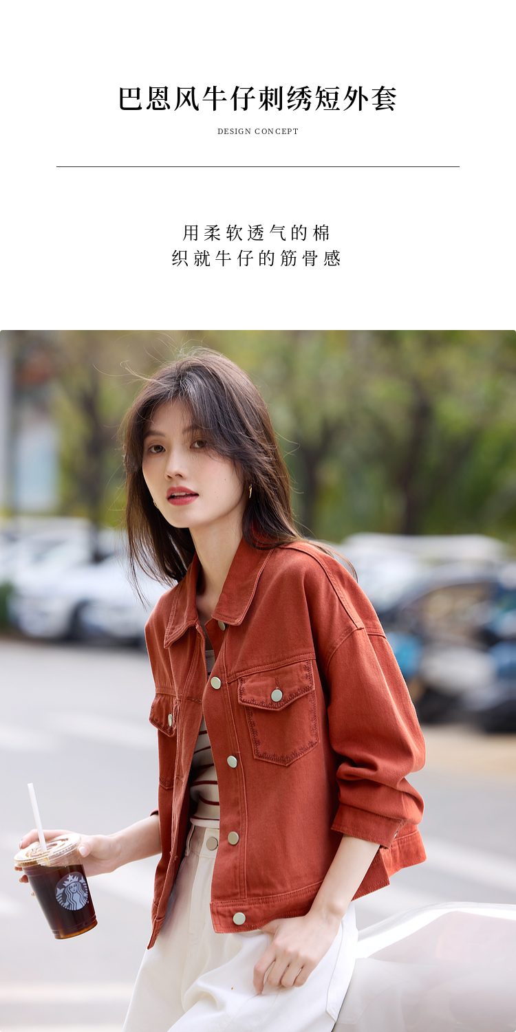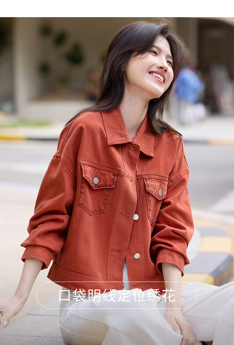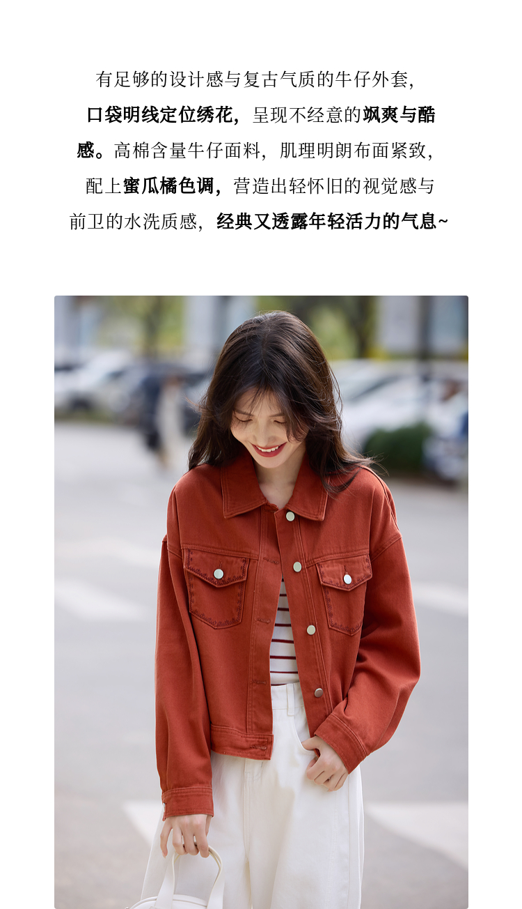 【年货节】熙世界巴恩风刺绣牛仔外套女短款小个子橘色夹克上衣2025春装新款