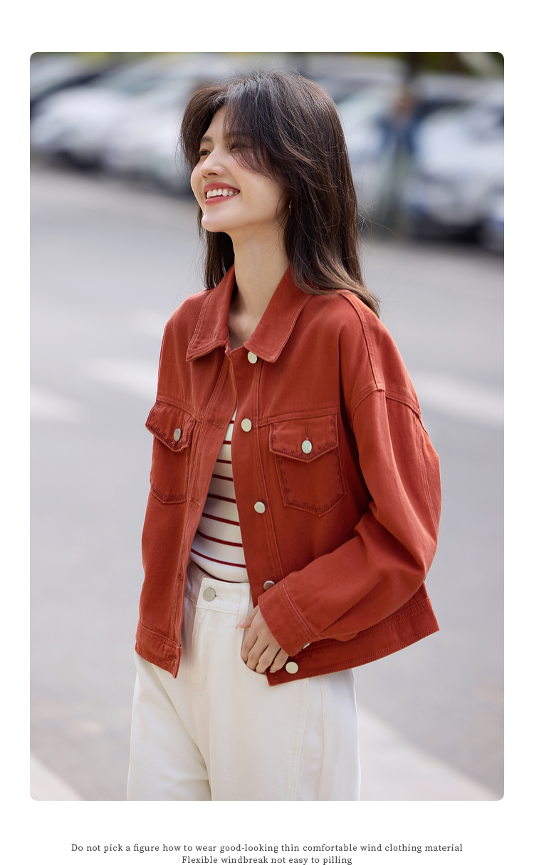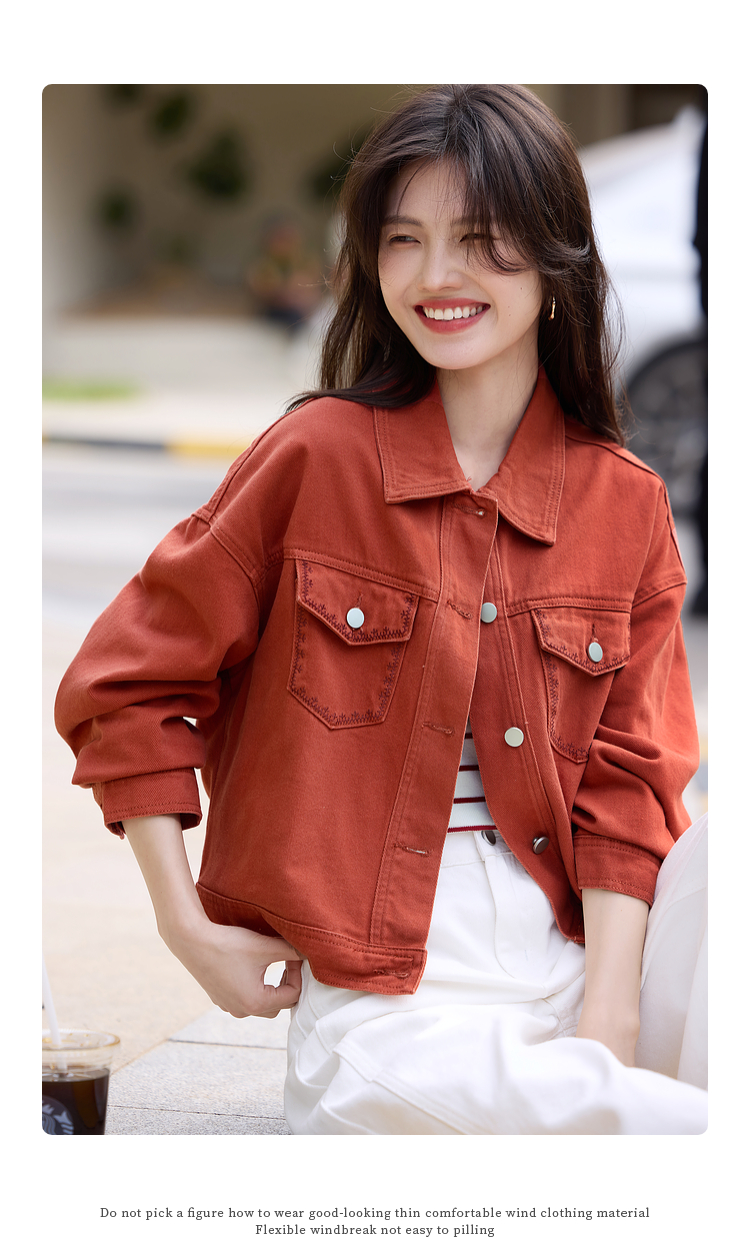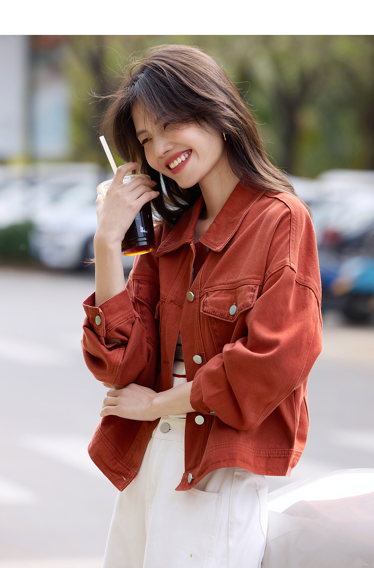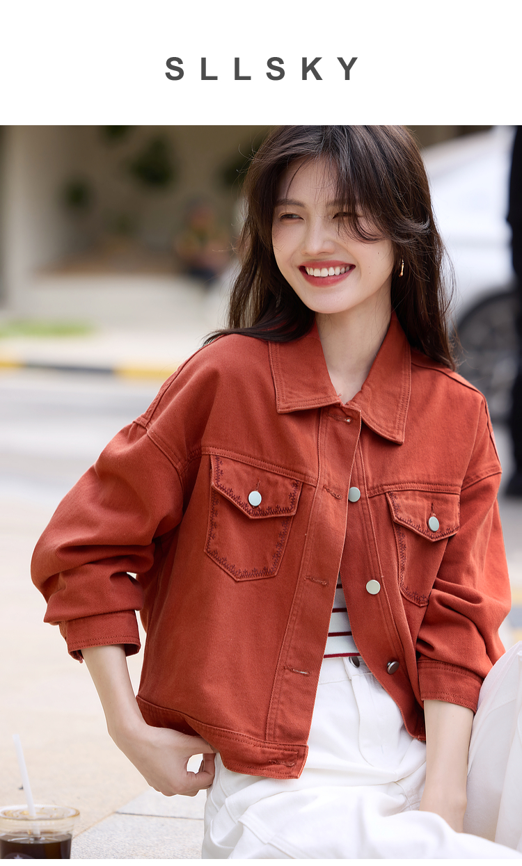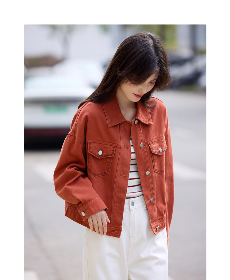 【年货节】熙世界巴恩风刺绣牛仔外套女短款小个子橘色夹克上衣2025春装新款