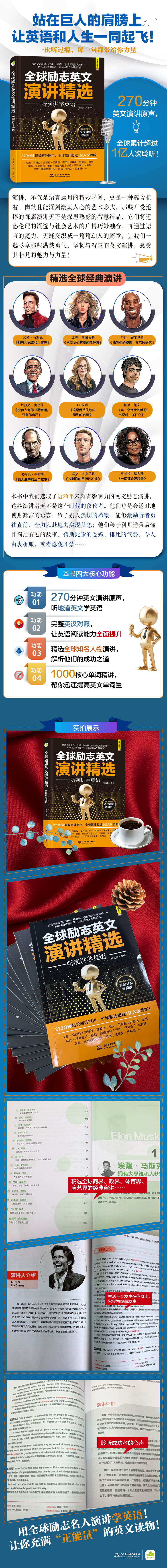 本书一本英汉对照的励志演讲集,精选了包括埃隆·马斯克、史蒂夫·乔布斯,J.K.罗琳和泰勒·斯威夫特等超过20位全球知名人士的演讲。这本书旨在通过展示这些杰出人物的思想和经历,帮助读者学习地道的英语,启迪心灵,激发内在潜力。每一段演讲都是对坚持与挑战的深刻反思,向我们证明了只要有决心和毅力,无论面对何种困难,成功终将到来。希望本书能成为读者人生旅途中的一盏明灯,使读者无论身处何方,都能找到前行的勇气和灵感,勇敢追求梦想,实现自我超越。
