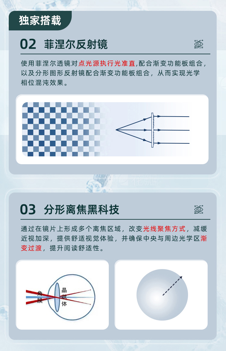 镀膜工艺对非平面镜(菲尼尔镜片,分形振列离焦镜片)会产生轻微点状或线状痕迹,此现象均属正常。