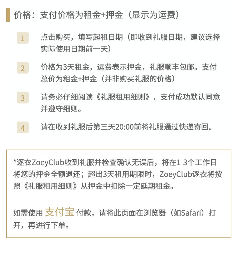 运费 价格实际是 押金 价格,礼服顺丰包邮。礼服归还并质检合格后,押金全额退还。悦己会籍免押金。
