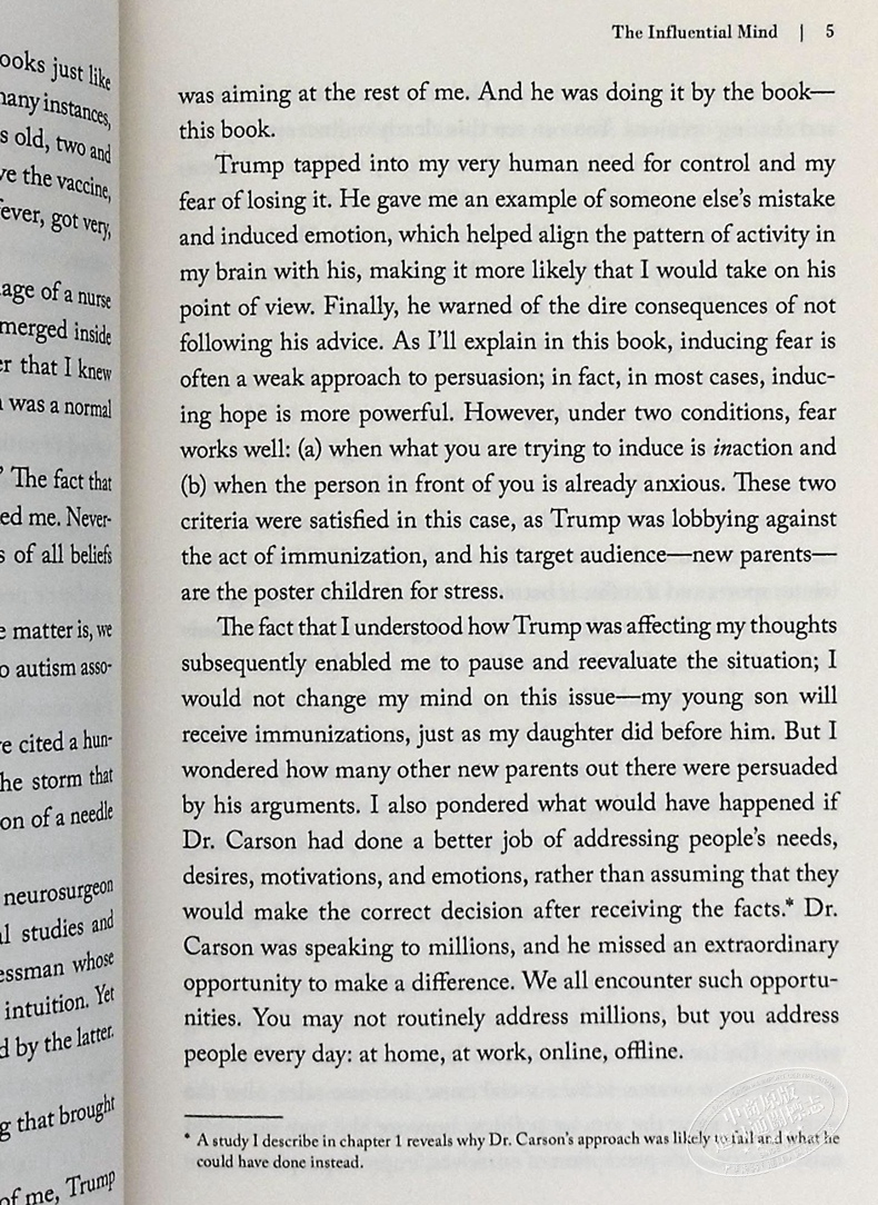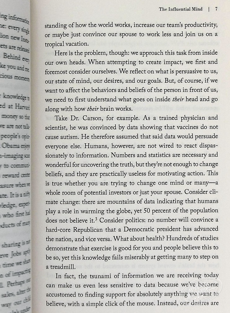 本书作者塔利·沙罗特曾致力于在实验室研究人类的行为,力图弄明白人类究竟如何被影响及影响他人,本书则是作者及其团队关于思维、影响力与大脑神认知等研究主题智慧的结晶。书中每一章会集中讨论七大关键要素中的一项——先验、情感、动机、自主性、好奇心、心态以及他人,并辅以大量轻松有趣且具有说服力的实验或实例加以佐证。