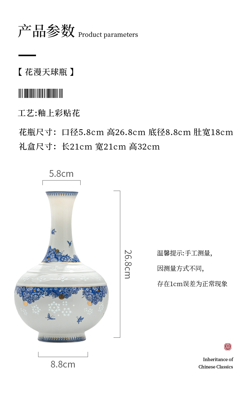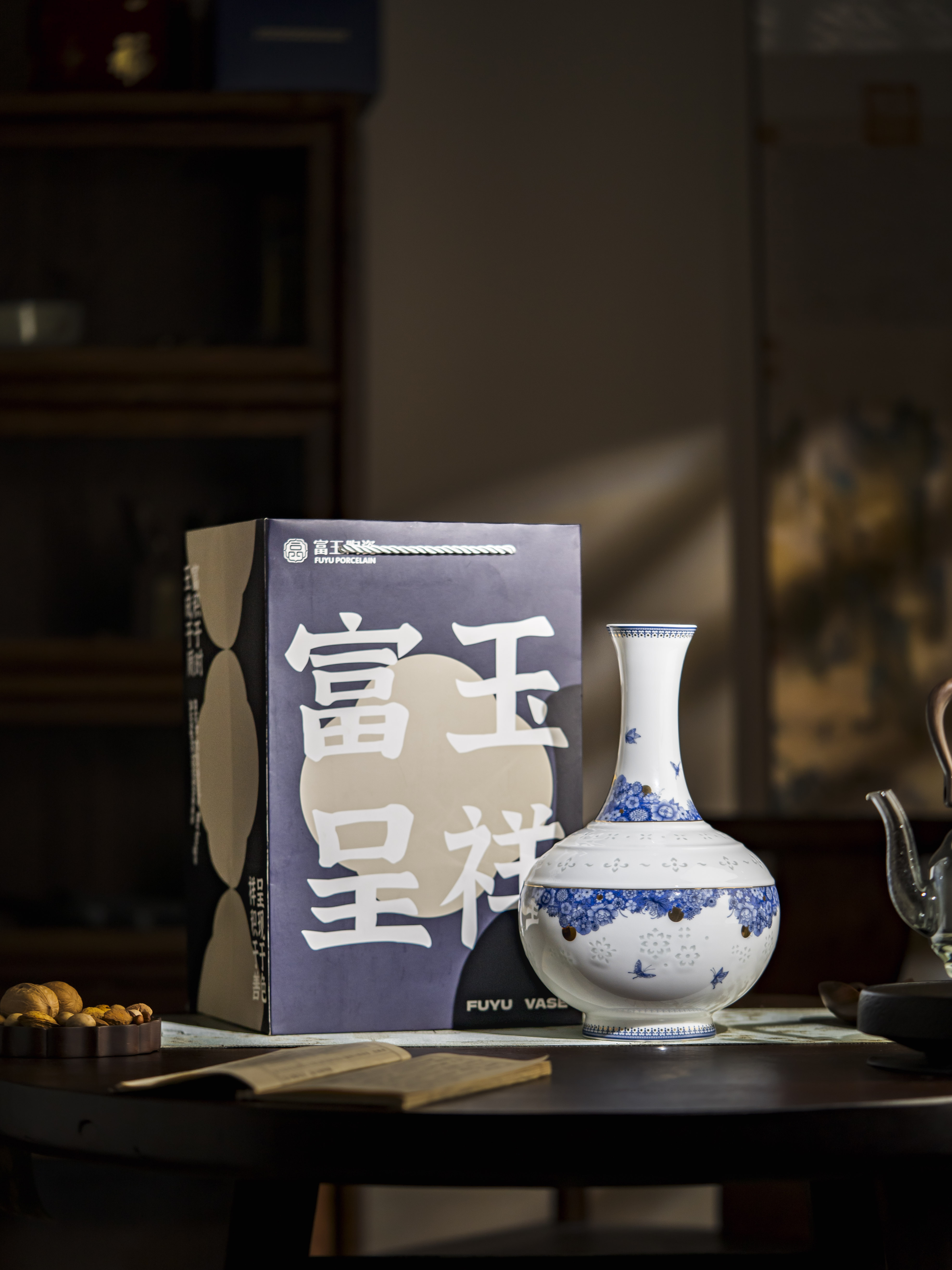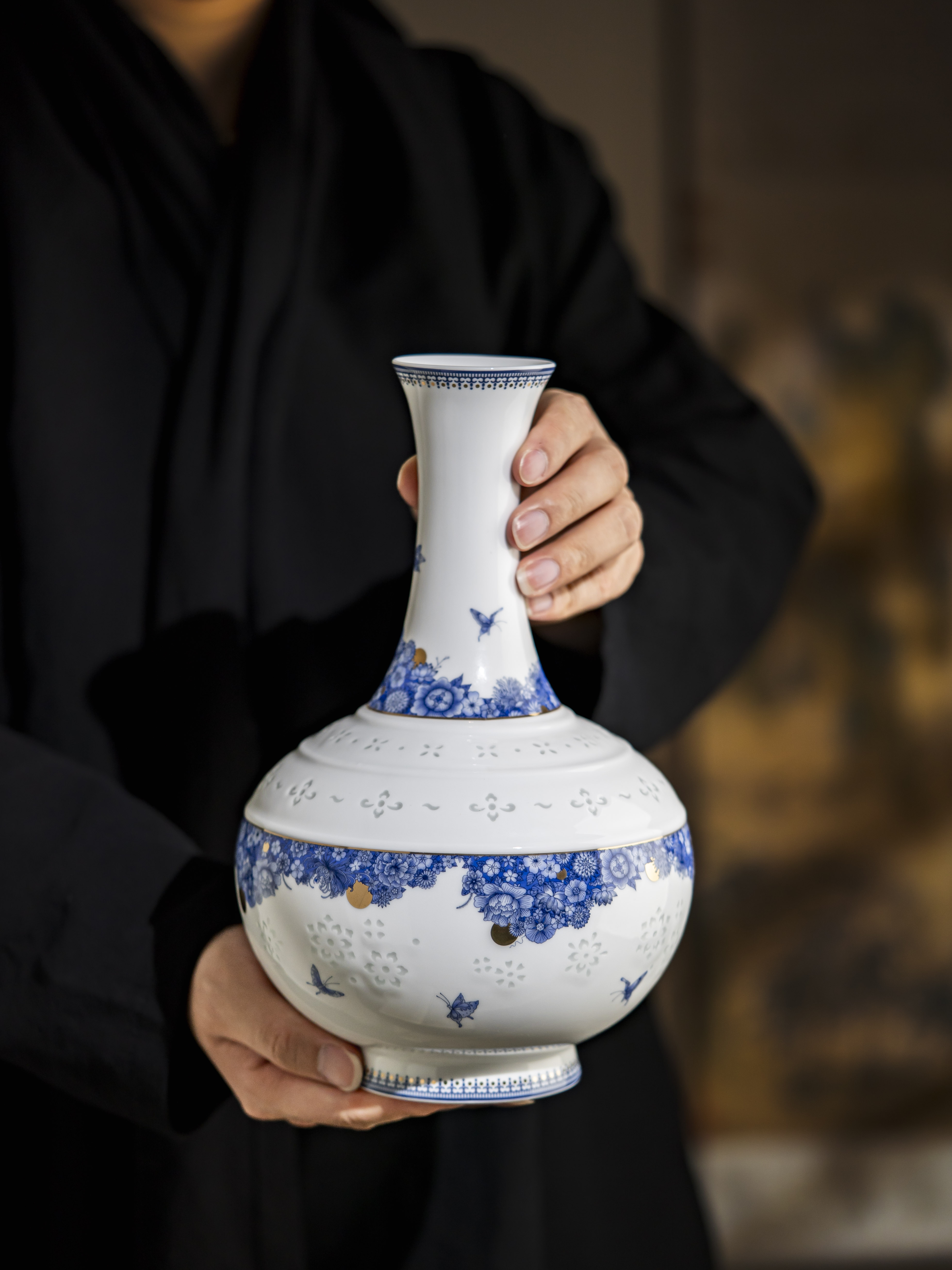 新品 | 富玉景德镇陶瓷花瓶中式青花玲珑客厅插花高档家居摆件花漫天球瓶