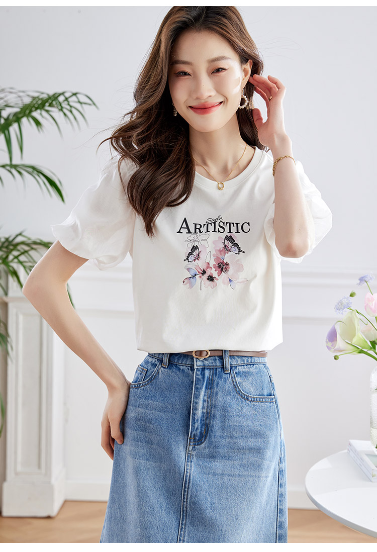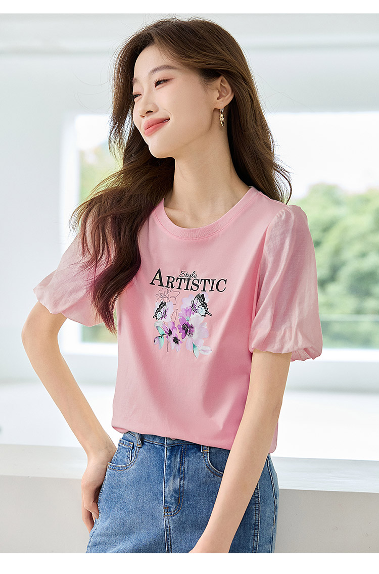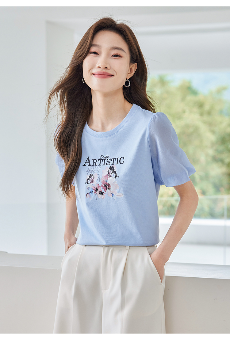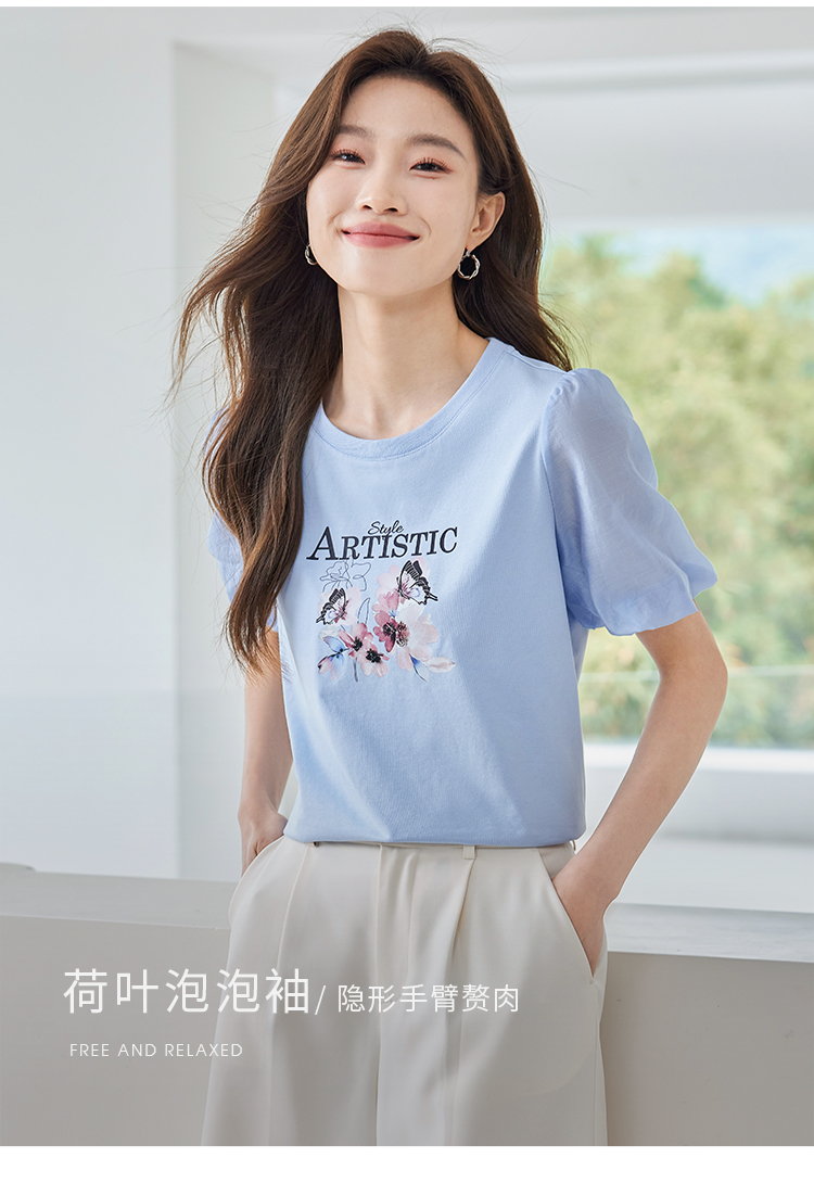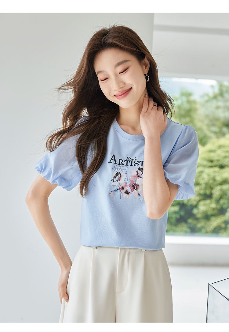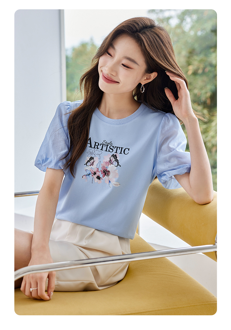 【专属特价】熙世界甜美减龄蝴蝶字母印花T恤宽松泡泡袖别致上衣2025夏新款