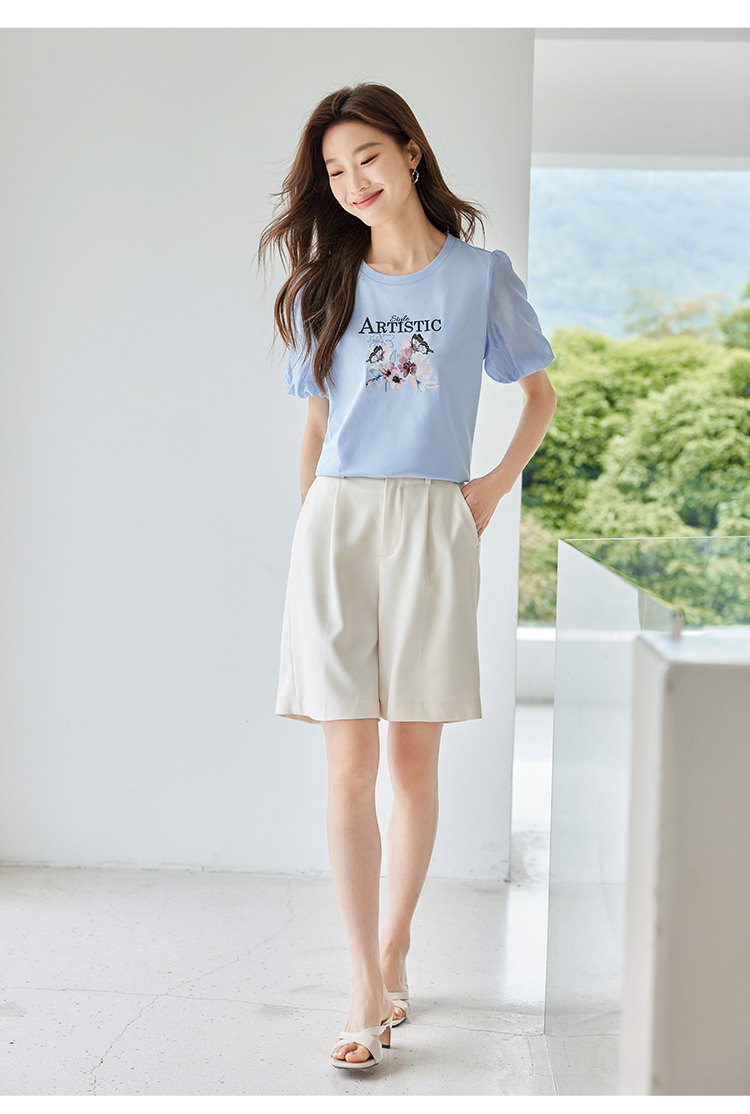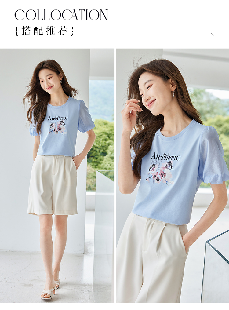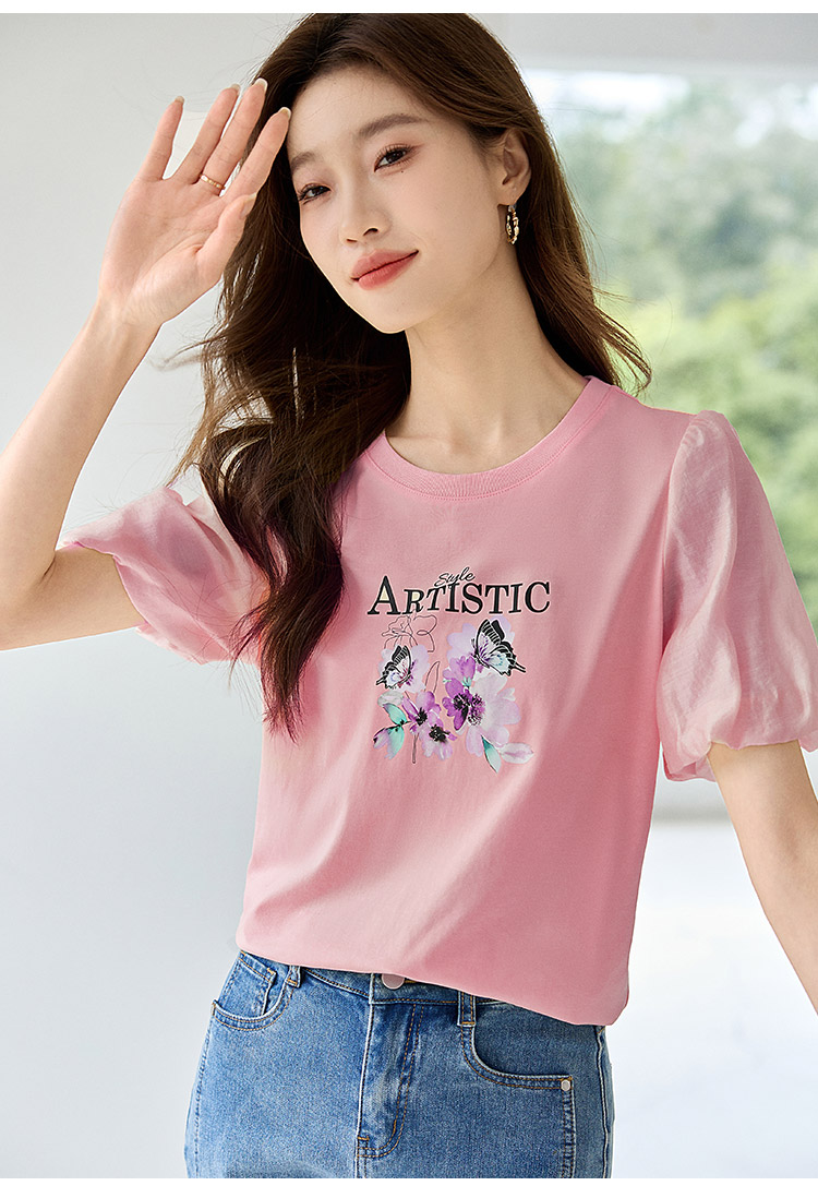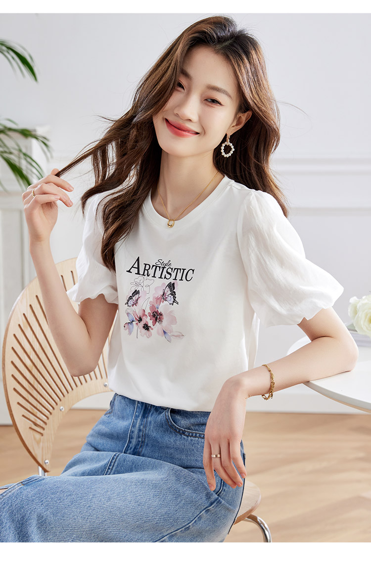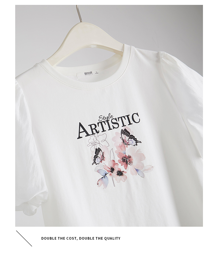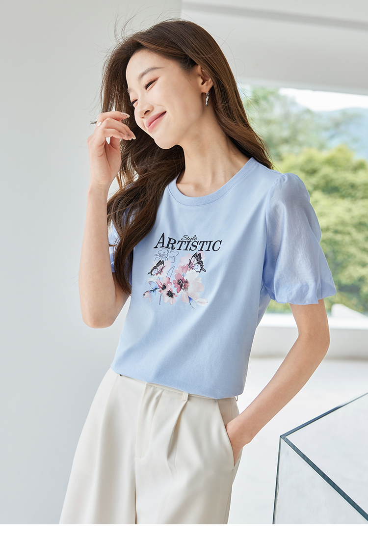 【专属特价】熙世界甜美减龄蝴蝶字母印花T恤宽松泡泡袖别致上衣2025夏新款