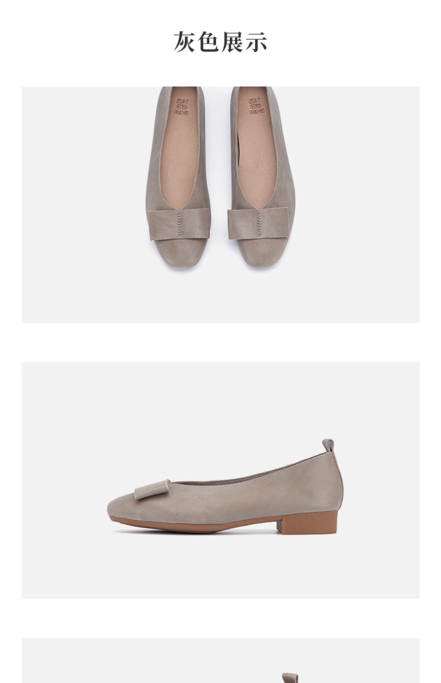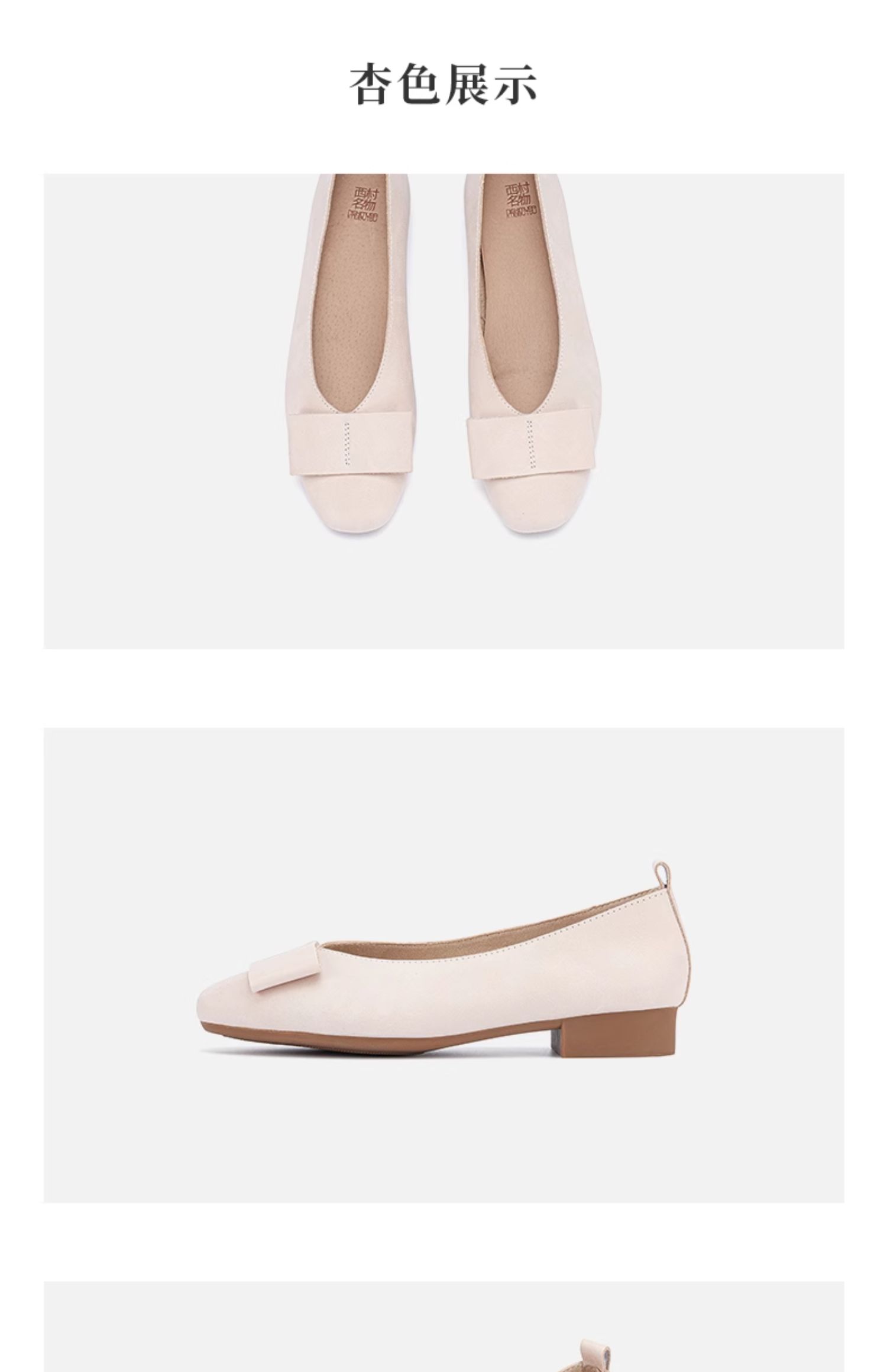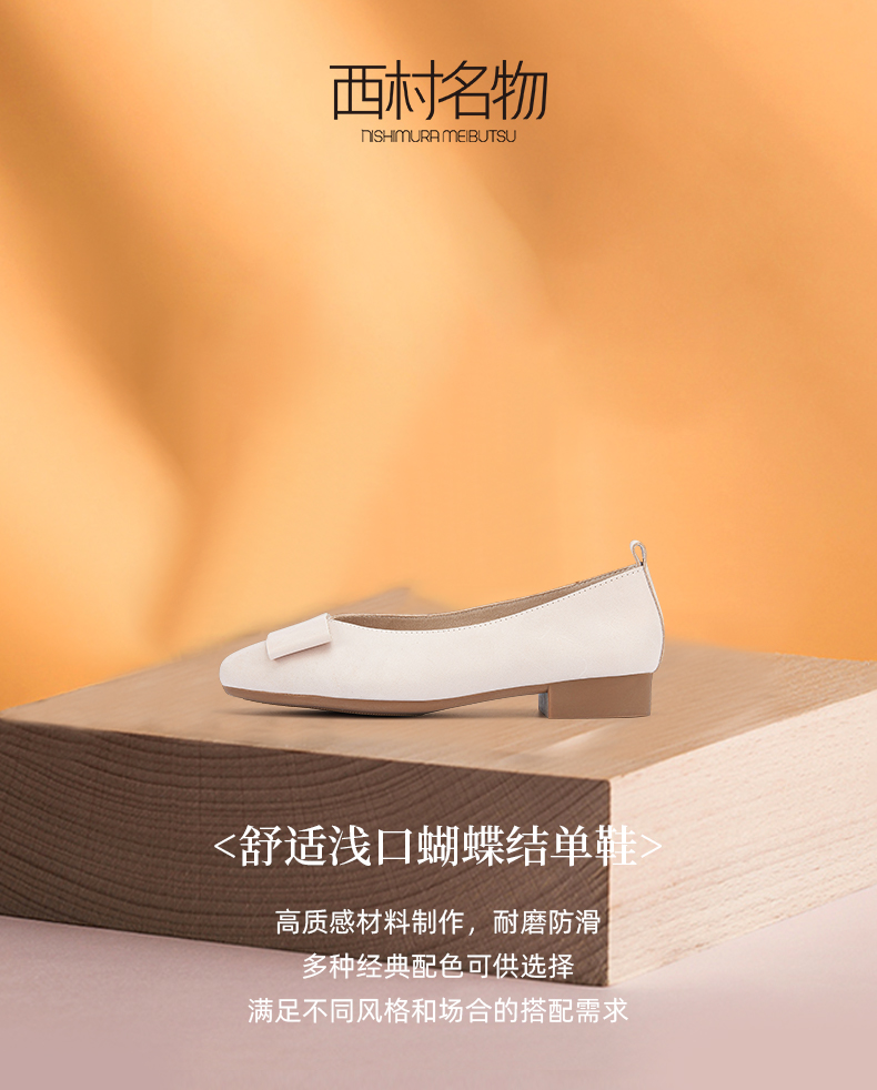 西村名物2024春季新款平底舒适浅口蝴蝶结真皮单鞋粗跟皮鞋X24AE10401