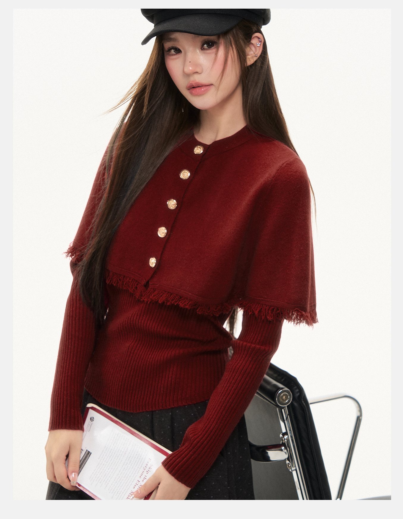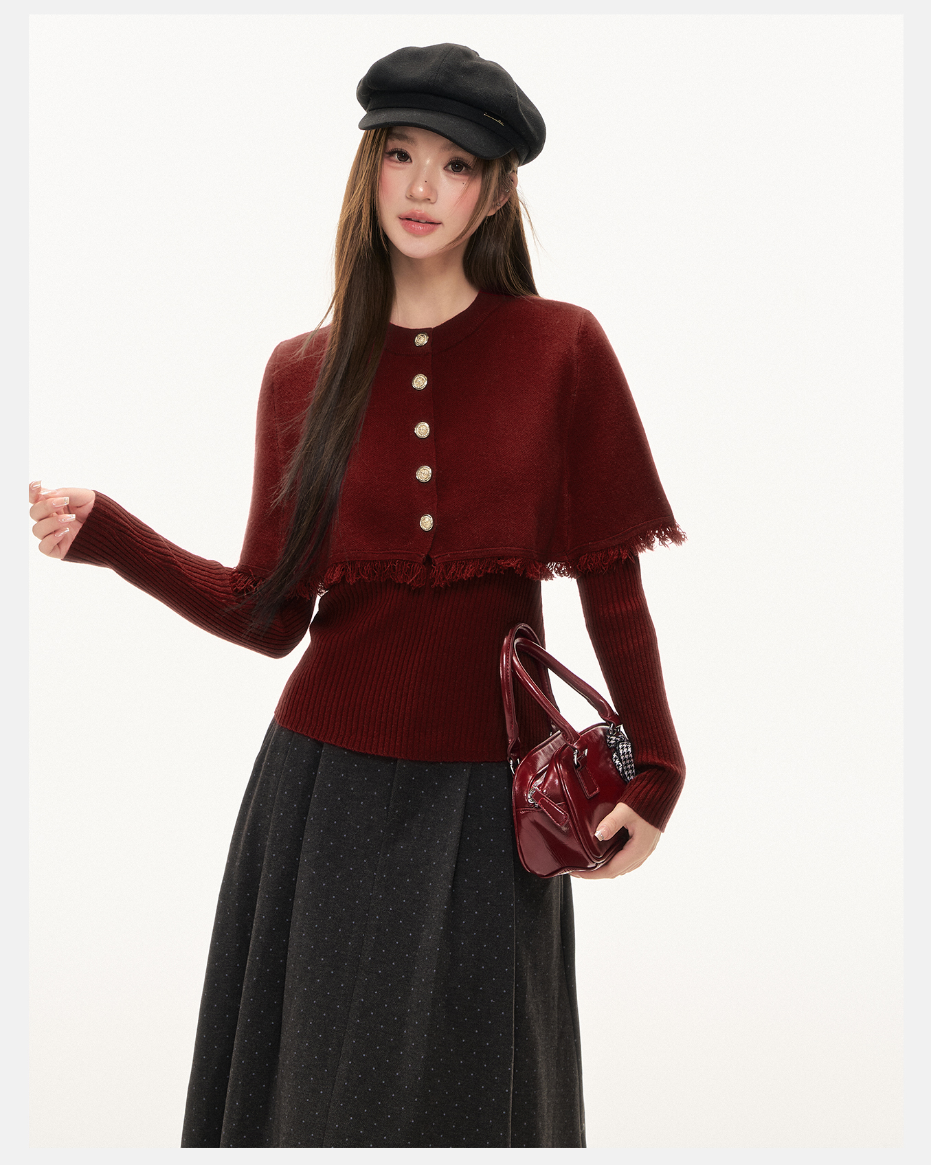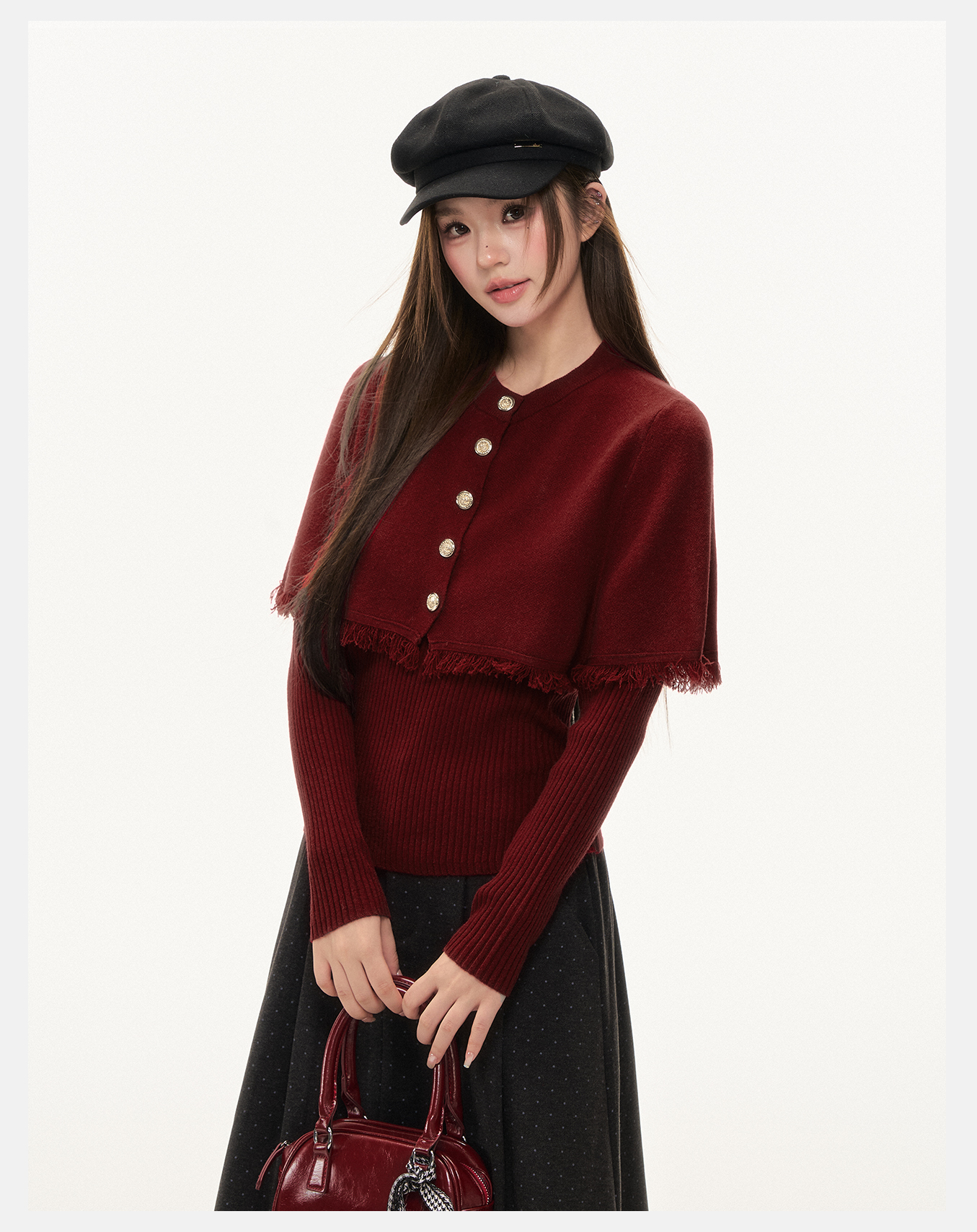 P&X设计师女装2025冬季斗篷毛针织衫两件套上衣825415096 红色