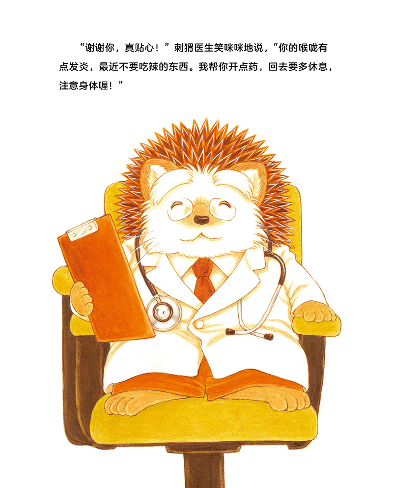 图画书的魅力在于文字与图画相互交融、相互依存,让读者感受更丰富的故事情感。本书用文字故事让我们了解到刺猬医生是一个非常有爱心负责任的医生,同时也是一位体谅病人的医生。他开的蜂蜜味的水果糖药让小熊宝宝开心,他打针让狼先生放心,他缝好小熊猫玩偶缓解兔子小姐的担