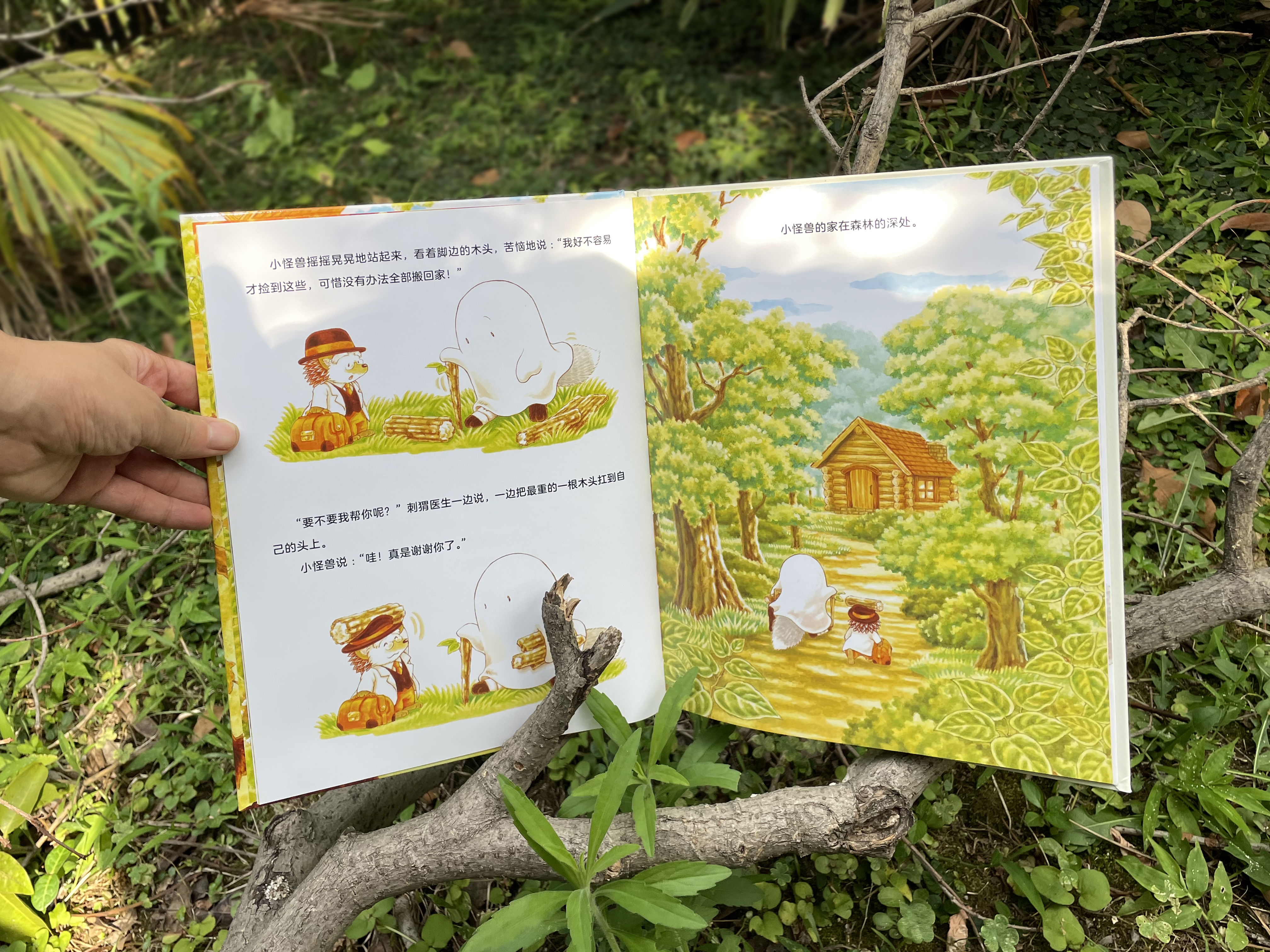 和一般医院冷冰冰的白色调不同,福泽由美子创作的绘本《刺猬医生》,整本书采用了暖黄的底色,这让森林里的医院看起来很温馨。在这座森林医院里,有一位刺猬医生专为身体不舒服的动物服务。小熊第一次进医院,在他的想象中医生是一个比自己大许多倍的大妖怪,恐惧害怕占据着小熊的心。但当熊妈妈和小熊推开门诊室的大门时,看到的却是小小的办公台和小小的办公椅上坐着小小的刺猬医生,和病人坐的大大的椅子形成鲜明的对比。靠墙的桌架子上并排放置着5个小小的刺猬玩偶和文件柜上的
