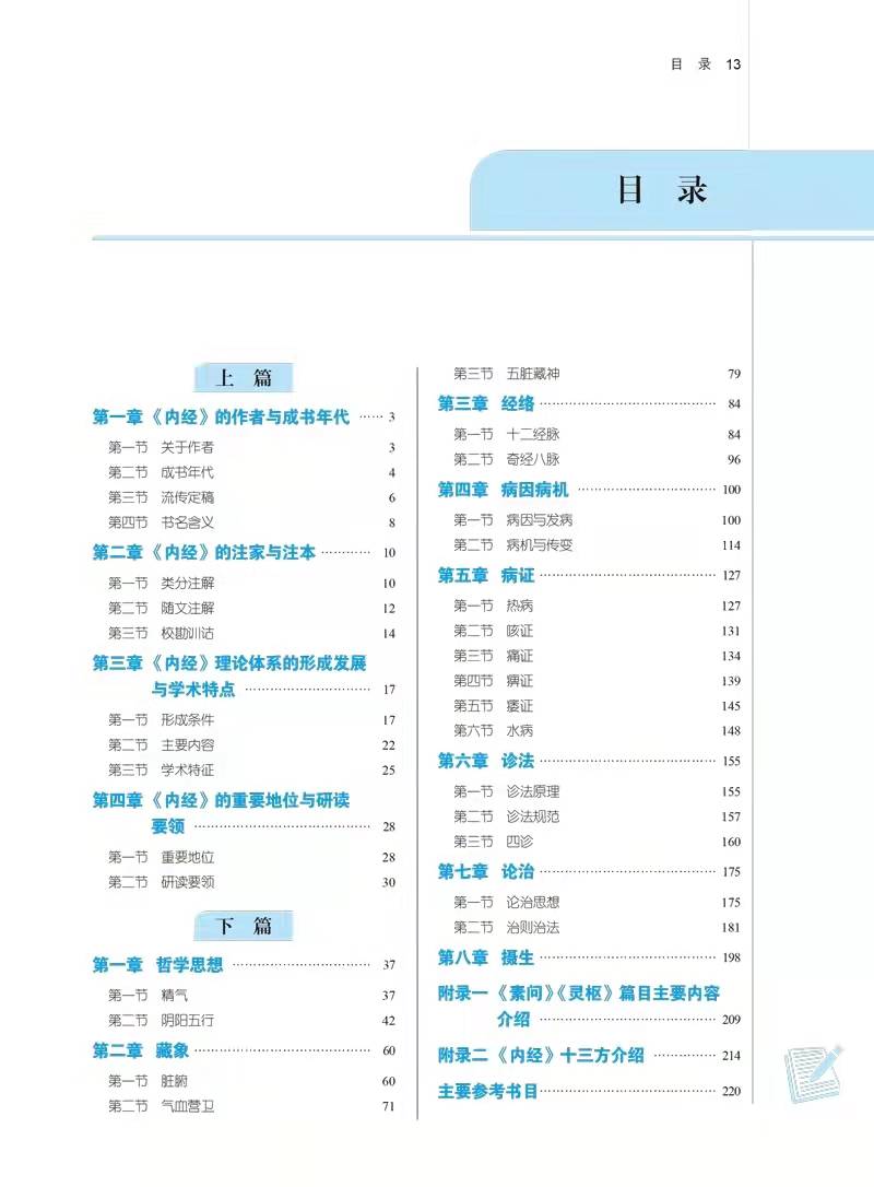 本教材共分两部分:上篇主要介绍《内经》的基本情况与注家注本,概述《内经》理论体系,强调《内经》研读指南;下篇按《内经》理论体系的主要内容并结合类分注解《内经》的相关成果,同时考虑到教学实际需求,分为哲学思想、藏象、经络、病因病机、病证、诊法、论治、养生八章,并精选《内经》相应篇章原文,予以顺序编号,加以校注、按语,展现《内经》理论内涵及临床运用,促进理论与实践结合,突出中医思维的培养、了解医学理论的源流。
