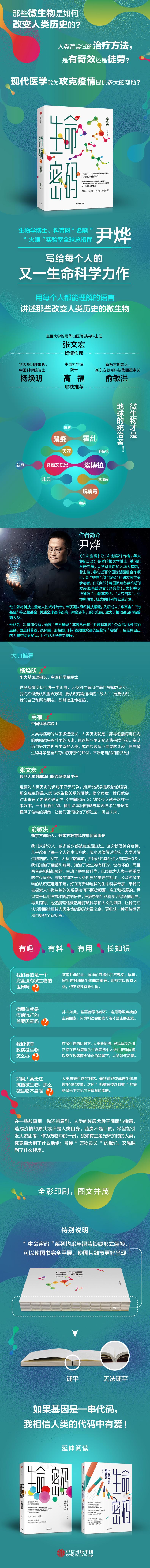 如果基因是一串代码,我相信人类的代码中有爱!2020年注定载入医学史册。在西班牙流感暴发百年之后,又一场席卷世界的传染性疾病让全球人民为之不安。本书以时间为主线,梳理并收录了12种给人类造成很大影响甚至可以说改变人类历史的微生物。它们都曾在历史上留下“辉煌战绩”,时至今日仍是人类的噩梦。作者尹烨站在全人类的角度,通过对这些曾改变人类历史的微生物的科普,给人类提出一个发人深省的问题:当疫情来袭,我们理所当然地将解决问题的重担压在科学家、医务工作者等专业人士的身上,而逃避自己同样作为地球人应该承担的责任,忘记了人类其实休戚与共。在科普病毒与细菌带来的巨大影响的同时,作者也试图唤醒当下的人们:面对疫情威胁,没有人能置身事外,没有人是绝对安全的。微生物才是地球之王,人类应该更加谦卑地对待自然。地球可以没有人类,人类却不能没有地球。