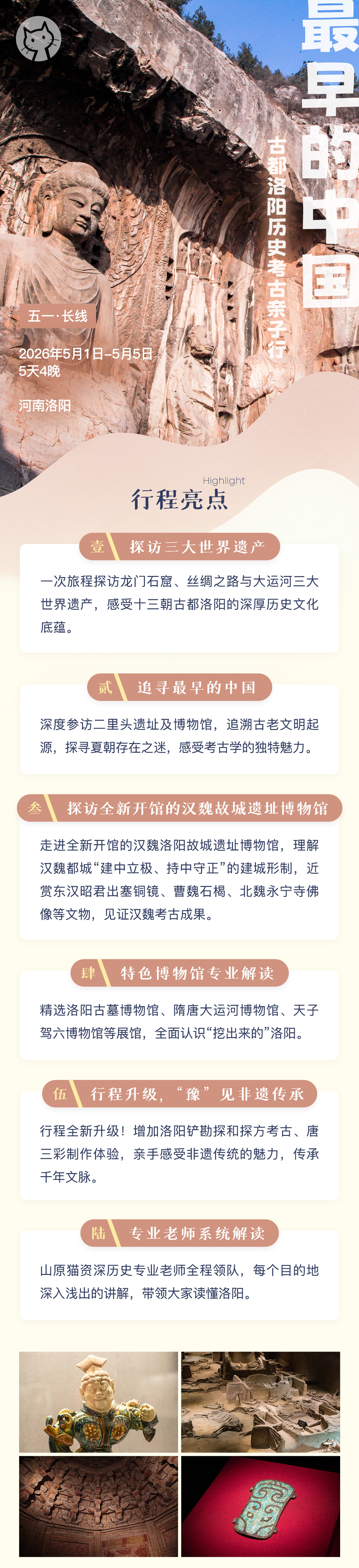 十三朝古都洛阳是大小朋友了解中国古代历史的重要一站,洛阳历史考古行作为山原猫经典人文线之一,已有上百位小朋友和我们一道走进古都。往期小朋友们跟随专业老师走进博物馆,亲历遗址现场,或梳理笔记、或参与考古现场、或探索发问,用各自擅长的方式记录下对“最早的中国”的理解,将旅行见闻转化为文化内核。