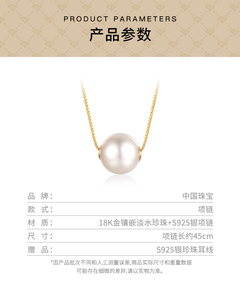 【七夕礼遇 珠宝首饰美妆组合】中国珠宝18K金镶珍珠项链限时赠送珍珠耳线1对+珀莱雅小球藻保湿面膜20片!