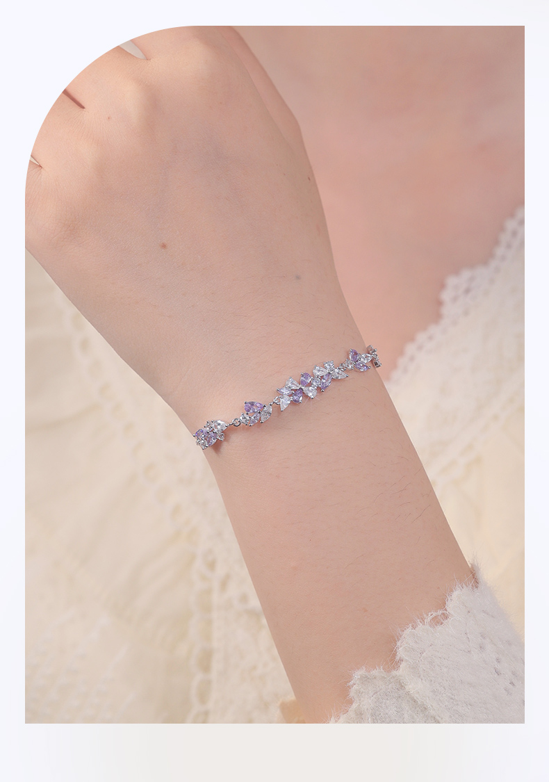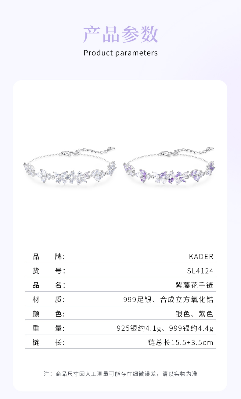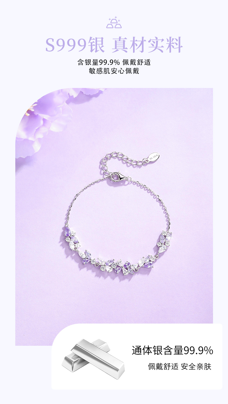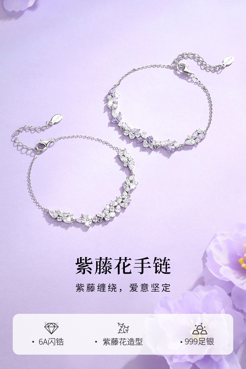 卡蒂罗KADER 紫藤花开手链 999足银/925银 满镶闪锆微笑花环在逃公主浪漫好运配饰 甜美大气璀璨银河 手链 女款 银色 礼盒款