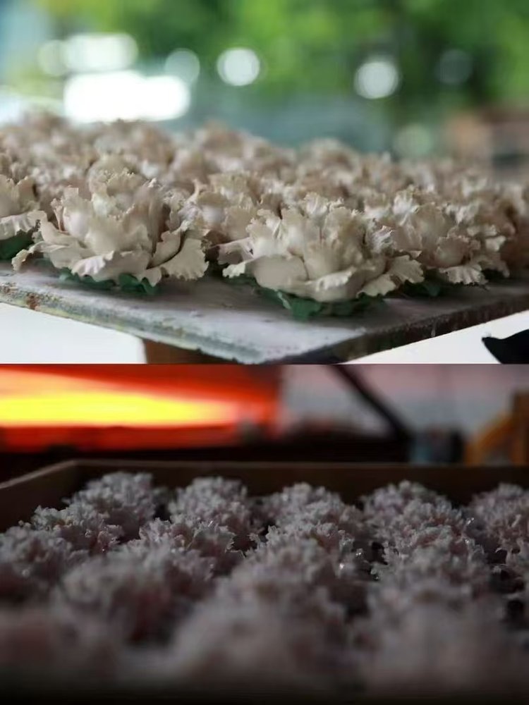 呈白瓷花由三十年经验的非遗匠人,串联起80+瓷泥花瓣构成一朵掌心大小的花经过一千三百八十度的高温淬炼,最终成为我们所见到的瓷花。
