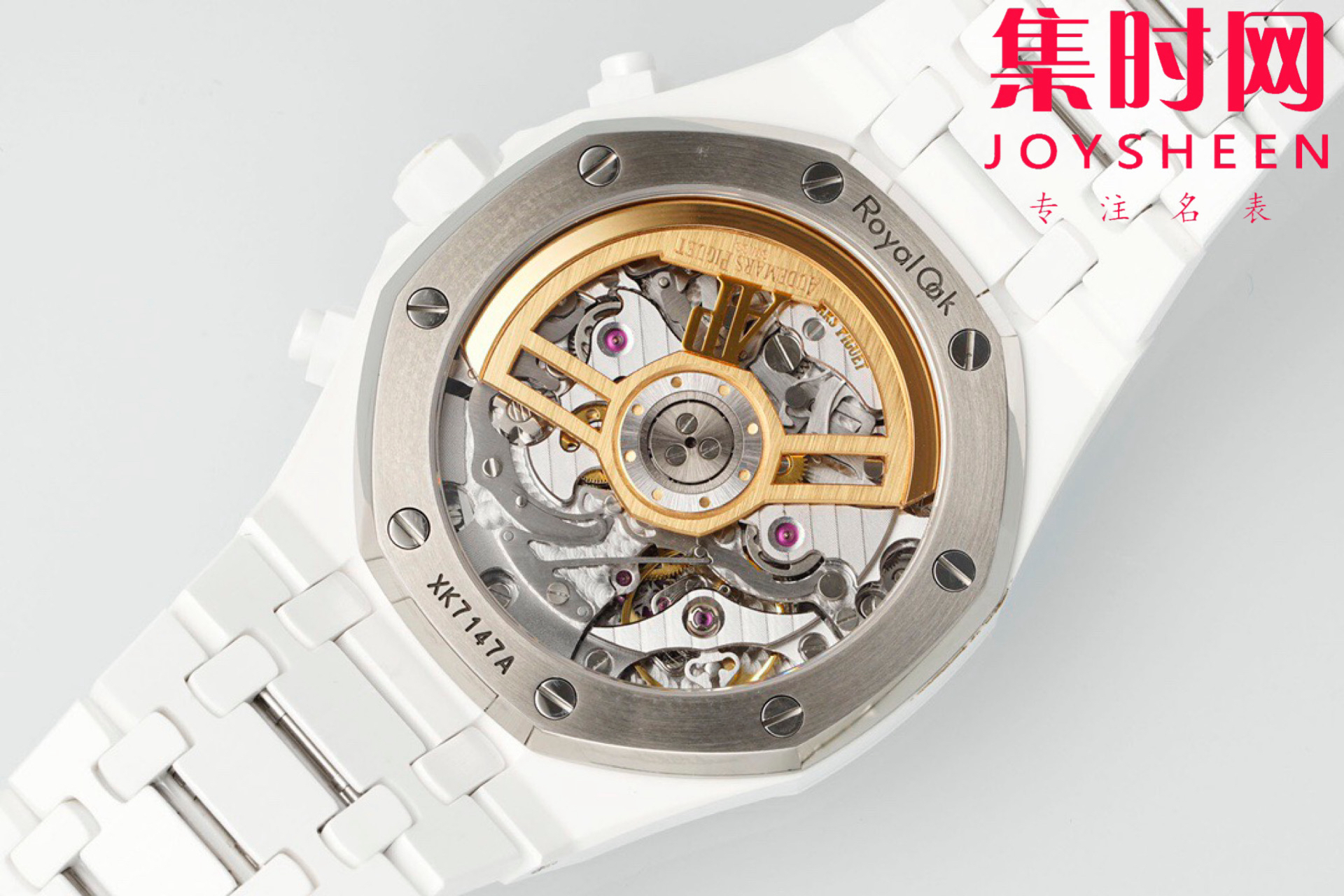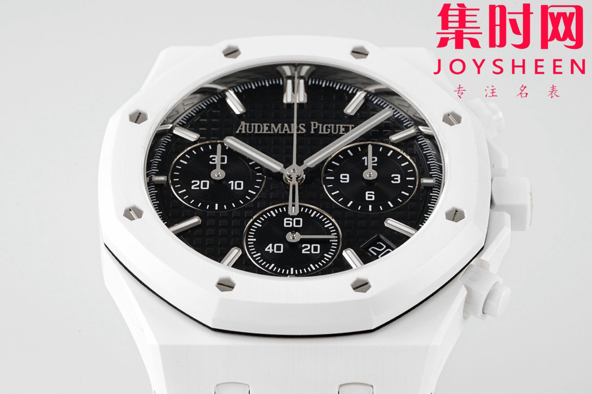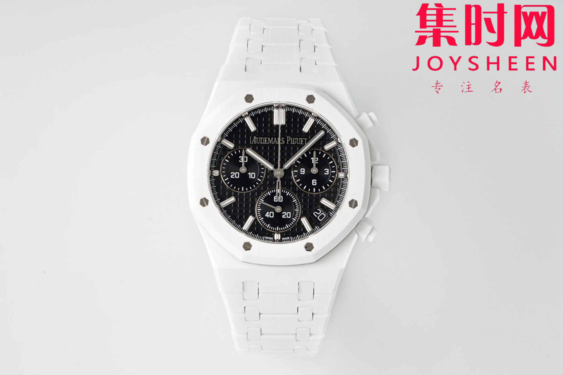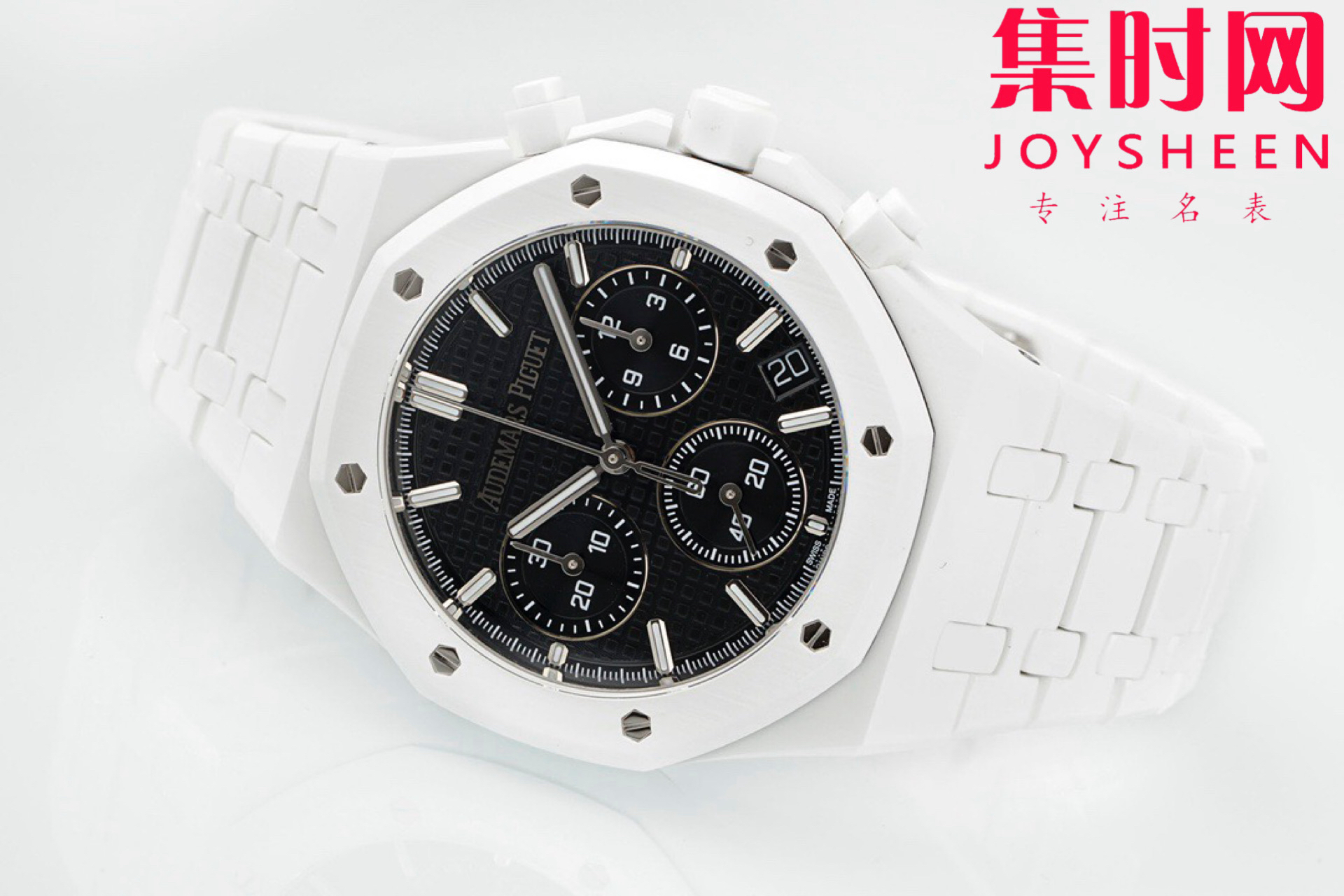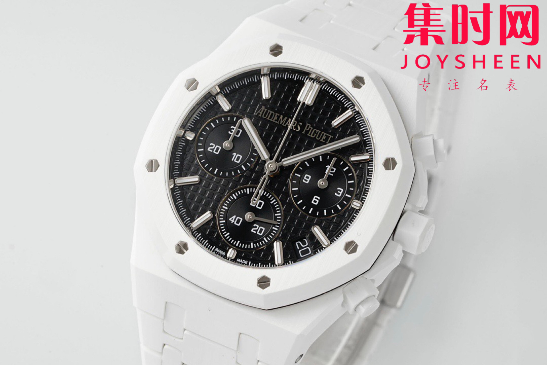 新品爱彼 APS皇家橡树26240陶瓷系列 白陶瓷 男士腕表 4401一体机 是一款41毫米精钢自动上链计时码表,搭载APS开发自研Calibre 4401一体自动上链机芯,具备飞返计时、小时/分钟/小秒显示及日期功能。其标志性八角形表圈配以八颗六角螺丝,搭配"Grande Tapisserie"大型格纹表盘,层次感鲜明。一体式精钢表链延续了1972年首款皇家橡树的经典设计,兼具运动与优雅。全新开发一体机芯采用导柱轮与垂直离合结构,振频28,800次/小时,与原版完全一致,动力储存约70小时,防水深度50米。AP融合高级制表工艺与前卫美学,是奢华运动腕表的典范之作。