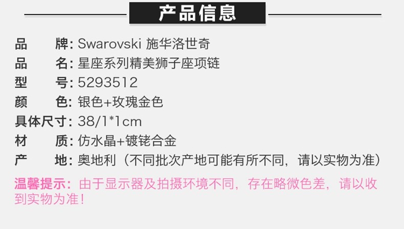 SWAROVSKI/施华洛世奇 星座系列精美狮子座项链 5293512JPY带授权招加盟代理