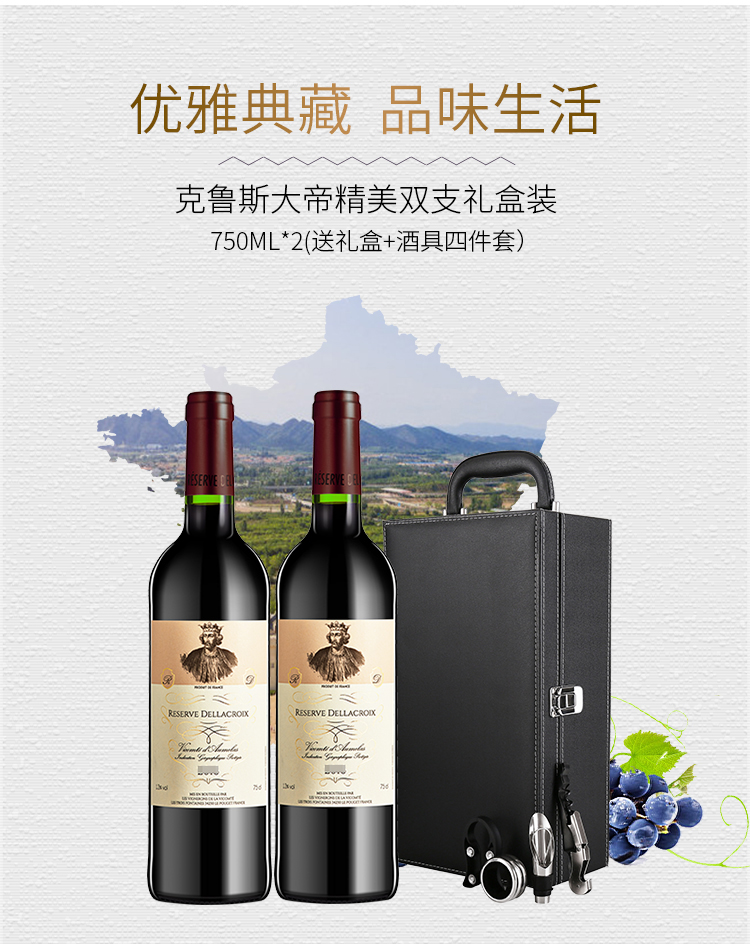 法国进口红酒 克鲁斯大帝干红葡萄酒双支礼盒装带酒具 750ml*2瓶