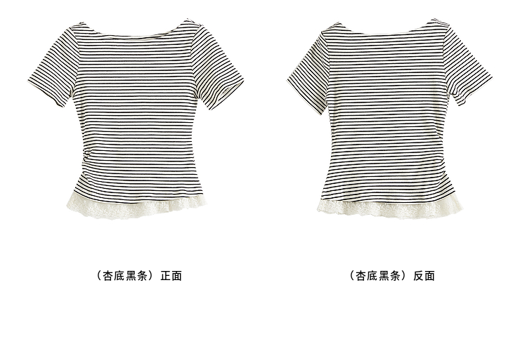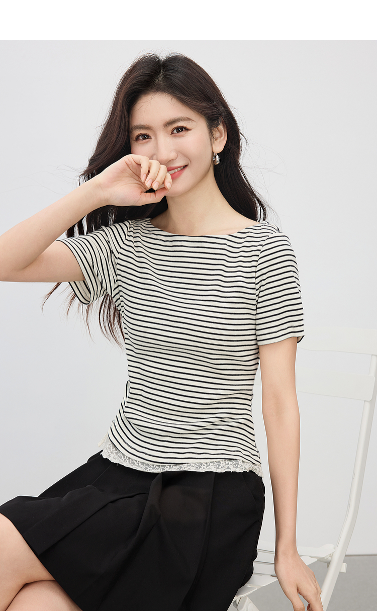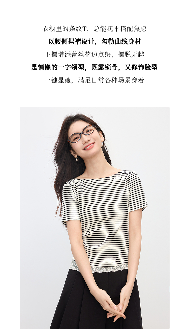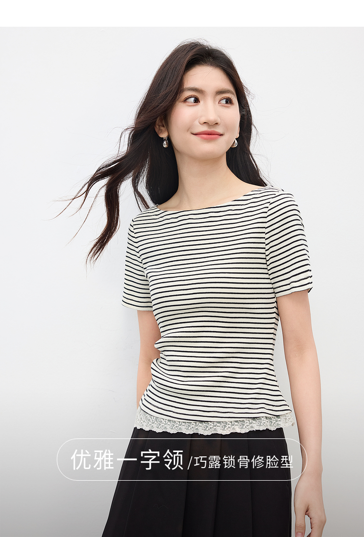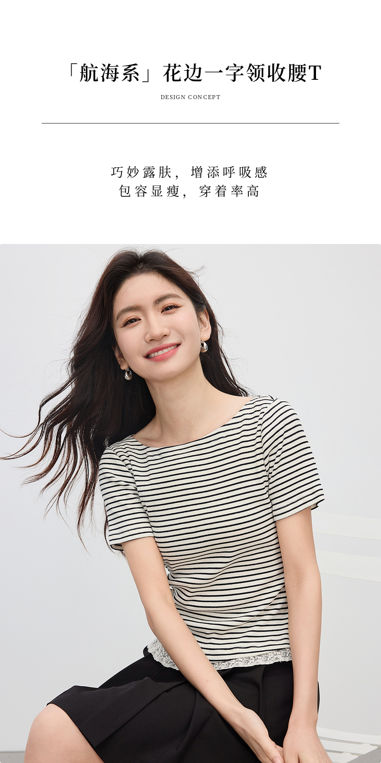 【周四狂欢价】熙世界黑白条纹T恤女短袖夏季设计感一字领蕾丝拼接收腰显瘦上衣