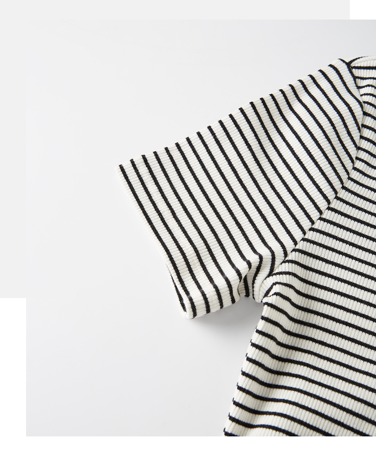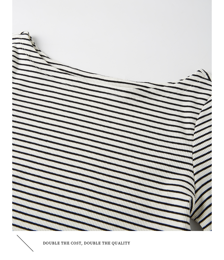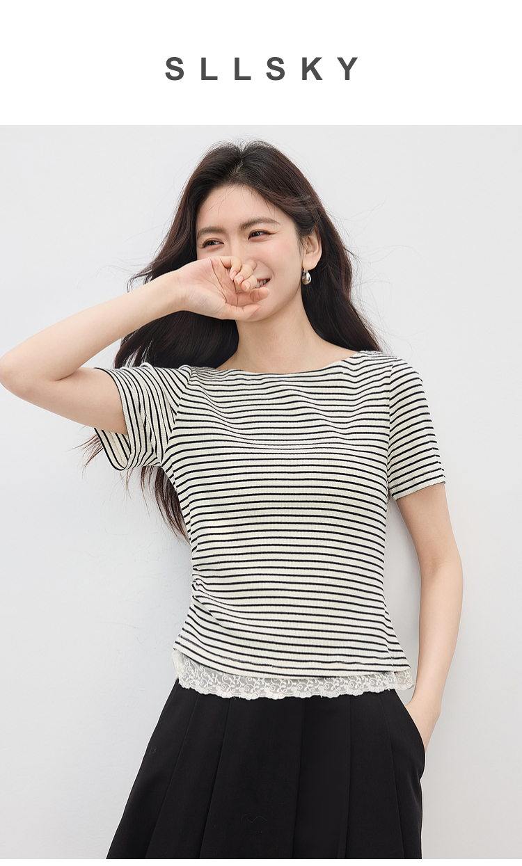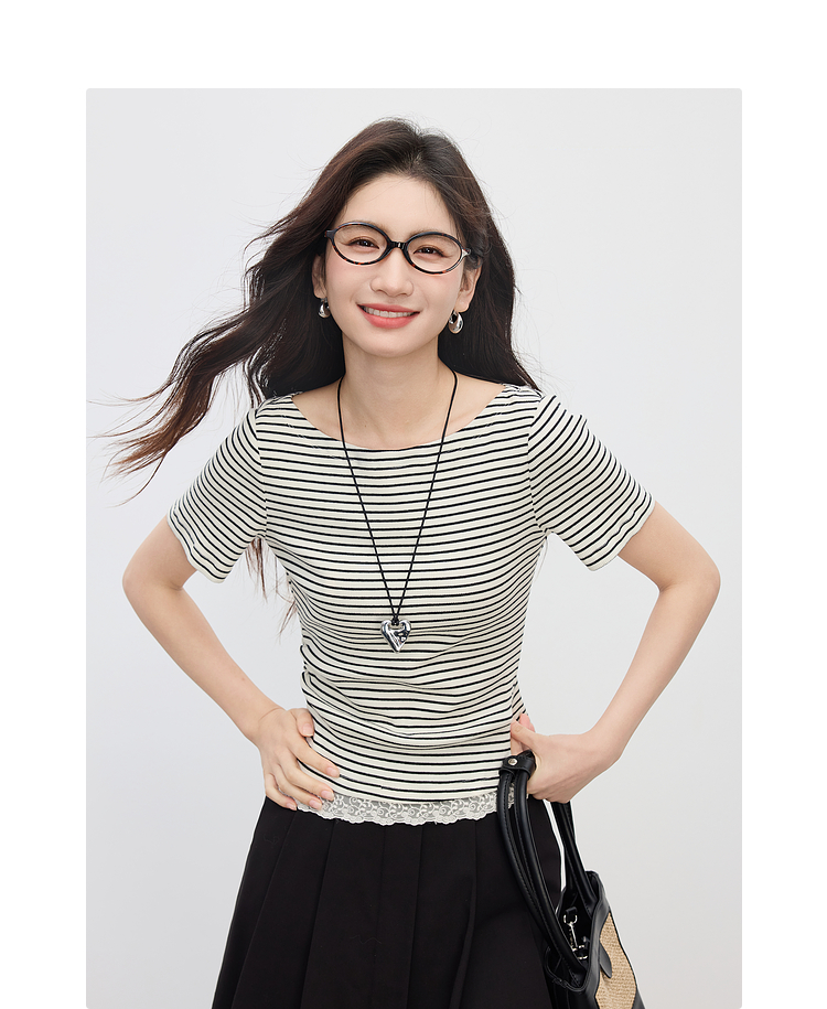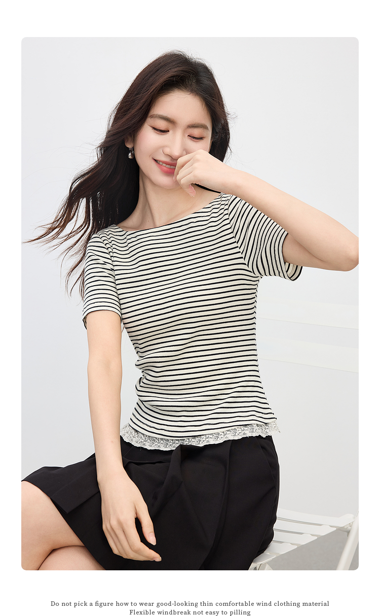 【周四狂欢价】熙世界黑白条纹T恤女短袖夏季设计感一字领蕾丝拼接收腰显瘦上衣