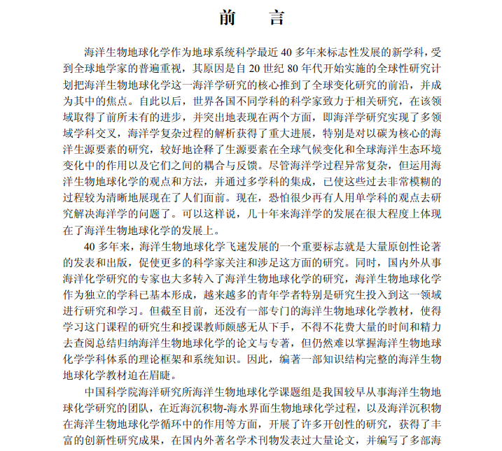 《海洋生物地球化学》是我国第一部关于海洋生物地球化学的研究生教材,重点阐述了碳、氮、磷、硅等生源要素海洋生物地球化学过程的基本原理、规律和研究发展趋势,是编著者结合自己多年的研究成果并在系统归纳总结近40年来国内外相关研究文献基础上倾力完成的。《海洋生物地球化学》分为8章,第1章简要概述了海洋生物地球化学的发展历史、基本原理、研究内容和研究意义;第2~5章着重阐述了碳、氮、磷、硅等主要生源要素的海洋生物地球化学过程;第6章解析了一些典型人类活动的影响,特别是富营养化、赤潮等生态灾害和珊瑚白化等过程的海洋生物地球化学作用;第7章初步探讨了海洋生物地球化学循环中的物流与能流过程;第8章分析了海洋生物地球化学现状和发展趋势。