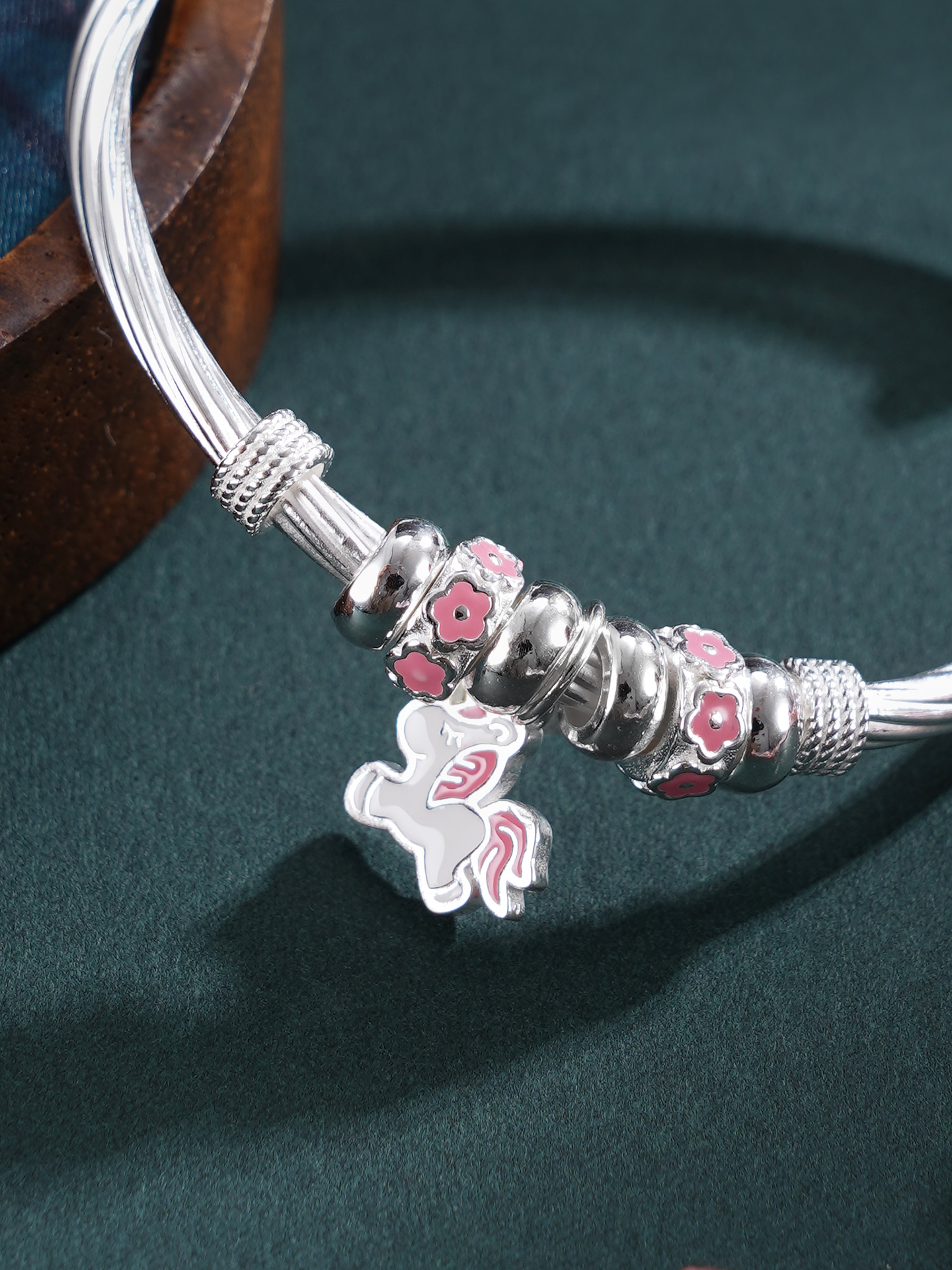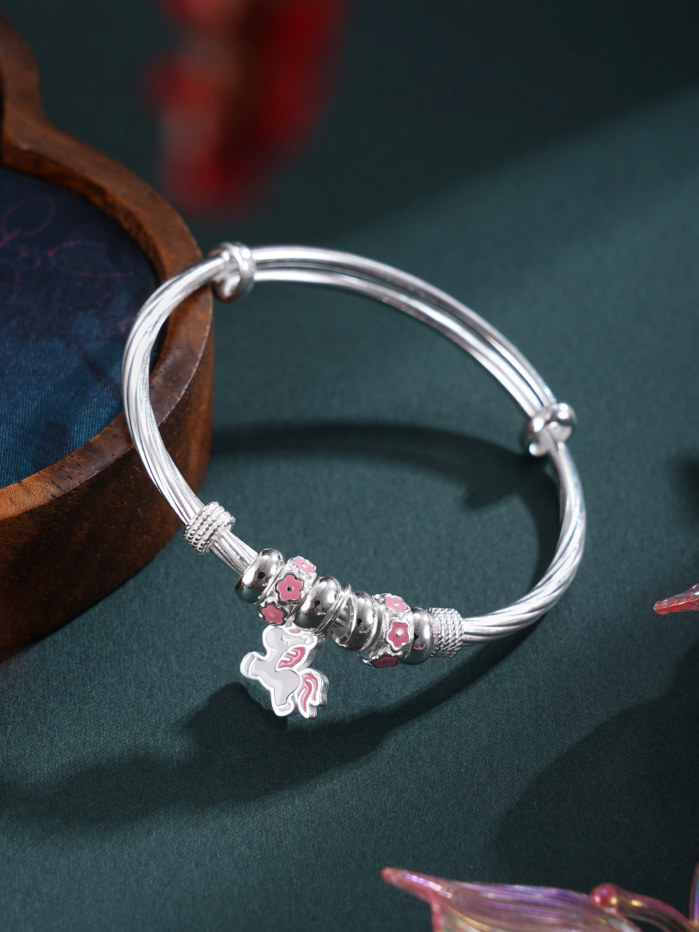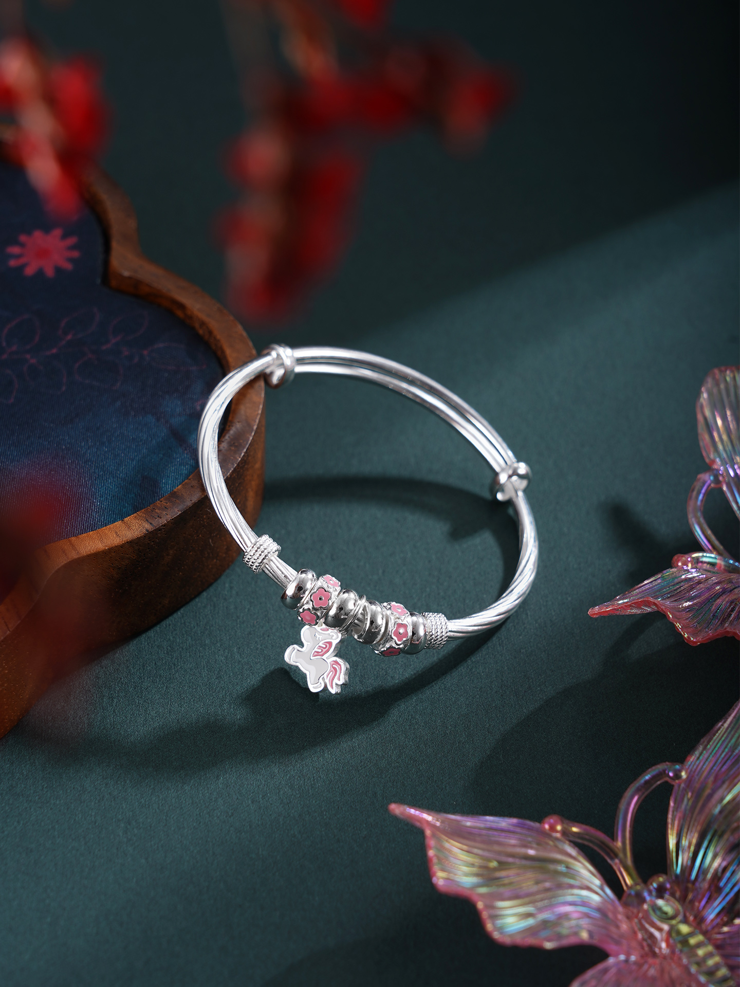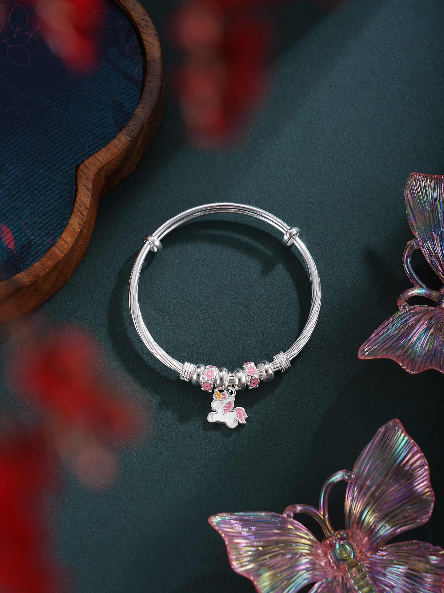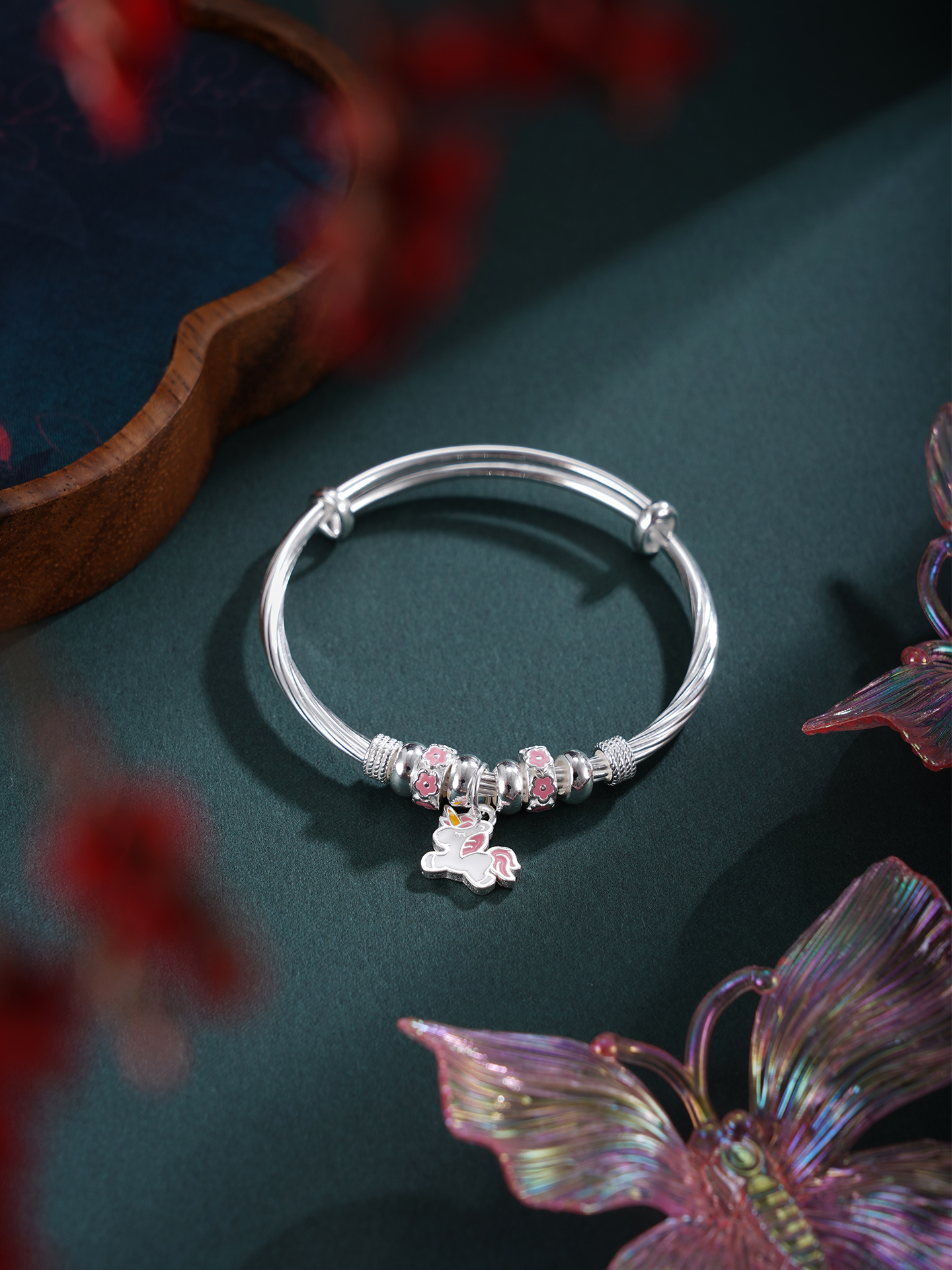 【寓意】:童镯设计灵感源自小马宝莉(彩虹小马),奔腾小马造型,象征宝宝勇往直前,不断前行,彩色珐琅点染,象征宝宝的人生美满幸福,绽放光彩。