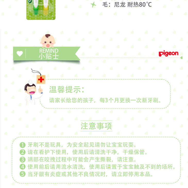 【一般贸易】日本贝亲Pigeon 婴儿超柔软刷头1岁-1岁半牙刷 绿色两支装
