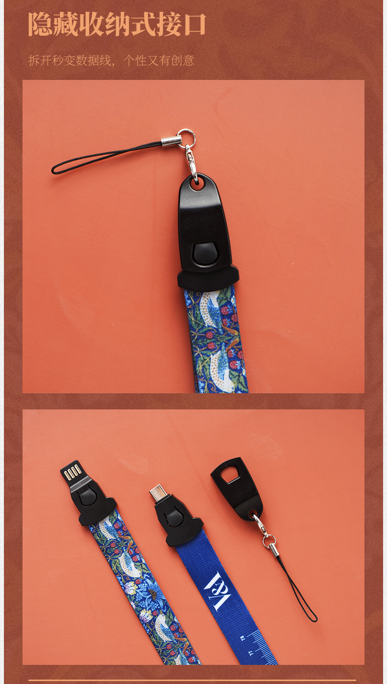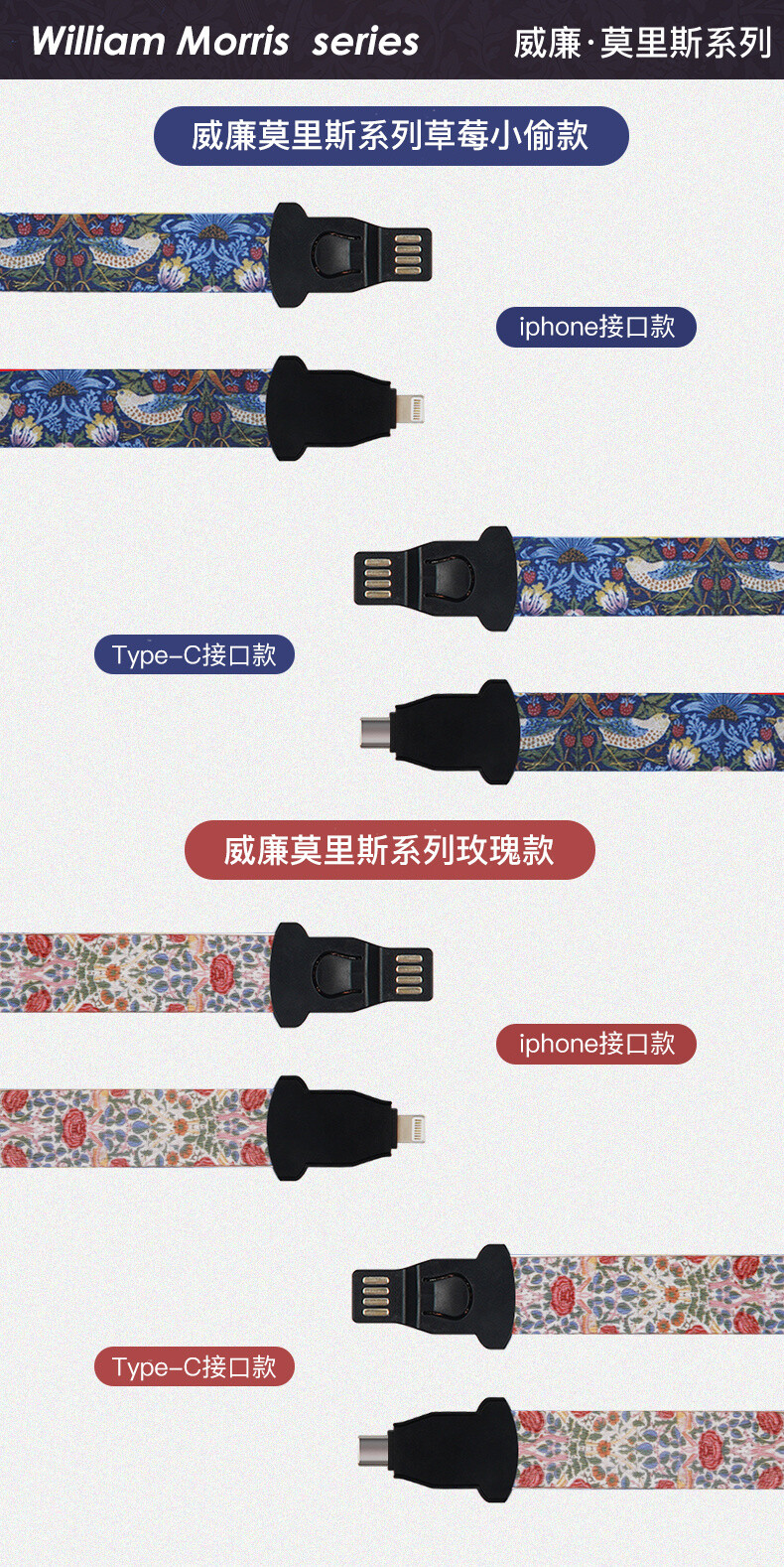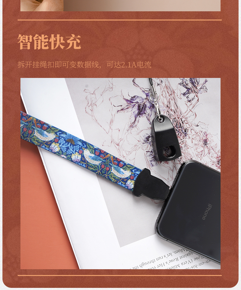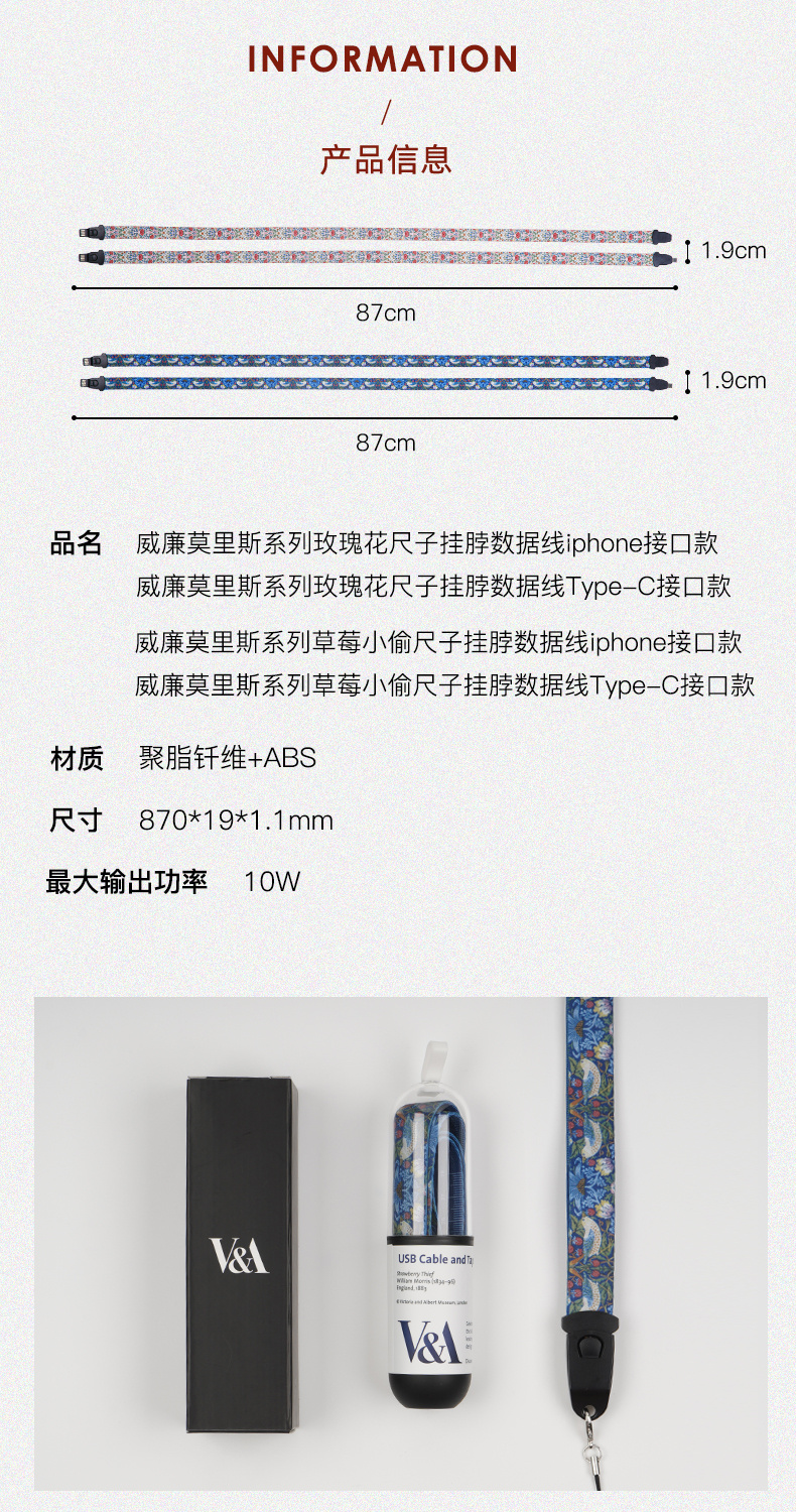 V&A博物馆莫里斯莓小偷玫瑰系列苹果typec创意多功能挂绳数据线