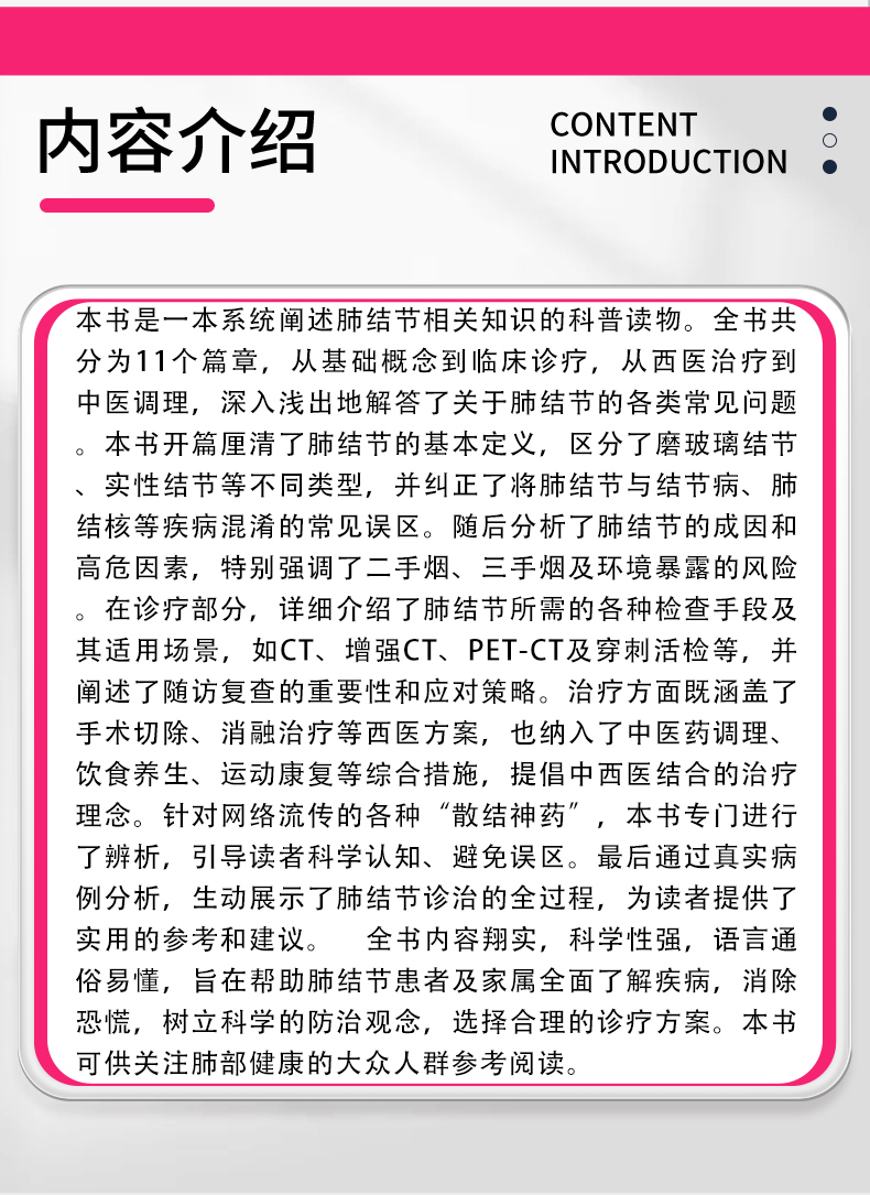 本书是一本系统阐述肺结节相关知识的科普读物。全书共分为11个篇章,从基础概念到临床诊疗,从西医治疗到中医调理,深入浅出地解答了关于肺结节的各类常见问题。本书开篇厘清了肺结节的基本定义,区分了磨玻璃结节、实性结节等不同类型,并纠正了将肺结节与结节病、肺结核等疾病混淆的常见误区。随后分析了肺结节的成因和高危因素,特别强调了二手烟、三手烟及环境暴露的风险。在诊疗部分,详细介绍了肺结节所需的各种检查手段及其适用场景,如CT、增强CT、PET-CT及穿刺活检等,并阐述了随访复查的重要性和应对策略。治疗方面既涵盖了手术切除、消融治疗等西医方案,也纳入了中医药调理、饮食养生、运动康复等综合措施,提倡中西医结合的治疗理念。针对网络流传的各种“散结神药”,本书专门进行了辨析,引导读者科学认知、避免误区。最后通过真实病例分析,生动展示了肺结节诊治的全过程,为读者提供了实用的参考和建议。 全书内容翔实,科学性强,语言通俗易懂,旨在帮助肺结节患者及家属全面了解疾病,消除恐慌,树立科学的防治观念,选择合理的诊疗方案。本书可供关注肺部健康的大众人群参考阅读。