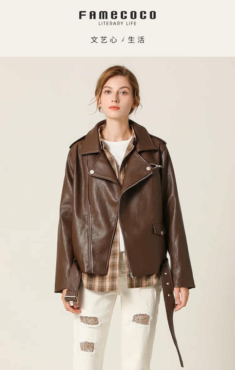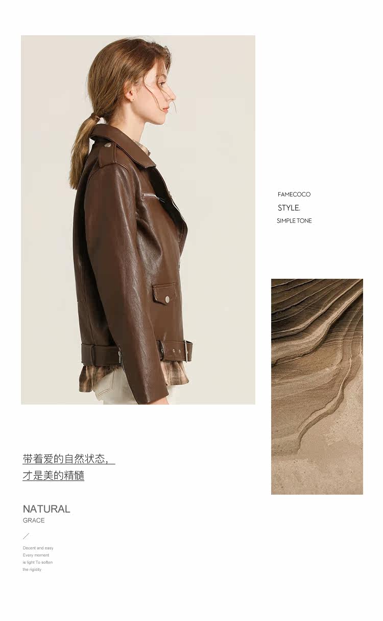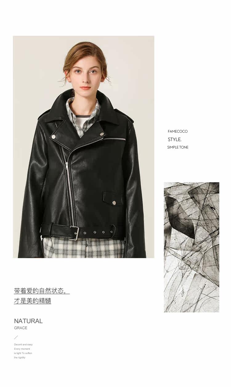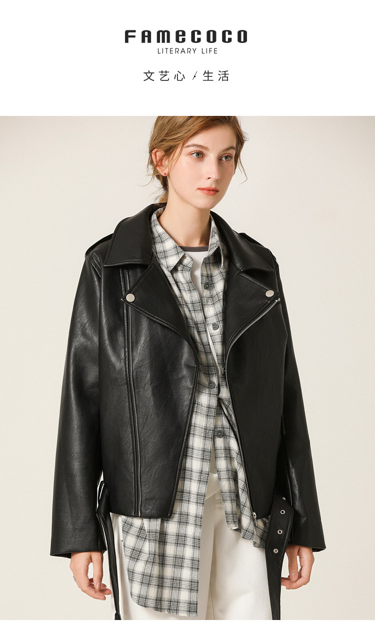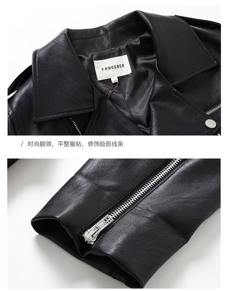 Famecoco范可儿春秋季时尚立领宽松短款PU皮衣外套F201AG103