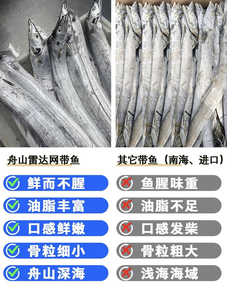 注意:新老包装随机发货!带鱼破肚不是不新鲜,带鱼皮薄肉嫩,从深海迅速捕捞上来时受到压强的影响导致容易破肚,属于正常现象!有于生鲜商品特殊性,商品分拣都是由人工机器流水线分拣,个别商品尺寸及重量不可避免会有偏差,下单请知悉!