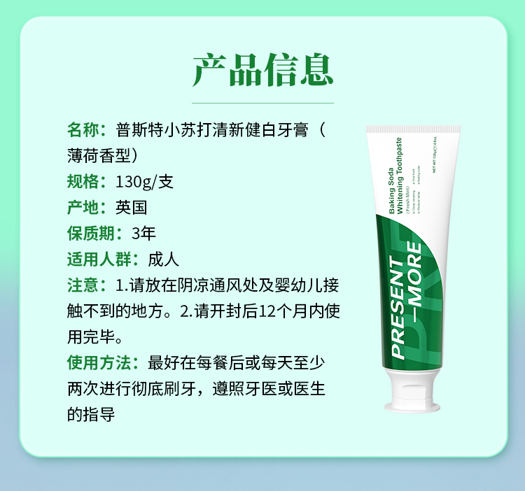 【品名】:普斯特小苏打清新健白牙膏(薄荷香型)
