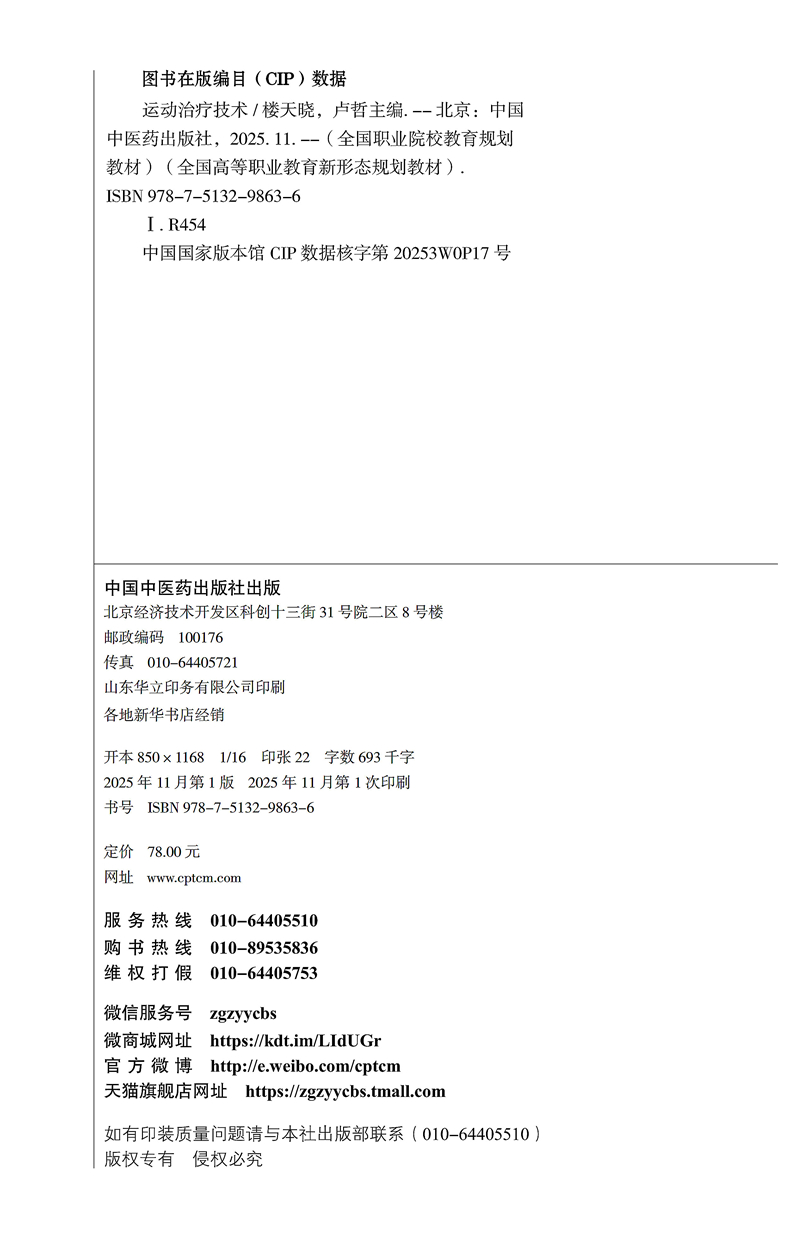运动治疗技术 全国高等职业教育新形态规划教材 楼天晓 卢哲 主编 供康复治疗技术 中医学 临床医学等 专业便用 中国中医药出版社