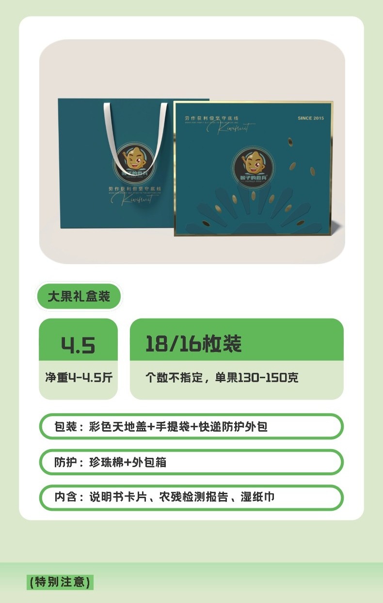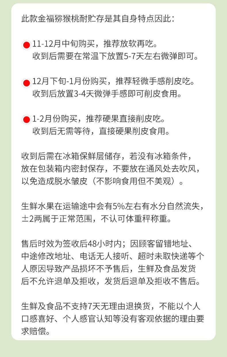 | 【发货时效】72小时内 【售后准则】坏果包赔,如有坏果收货后(以快递公司物流信息为准)24小时内,将坏果与面单合照,面单号需清晰可见。赔付标准:单果价格=总价/总颗数,坏果过半补发一箱同规格或退全款 【温馨提示】产品使用保存注意事项:金福收到后3-5天即使硬果也可食用,推荐微软状态食用。常温下可保存7-15天,冰箱保鲜层可保存15-30天 |