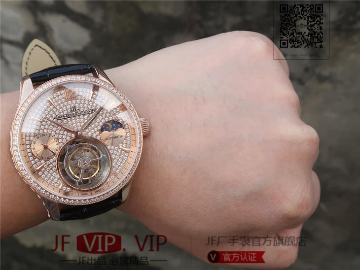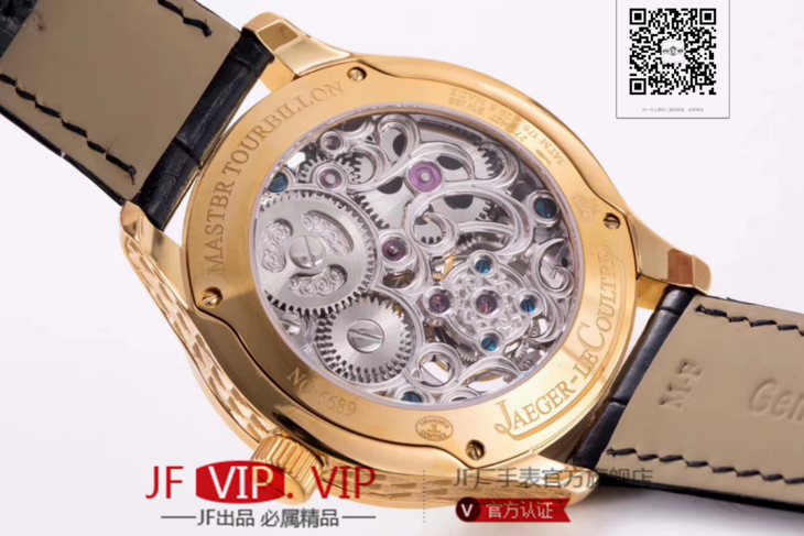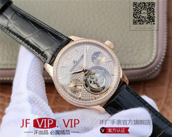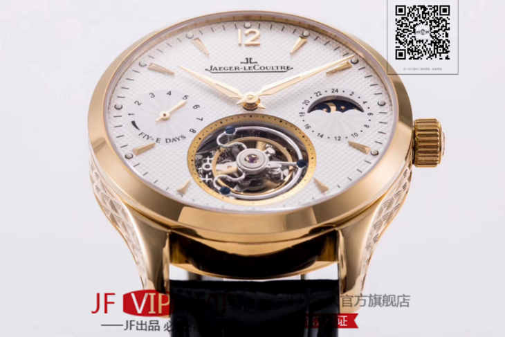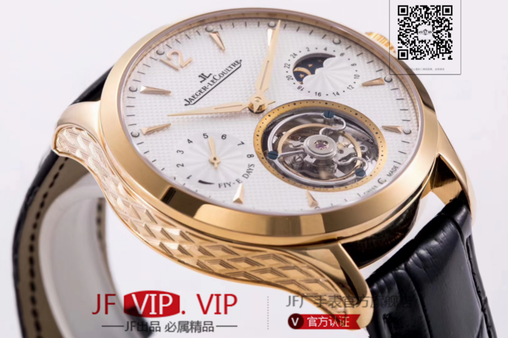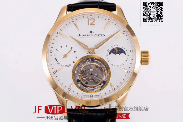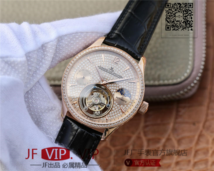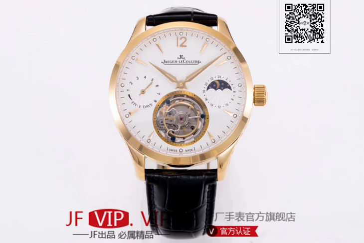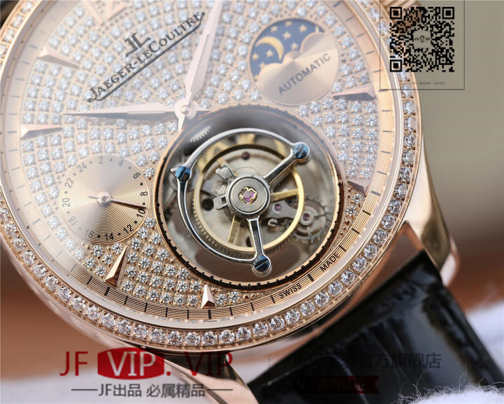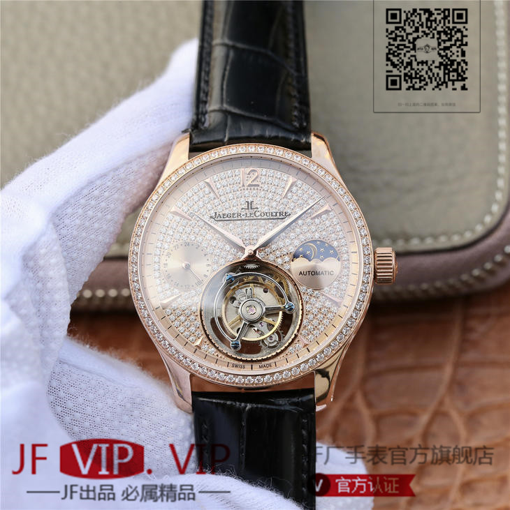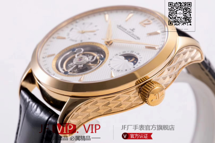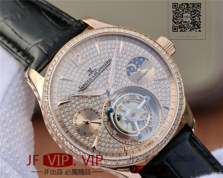 积家大师系列复杂功能真陀飞轮腕表。GMT二地時區顯示,24小時日月星象,EQ手动3310真陀飞轮,義大利牛皮,蓝宝石镜面,表径:42毫米,