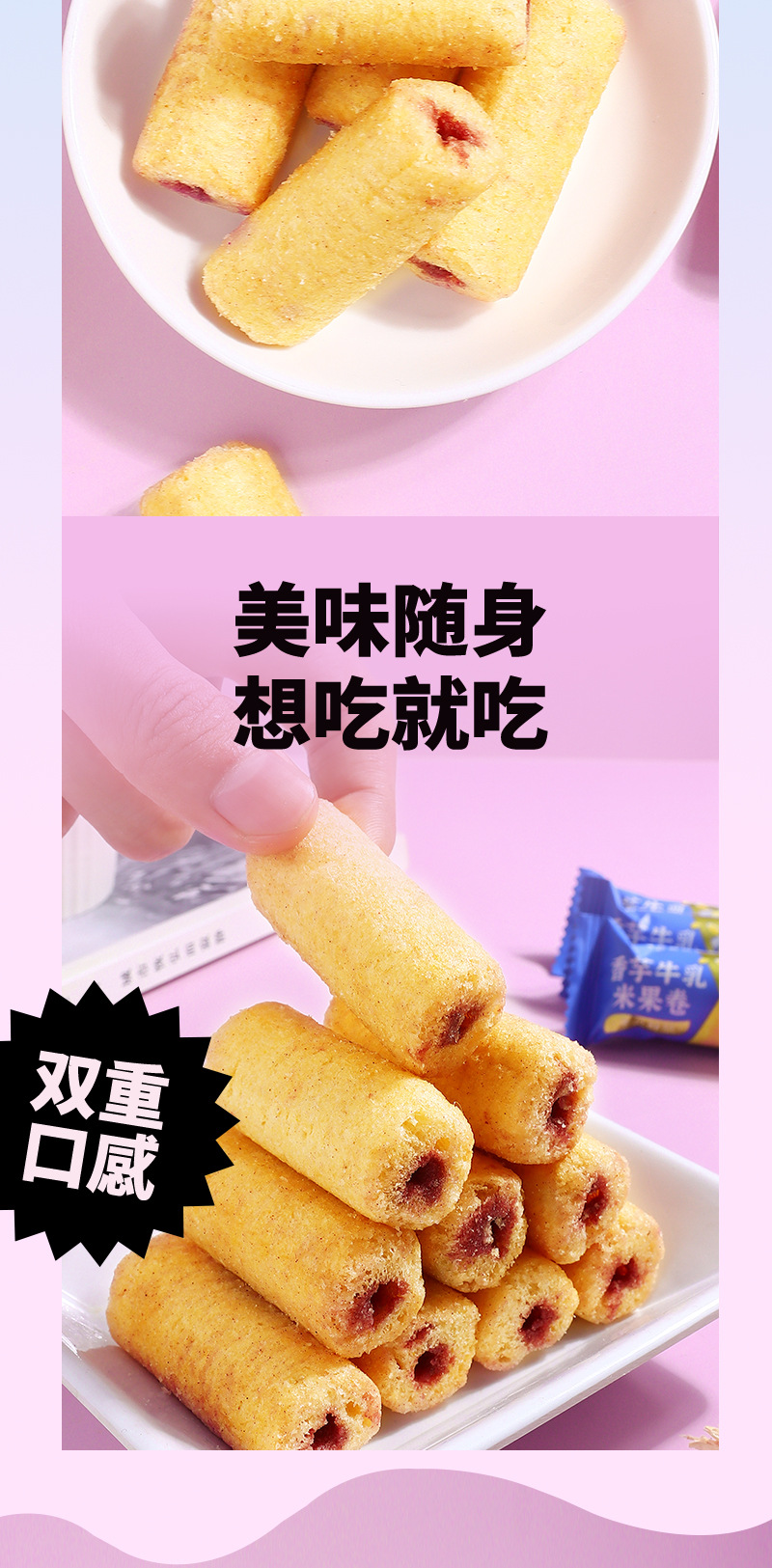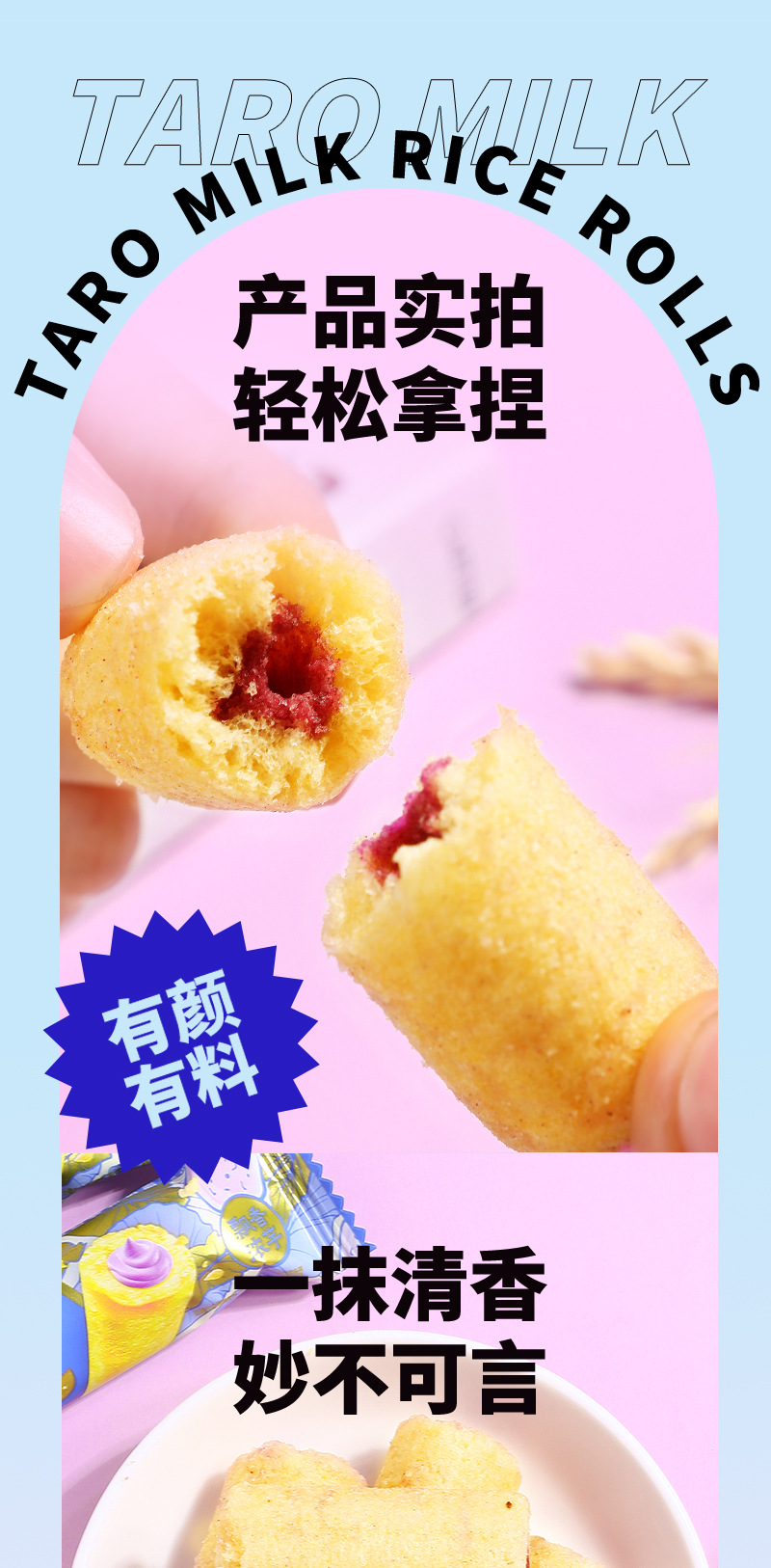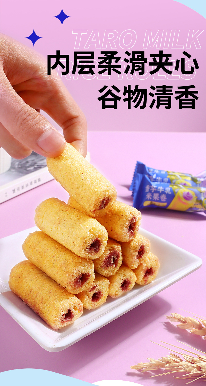 【19.9抢80包❗香芋牛乳米果卷】内层柔滑夹心谷物清香,香芋牛乳层层有滋味,双重口感爱不 释口,米香恒温烘焙独立包装休闲小零食食品散装QQ