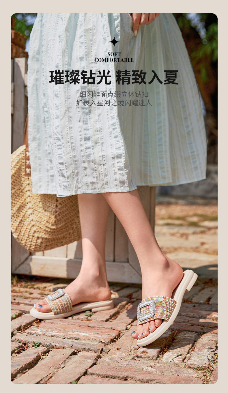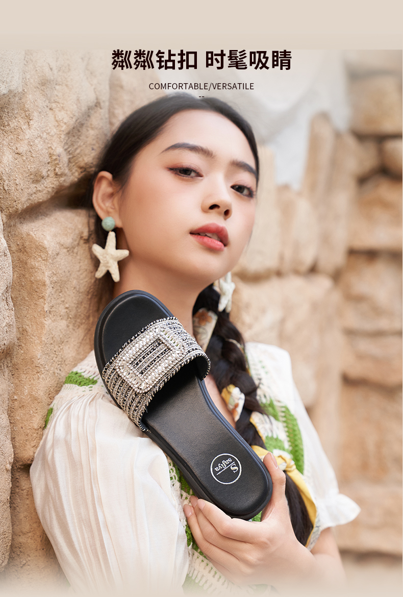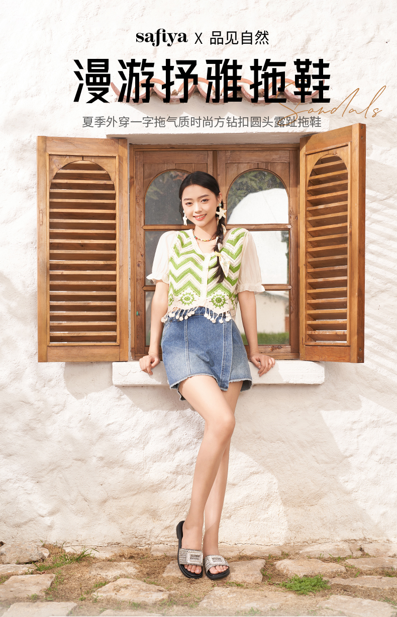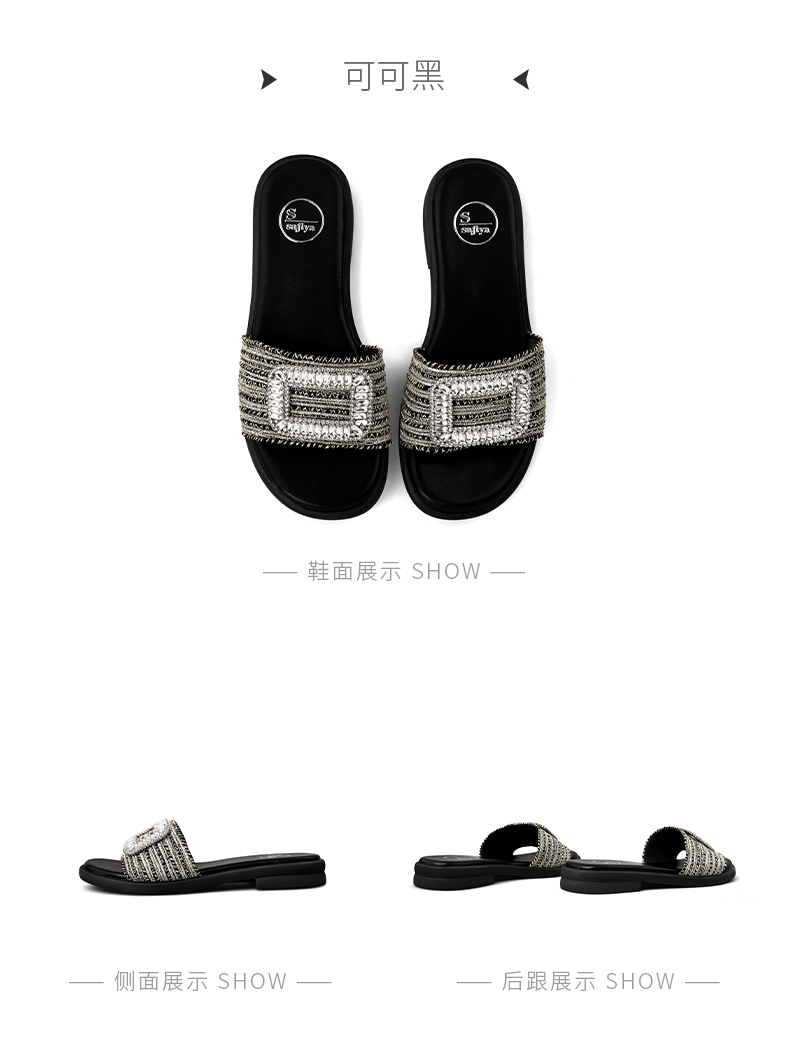 预售10天|Safiya/索菲娅2025夏季外穿一字拖气质时尚方钻扣圆头露趾拖鞋SFD2110368
