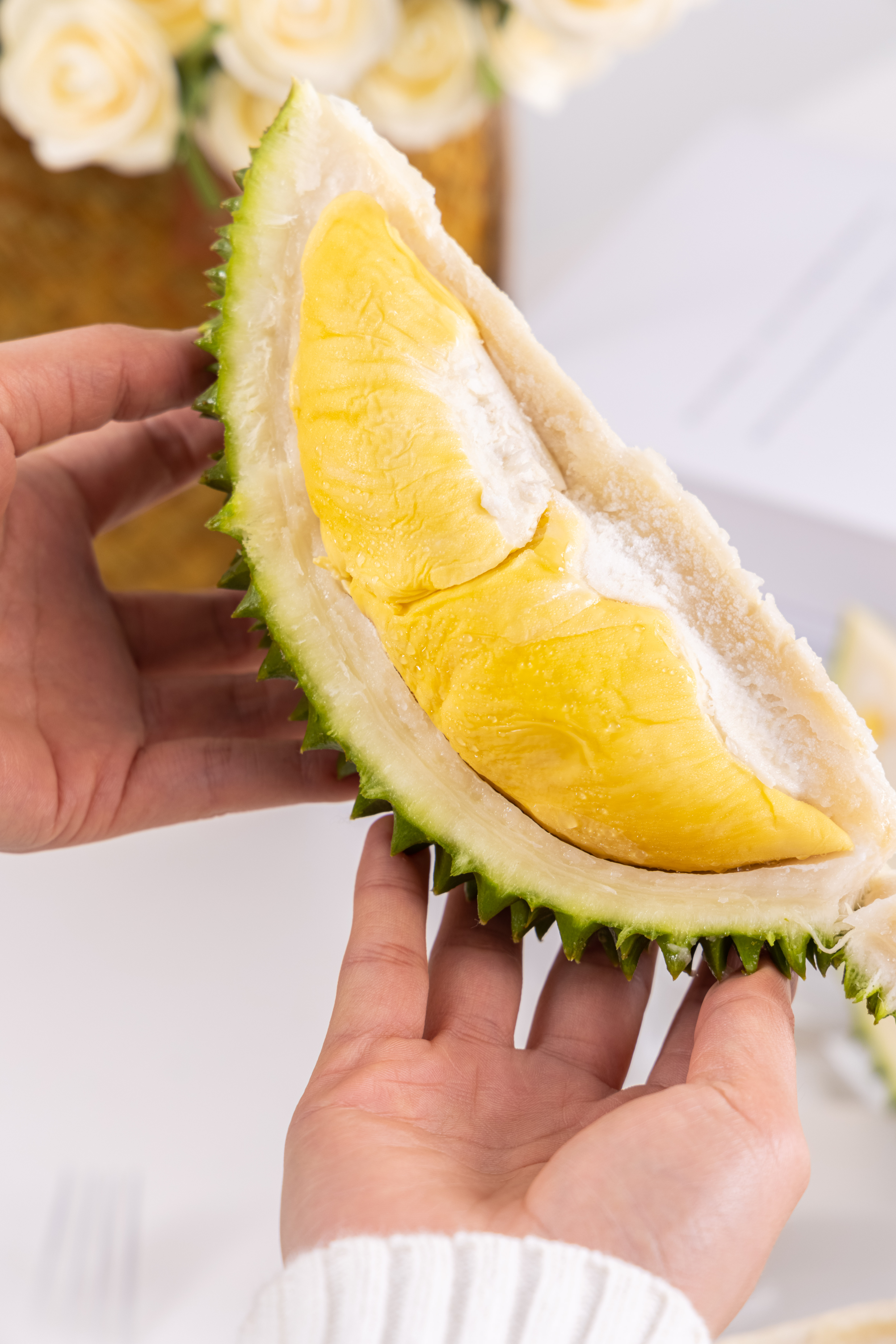 当你撬开外壳,金黄而富有色泽的果肉带着浓郁的榴莲香味呈现眼前,从视觉和嗅觉上狠狠抓住你的心,让你垂涎欲滴。
