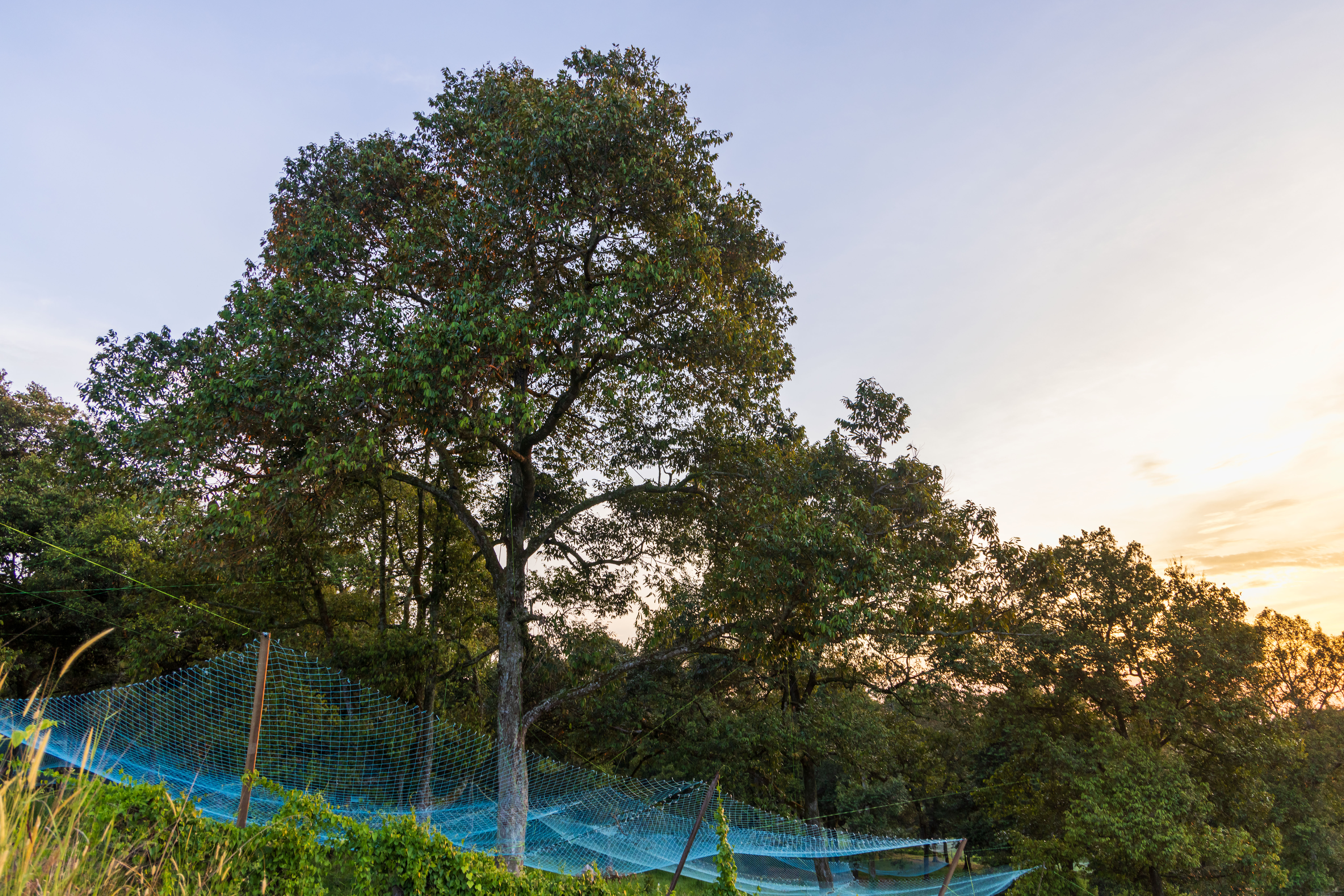 树下一张张蓝色的大网在承接着自然成熟掉落的猫山王榴莲,这被当地人誉为“瓜熟蒂落,神的馈赠”。