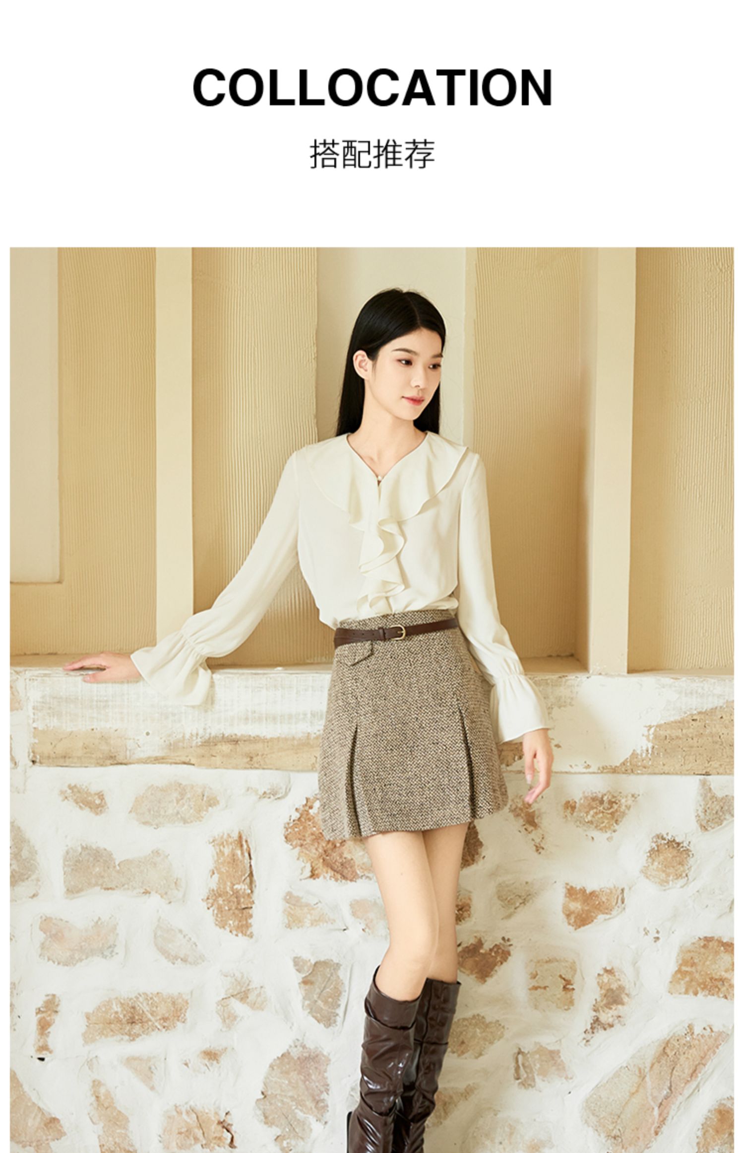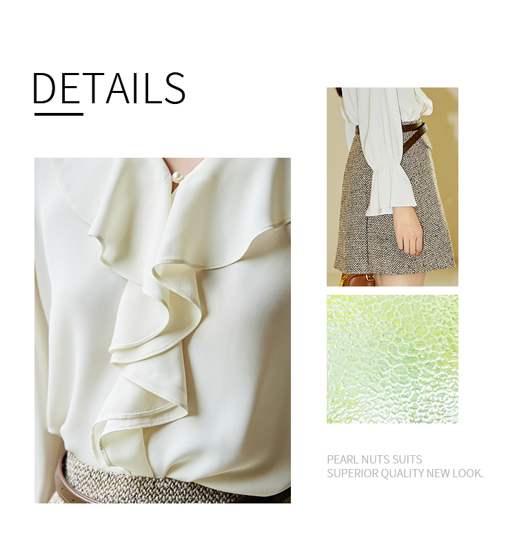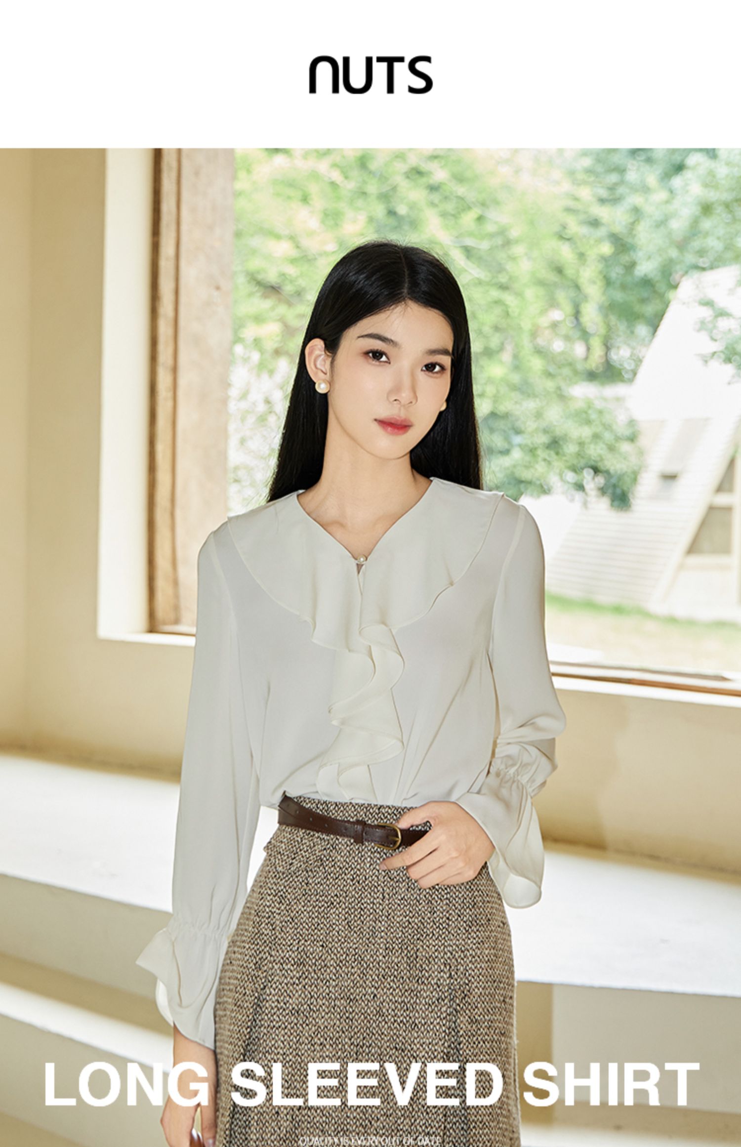 NUTS秋季2023新款荷叶边甜美衬衫女长袖上衣别致打底衫4350101A1