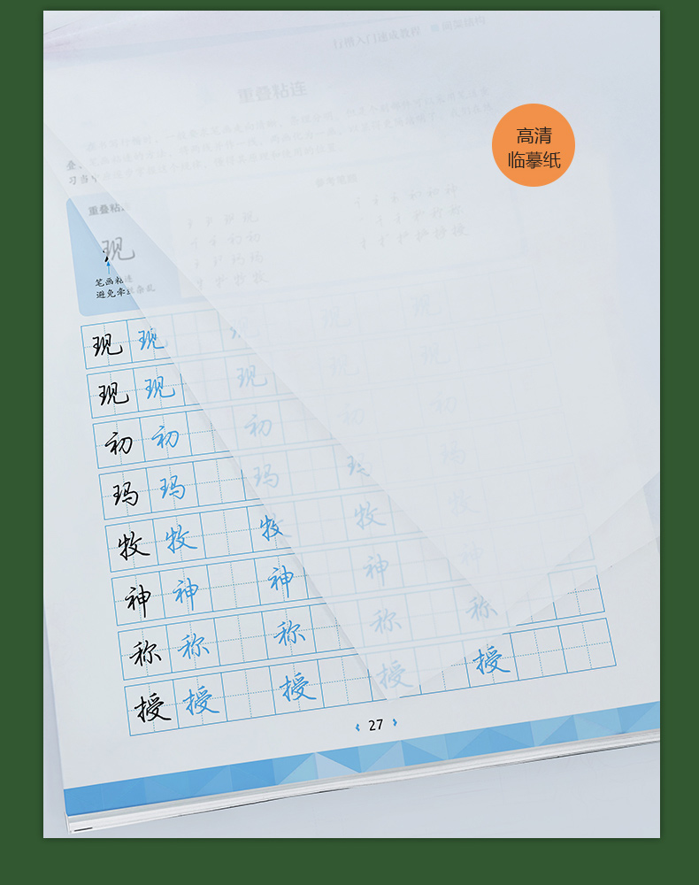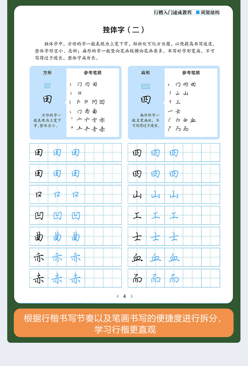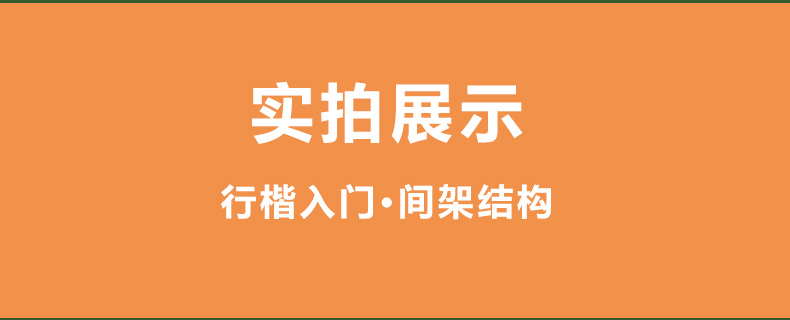 总结了四大间架结构类型和32种间架结构规律,并且加入了“参考笔顺”部分,将每个例字的连笔笔顺进行拆分,供读者参考练习。