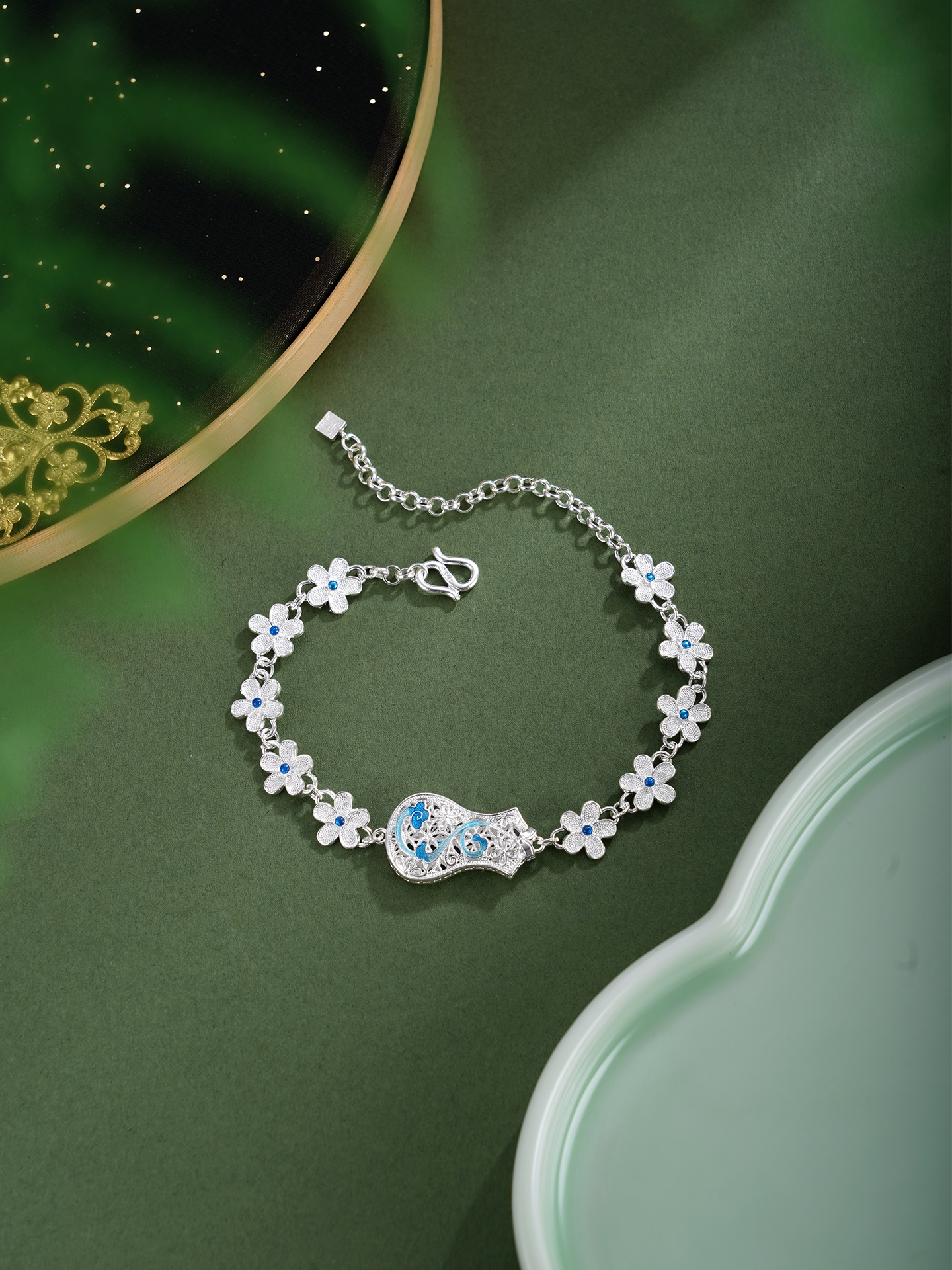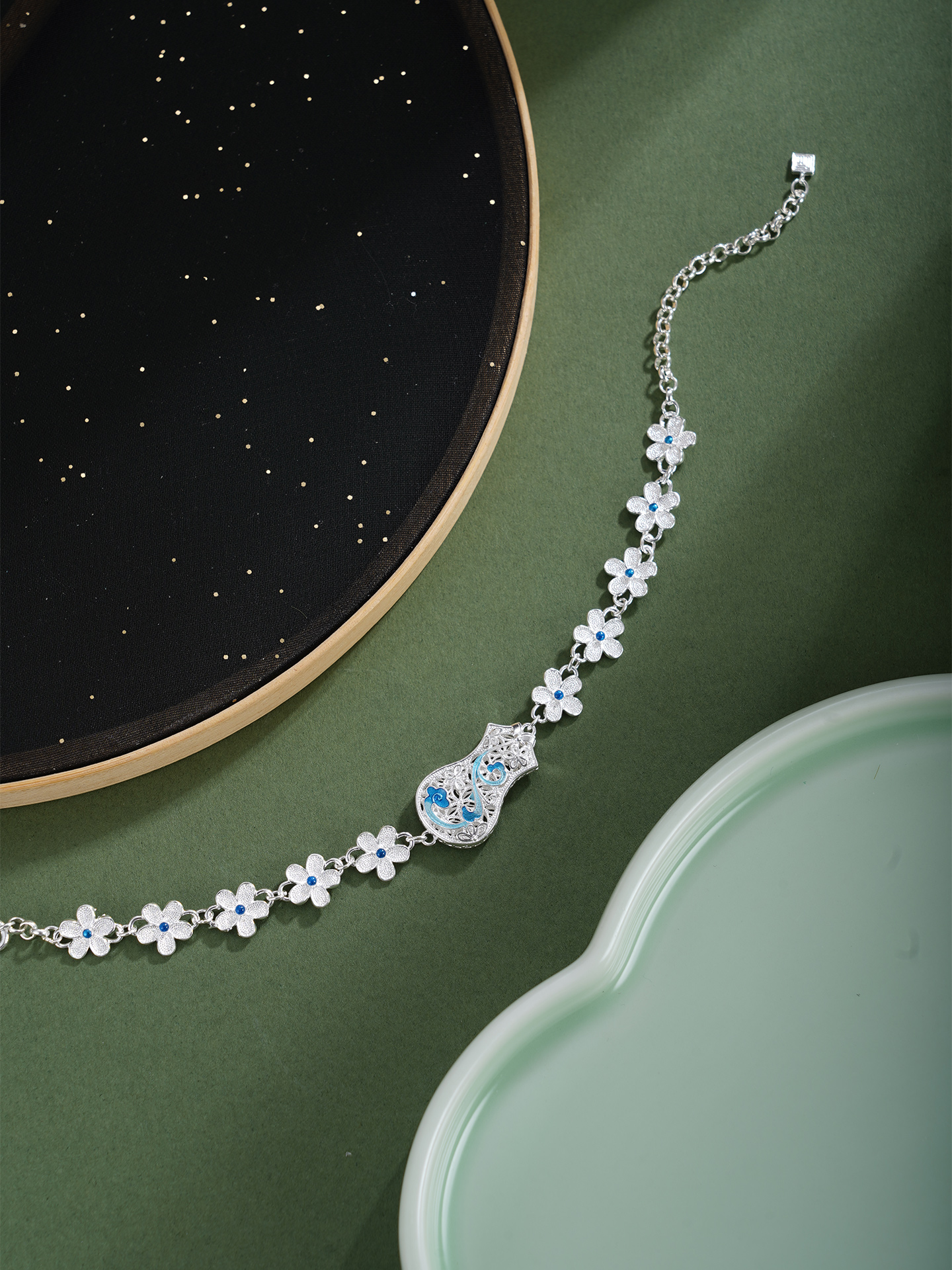 【寓意】:作品采非遗银花丝打造,银丝勾勒旗袍轮廓,珐琅彩绘添清冷气质,花朵连绵点缀,寓意一生优雅如诗,一路花开吉祥。
