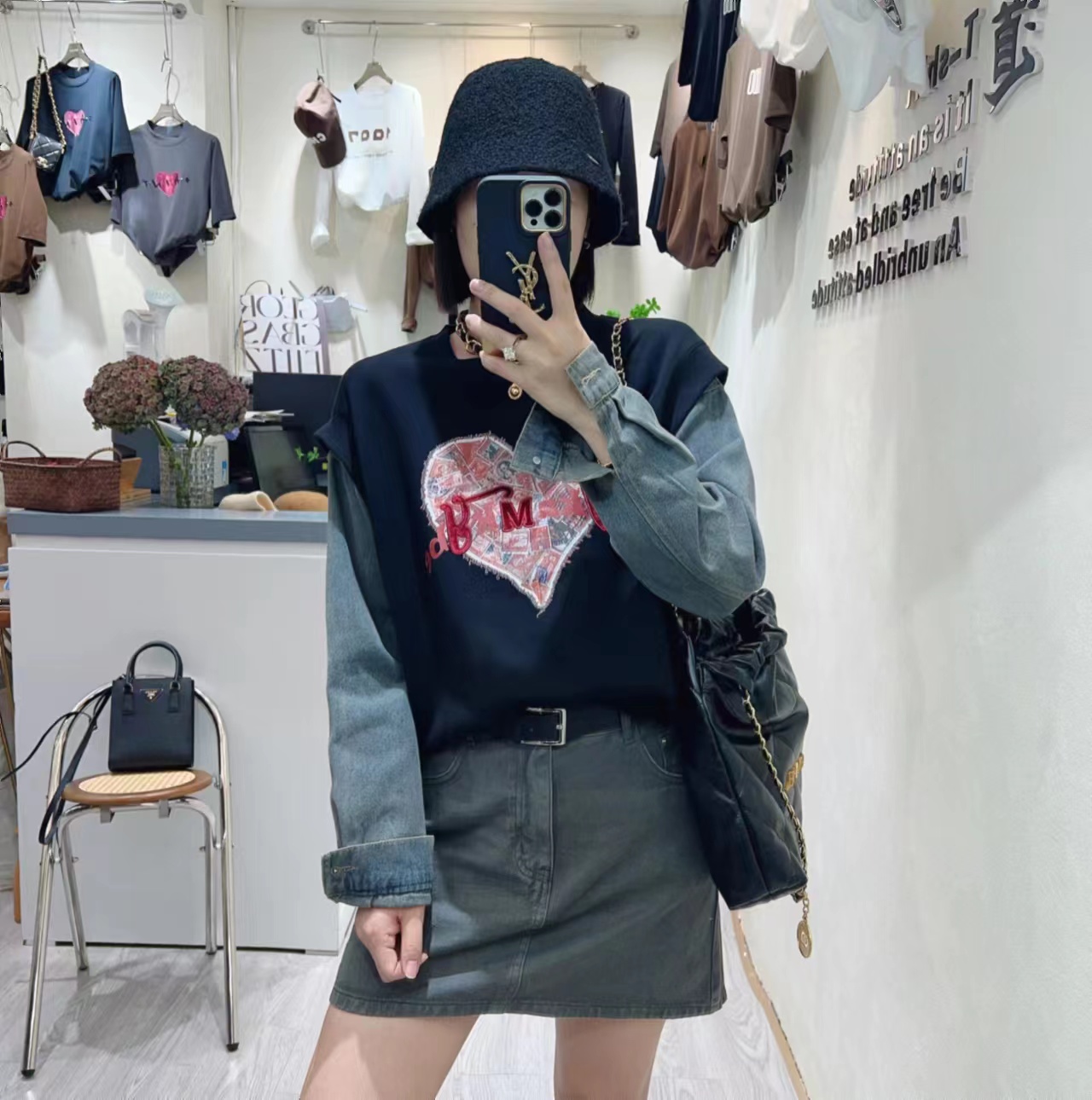 9866 # 米白 黑 均码 秋季新款牛仔拼接假两件爱心 印花宽松休闲百搭套头卫衣