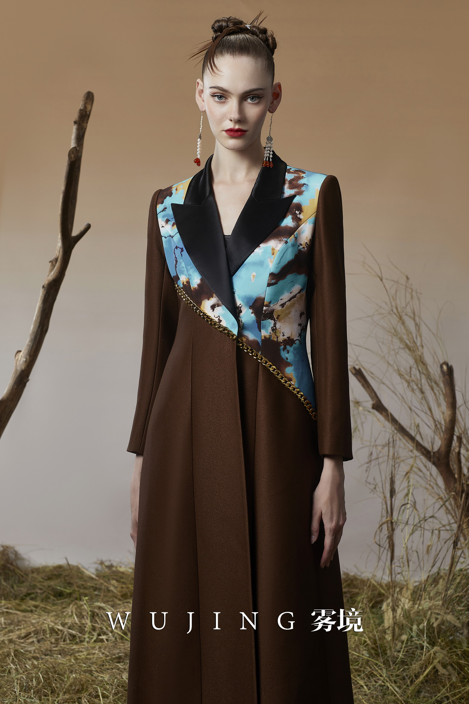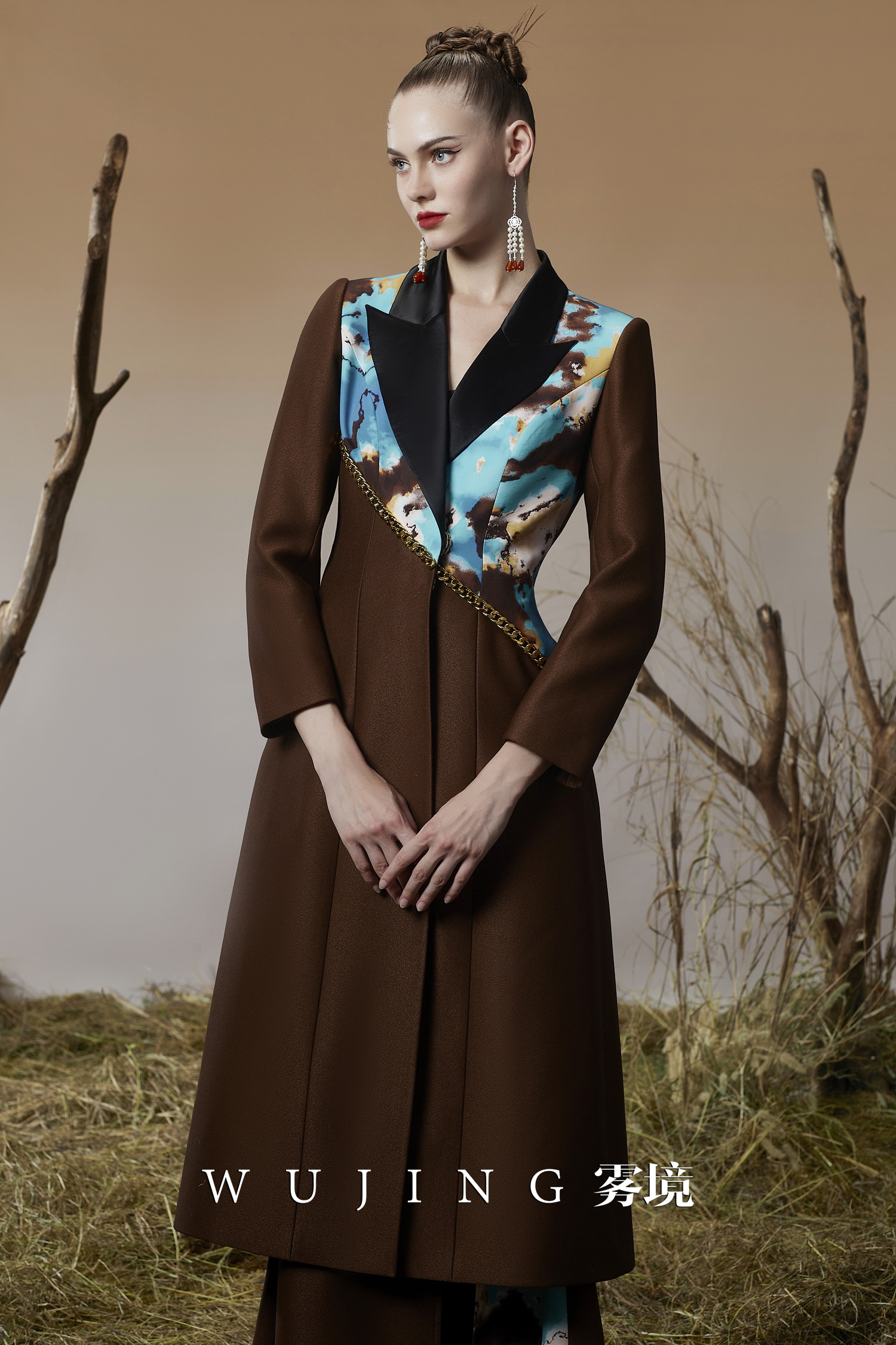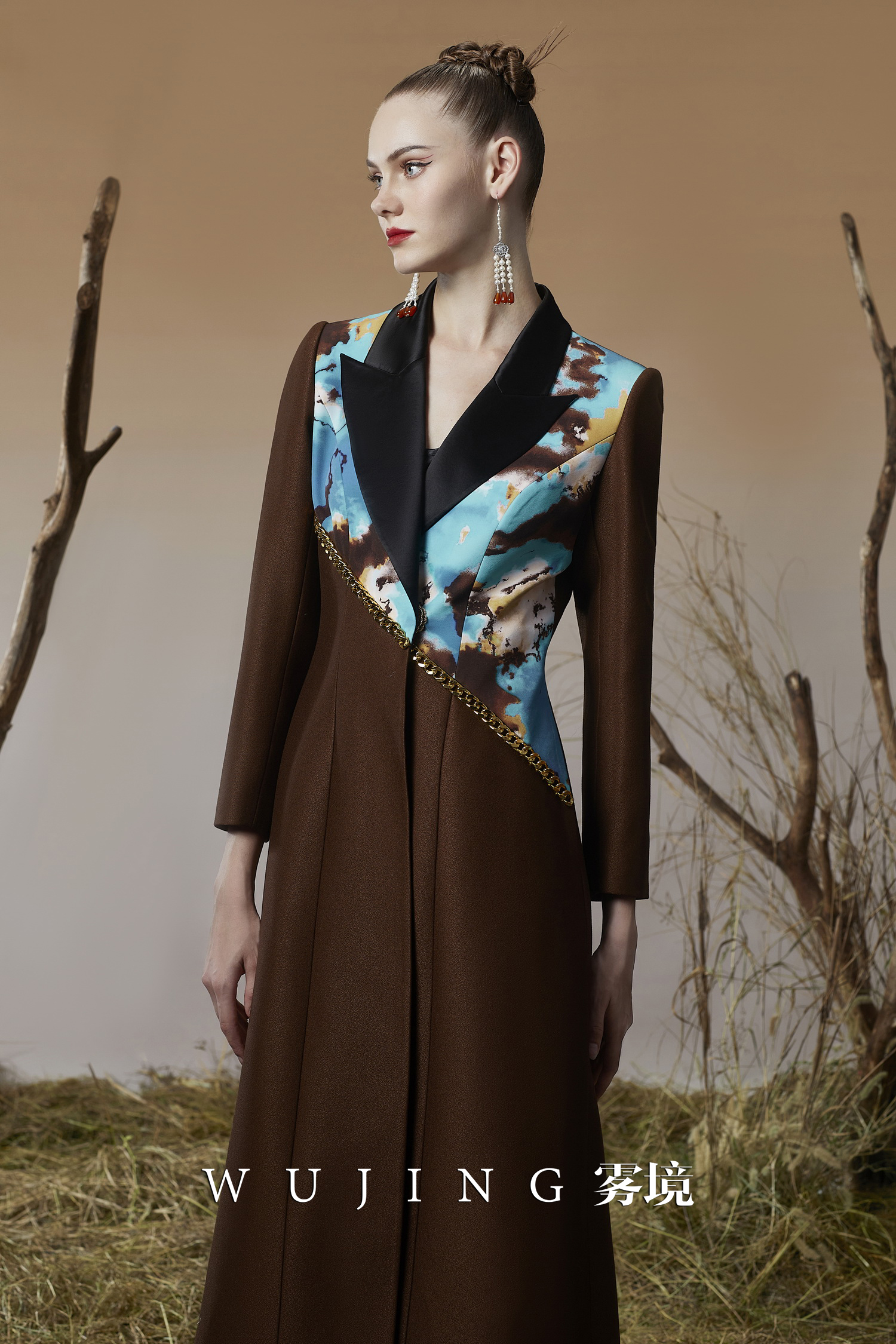 3203051 幽褐怀金 高级颗粒流光皱磨砂缎,定制双层加密四面弹印花大衣 雾境