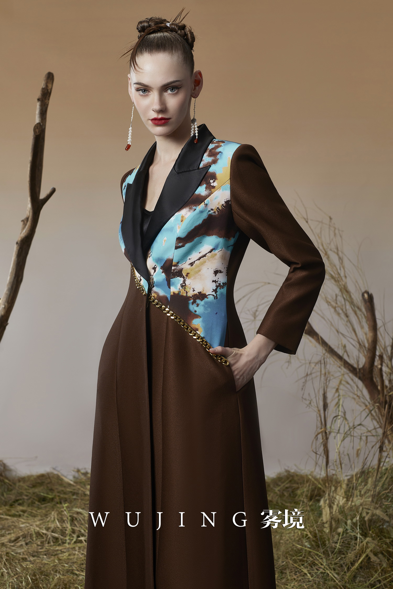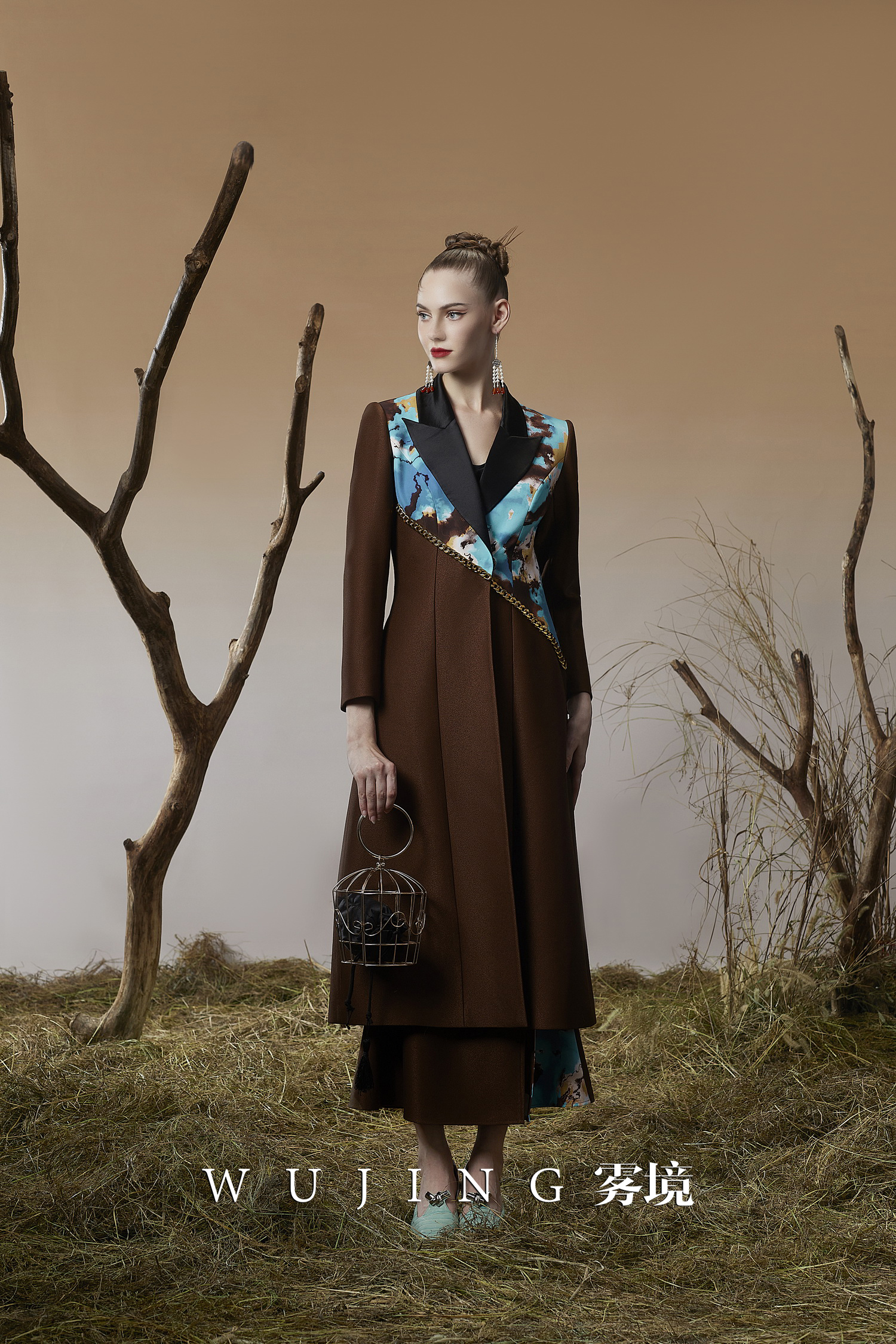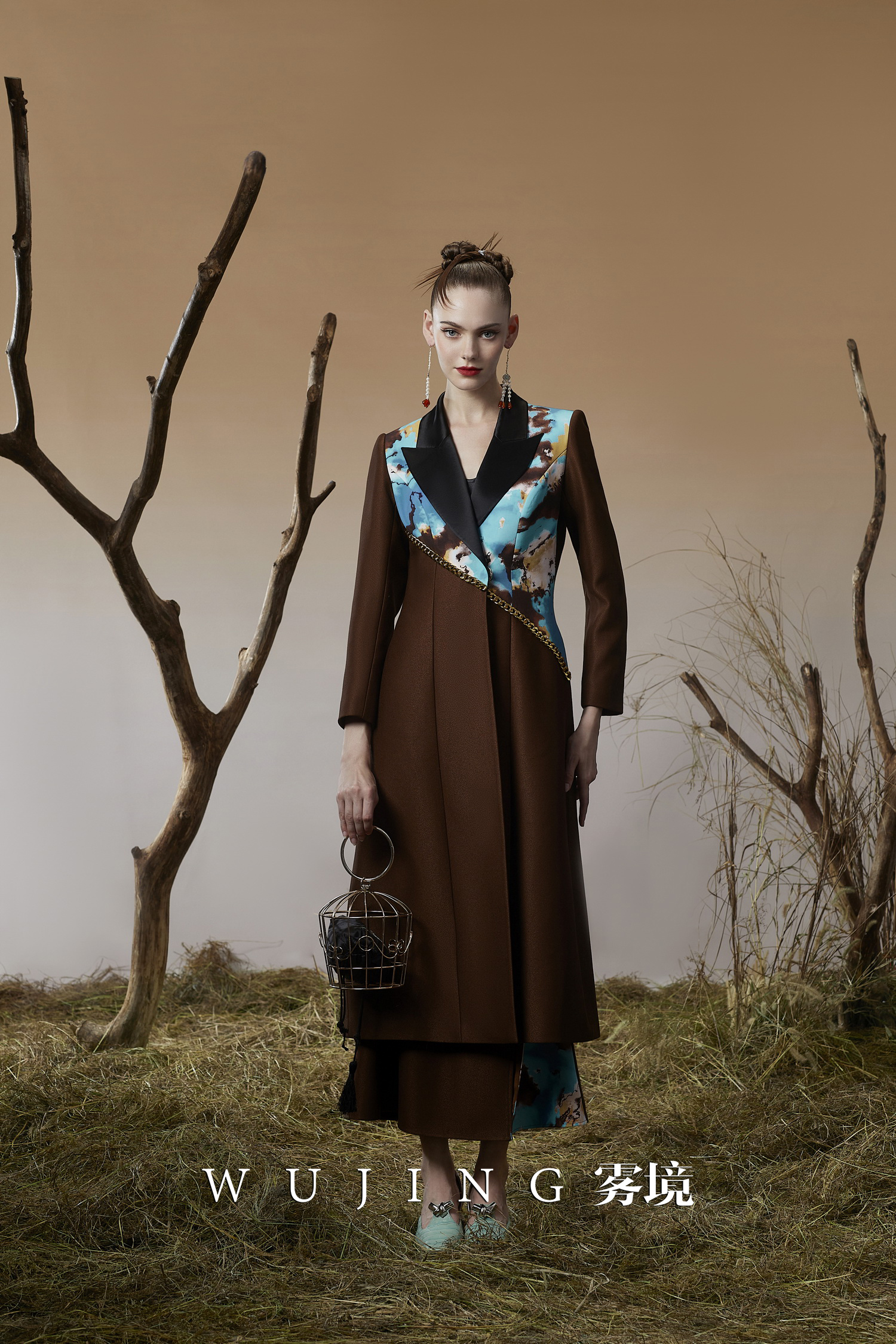 3203051 幽褐怀金 高级颗粒流光皱磨砂缎,定制双层加密四面弹印花大衣 雾境