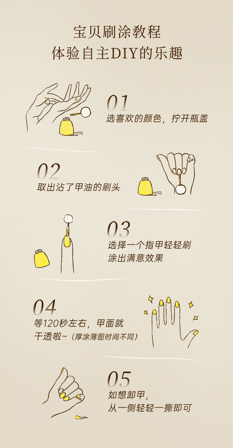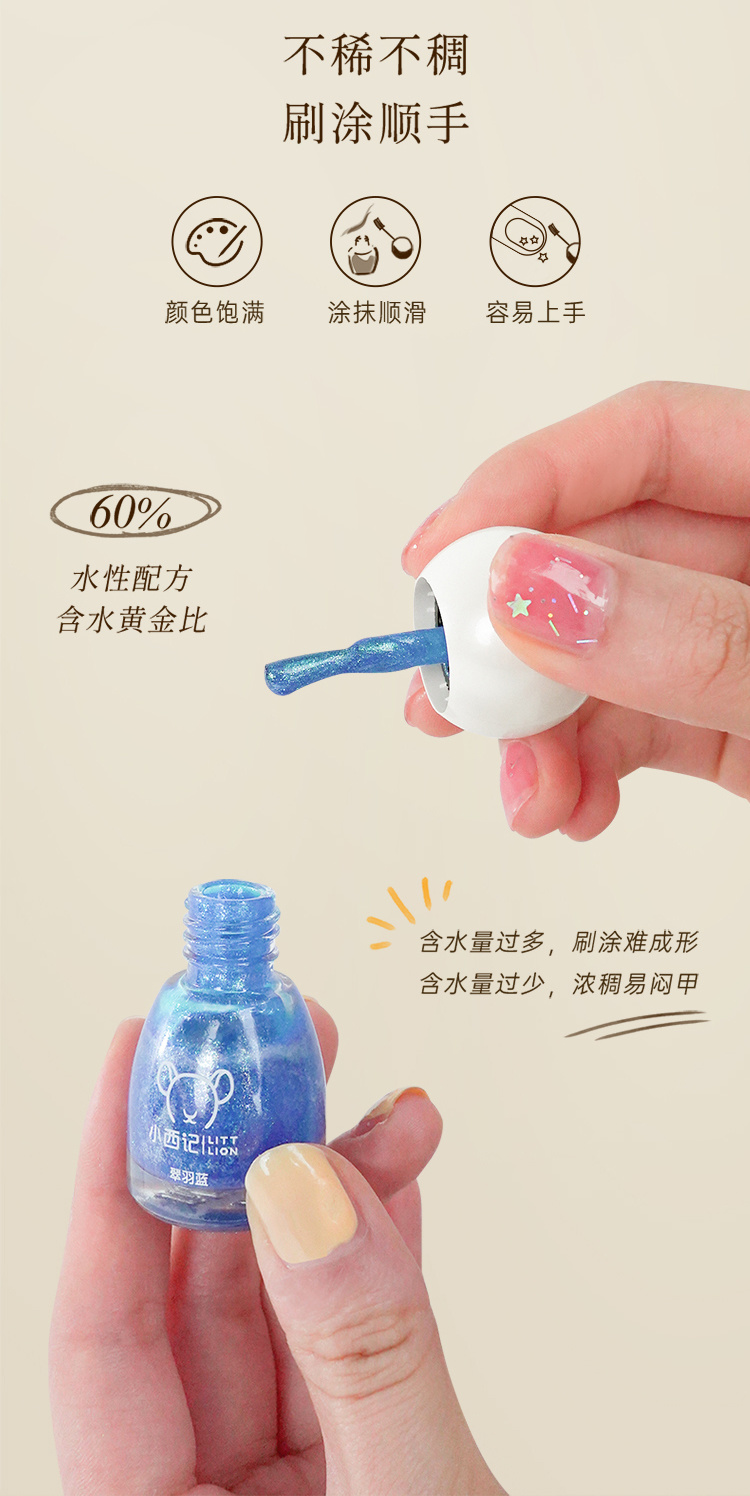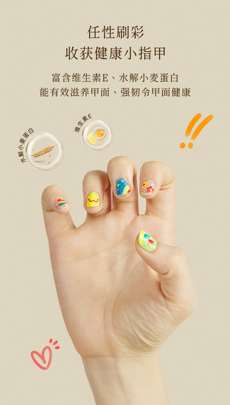✅毛刷采用进口杜邦纤维 更细密柔韧,完美贴合指缘,一笔上色 带料适中不厚重,涂抹顺滑流畅 宝贝更好上手!涂抹过程锻炼宝宝耐心~ 特别添加乳酸钙、丙二醇、 水解角蛋白等呵护指部的营养成分 不染色不残留,一撕即卸❗