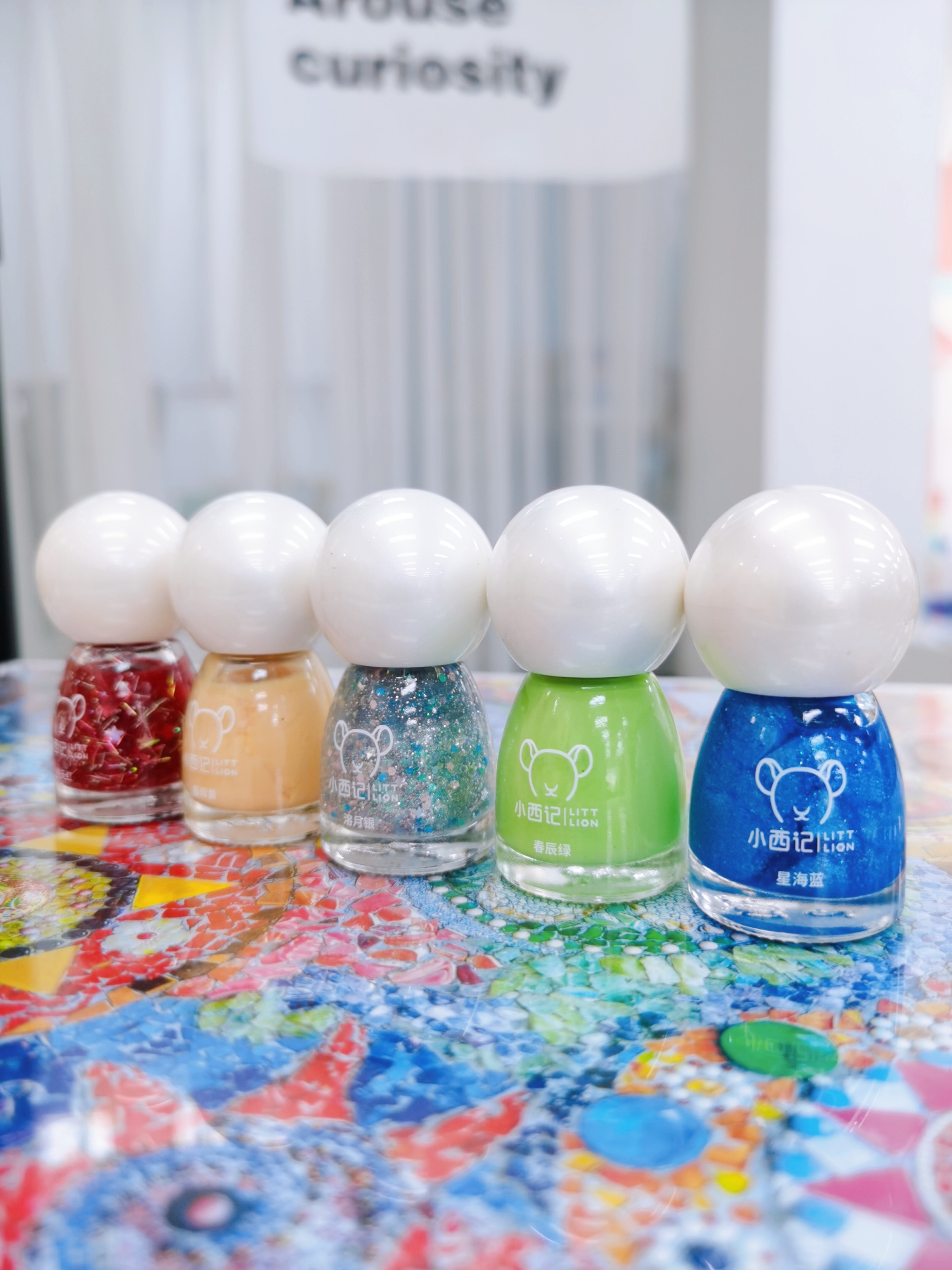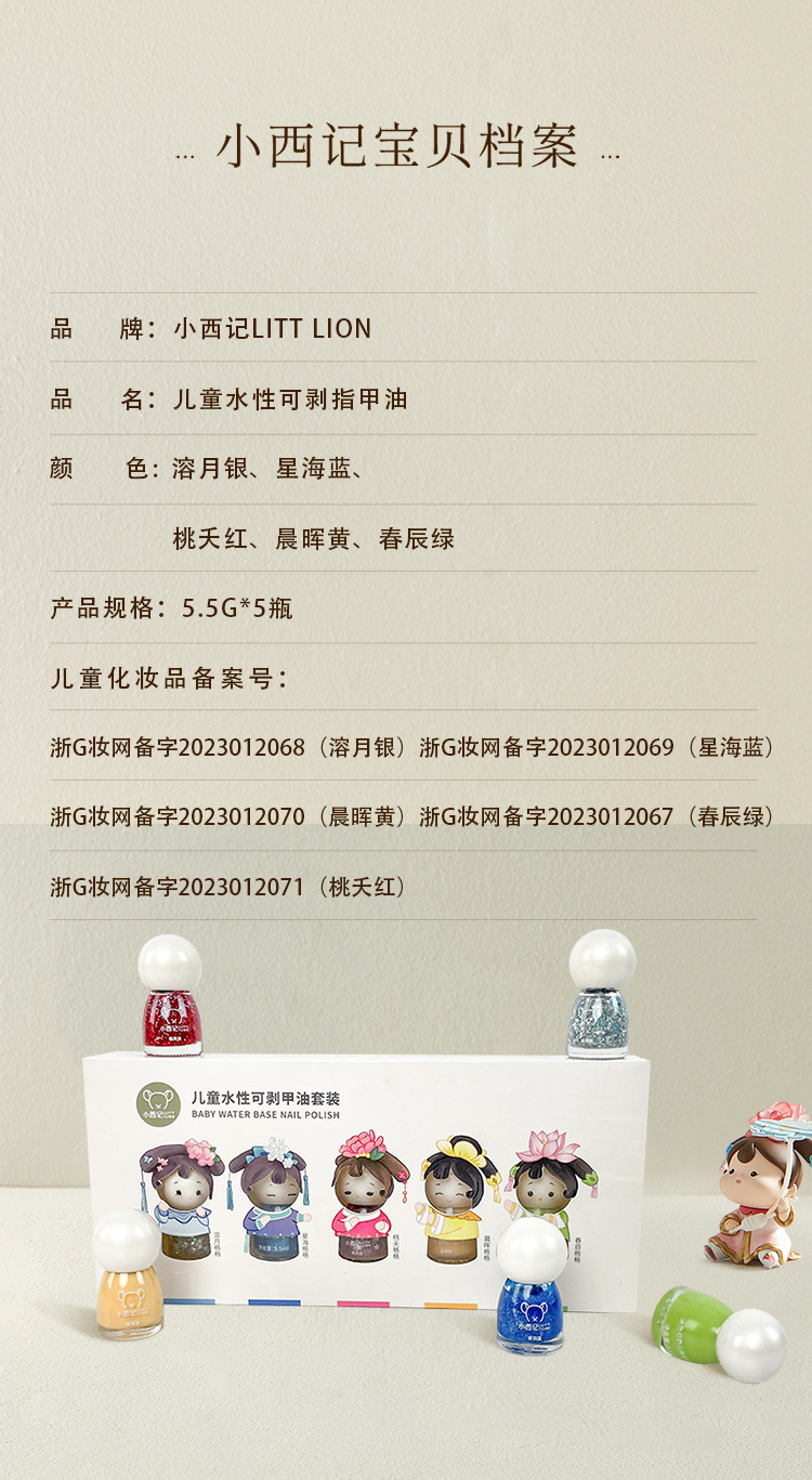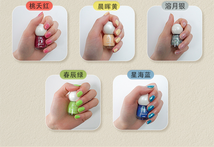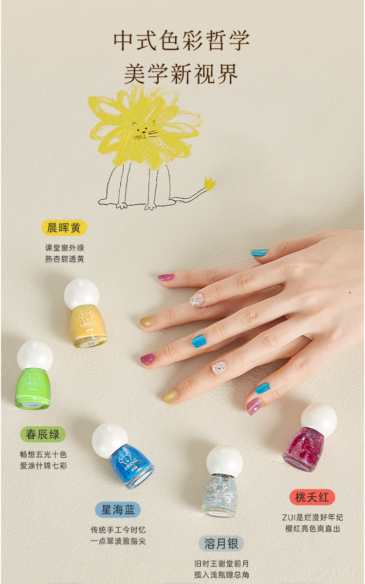 五款萌嘟嘟专利原创国潮角色 打造中国式可爱与美感🥰 桃夭红/晨晖黄/溶月银/春辰绿/星海蓝 颜色饱满馥郁,符合中国儿童化妆品认证🏆 质检报告也都齐全,可以放心用! 轻松易上手,宝贝爱不停 让宝宝在无忧无虑的年纪 刷涂流光溢彩的色 于指尖迸发灵感~发现天性~